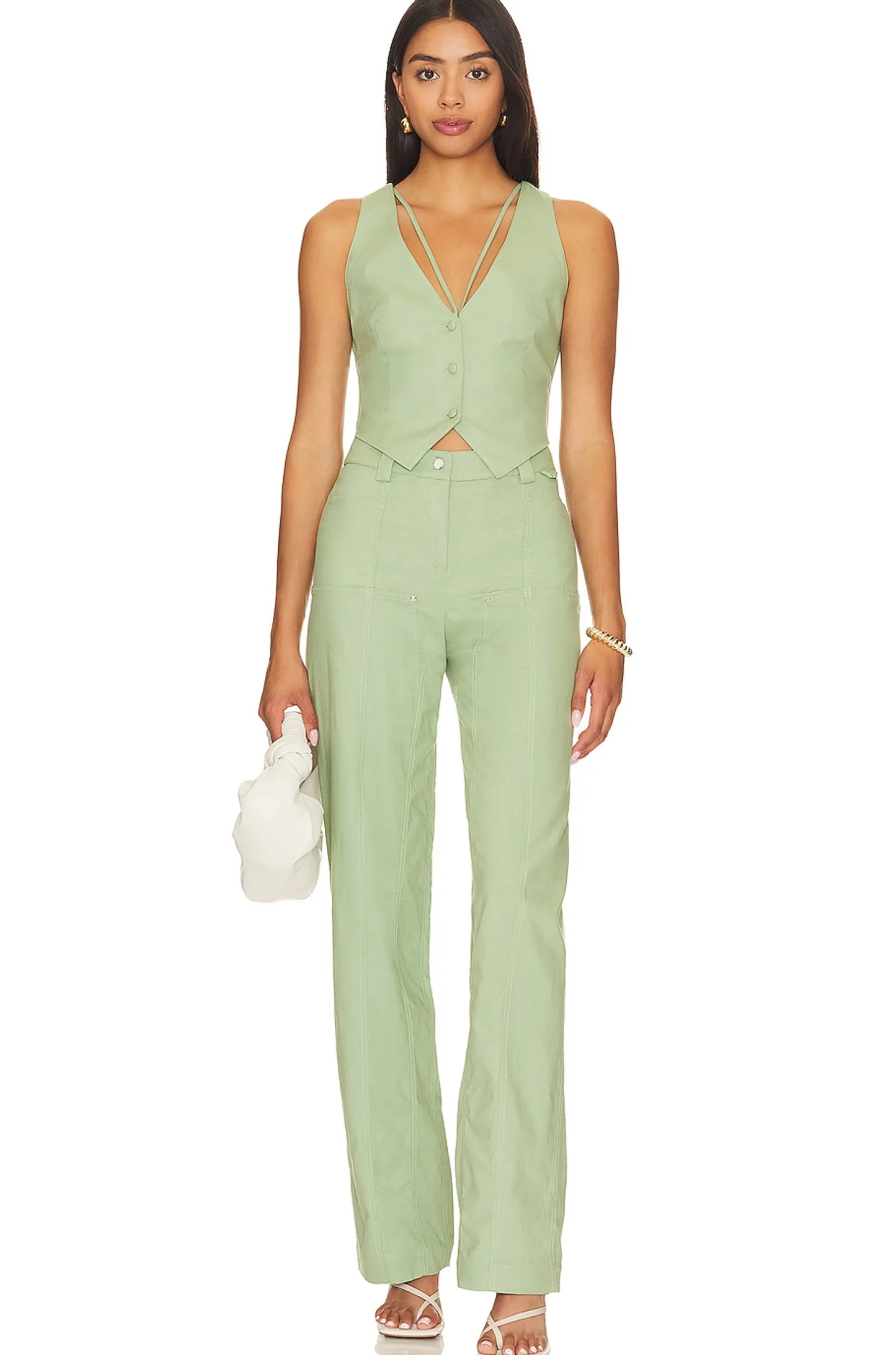 53% linen 44% viscose 3% spandex.Made in China.Hand wash.Zip fly with button closure.4-pocket styling.Midweight linen fabric.Item not sold as a set.20" at the knee narrows to 16" at the leg opening
