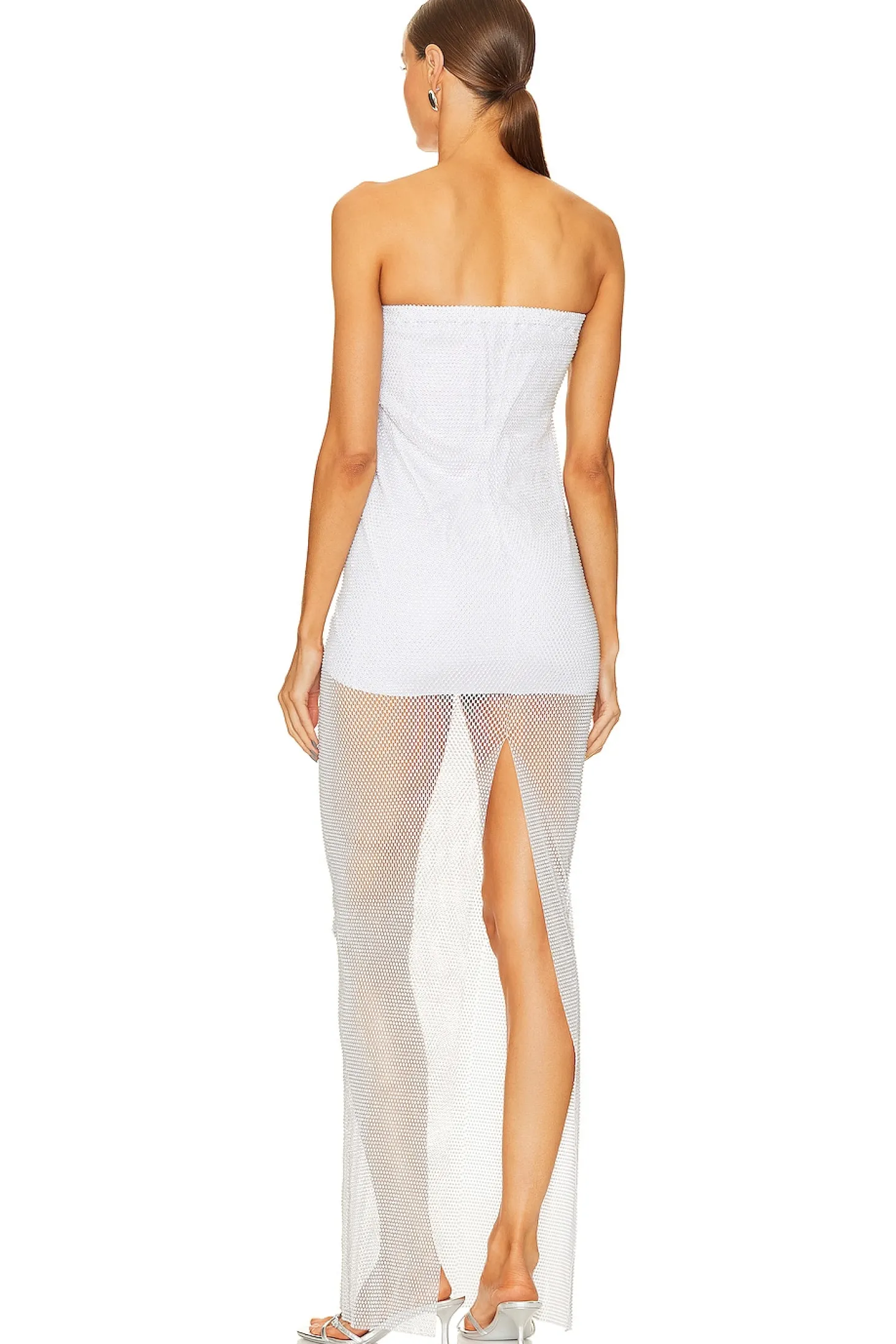50% rhinestones 30% polyester 20% cotton.Made in Ukraine.Dry clean only.Unlined.Pull-on styling with elastic neckline trim.Open knit fabric with rhinestone embellishments throughout with back vent.Neckline to hem measures approx 57" in length