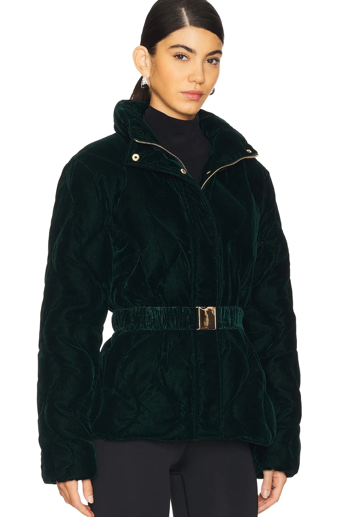 Self & Lining: 100% polyester Filling: 100% recycled polyester.Made in China.Hand wash.Front gold-tone zip with snap closure.Adjustable gold-tone waist buckle Attached hood.Front slant welt pockets Heavyweight faux fur fabric