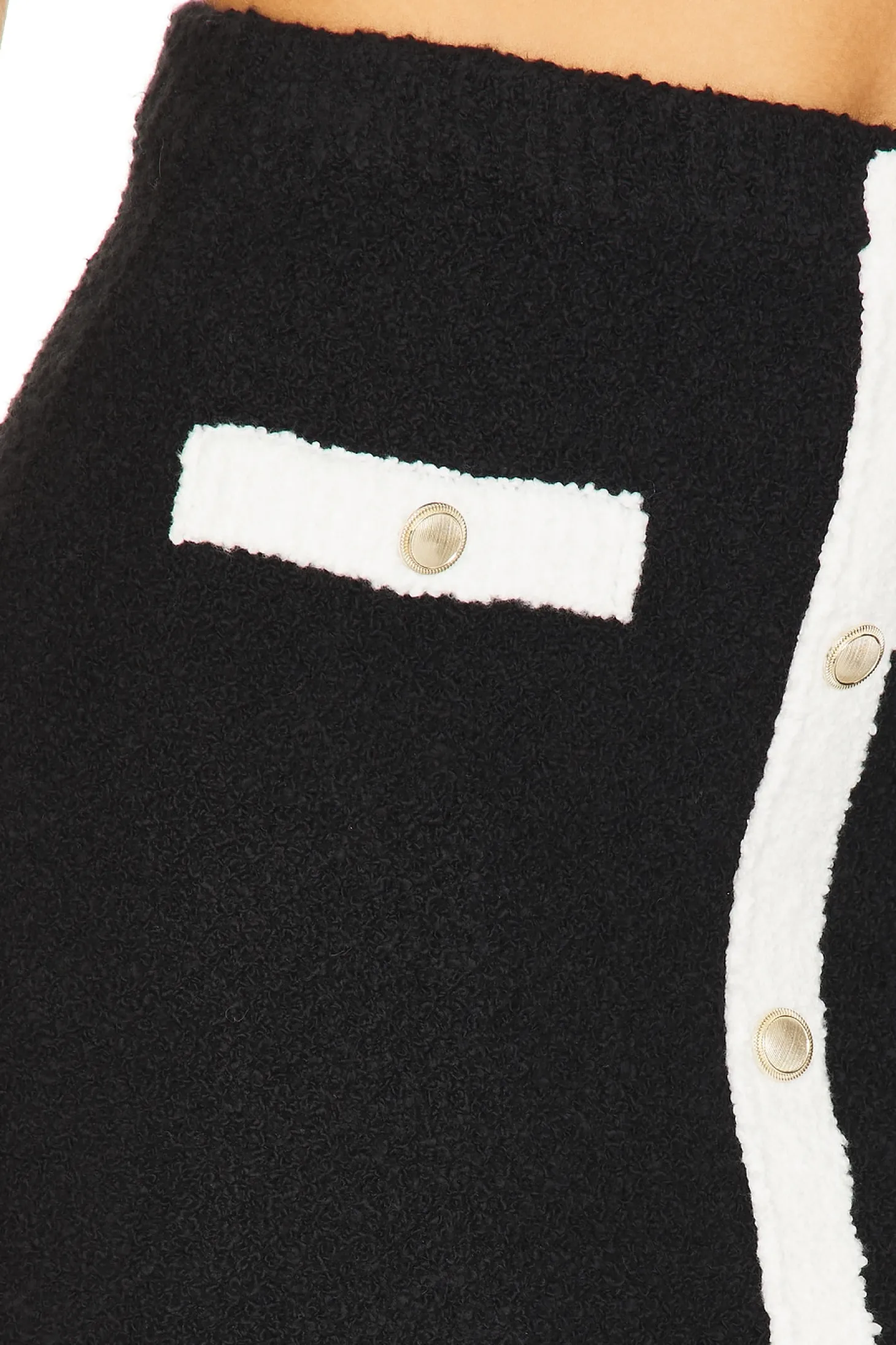 80% cotton 20% polyester.Made in China.Hand wash.Unlined.Pull-on styling.Elasticized waistband Faux gold-tone button pockets.Midweight knit fabric Item not sold as a set.Skirt measures approx 14" in length