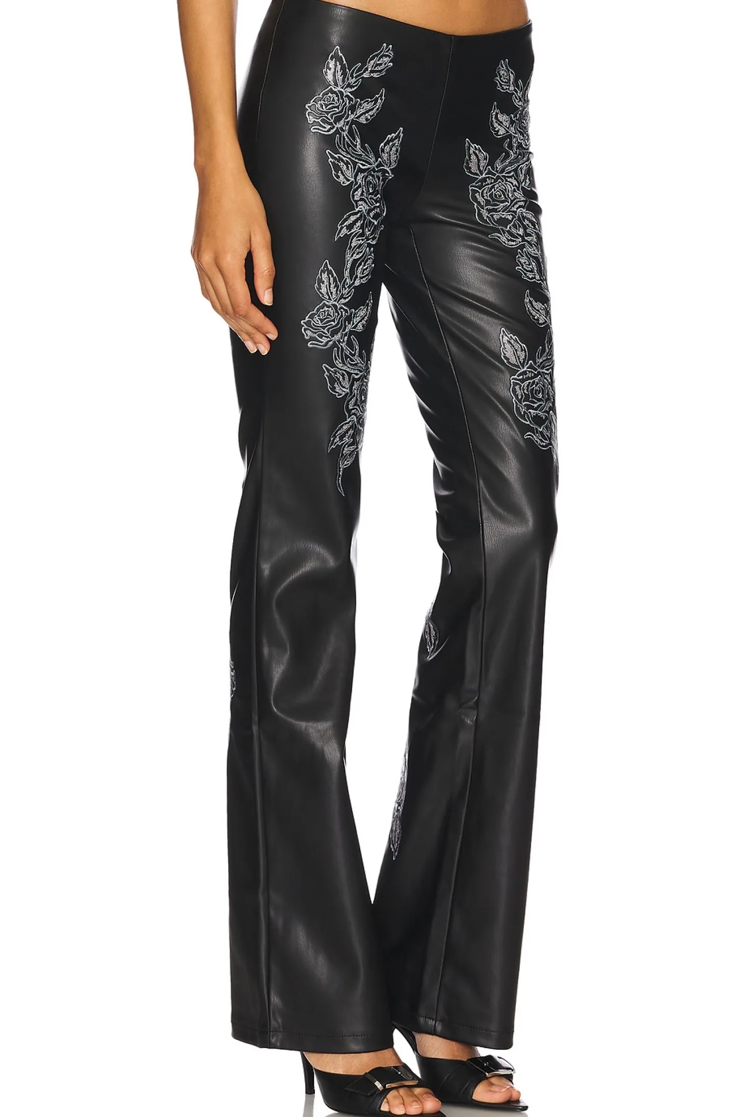 Self 1: 100% polyurethane Self 2: 100% polyester.Made in China.Hand wash.Hidden side zipper closure.Faux leather with embroidered floral details.Item not sold as set.15" at the knee breaks to 19" at the leg opening