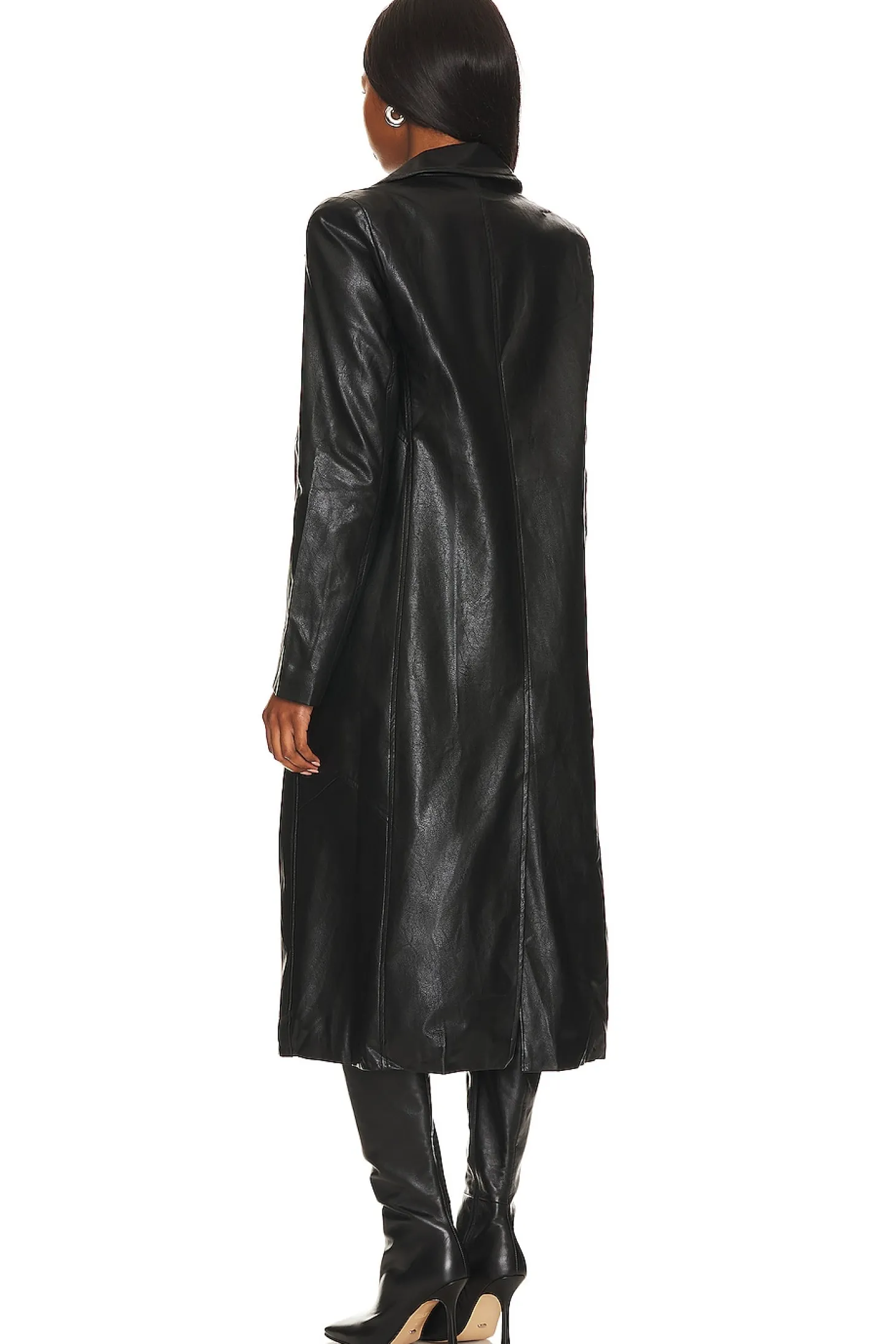 Self: 55% cotton 45% polyurethane Lining: 97% polyester 3% elastane.Made in China.Machine wash.Open front styling.Padded shoulders.Side seam pockets.Faux leather fabric with back slit