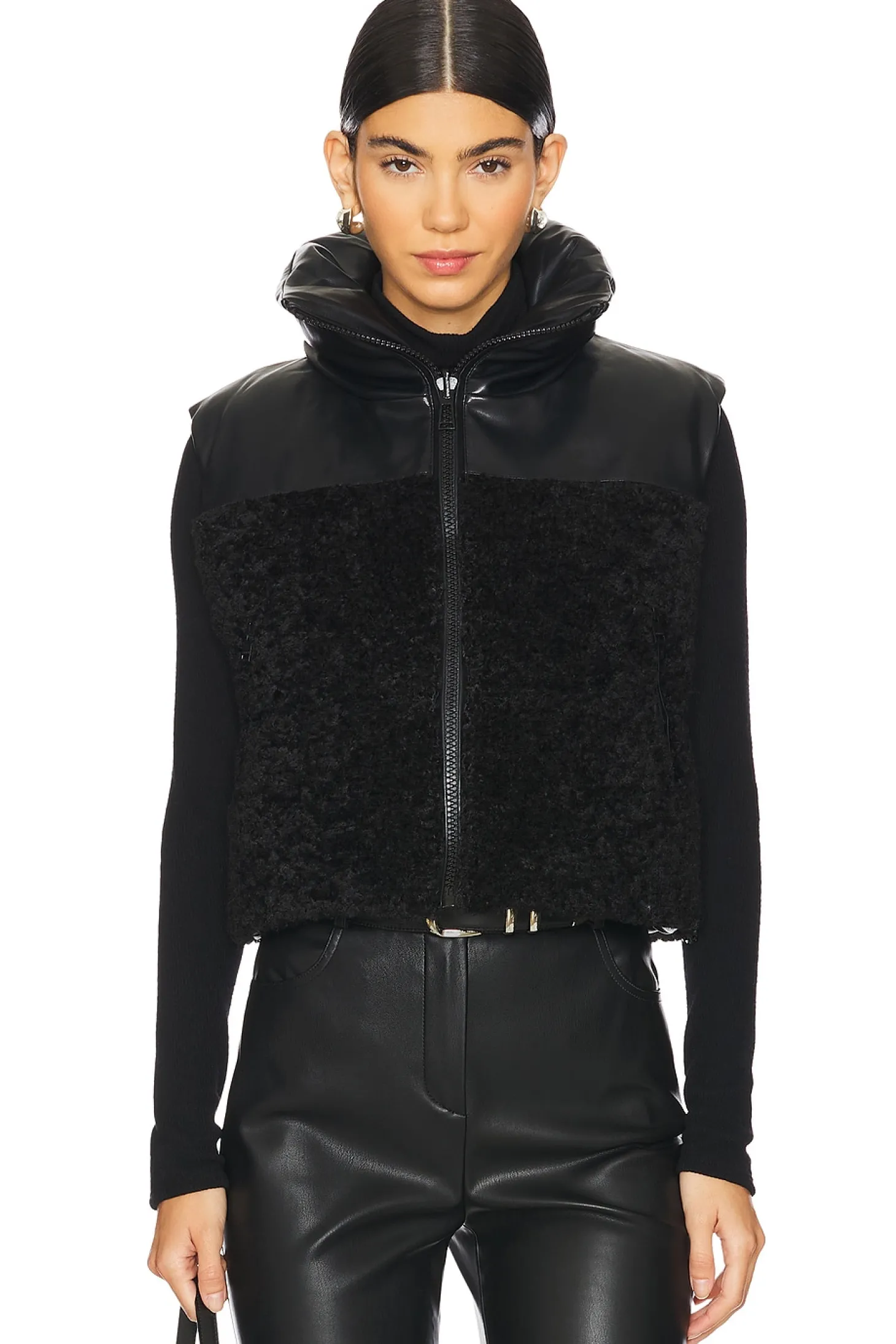 Self 1: 100% polyurethane Self 2 & Filling: 100% polyester.Made in China.Dry clean only.Front zip closure.Front zip pockets Elasticized drawcord hem.Heavyweight faux fur and faux leather fabric