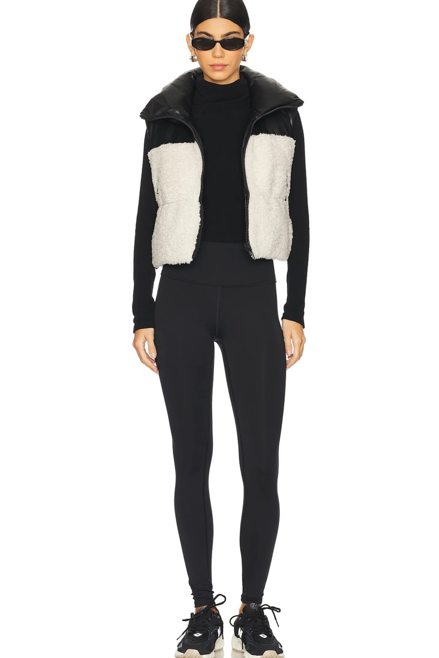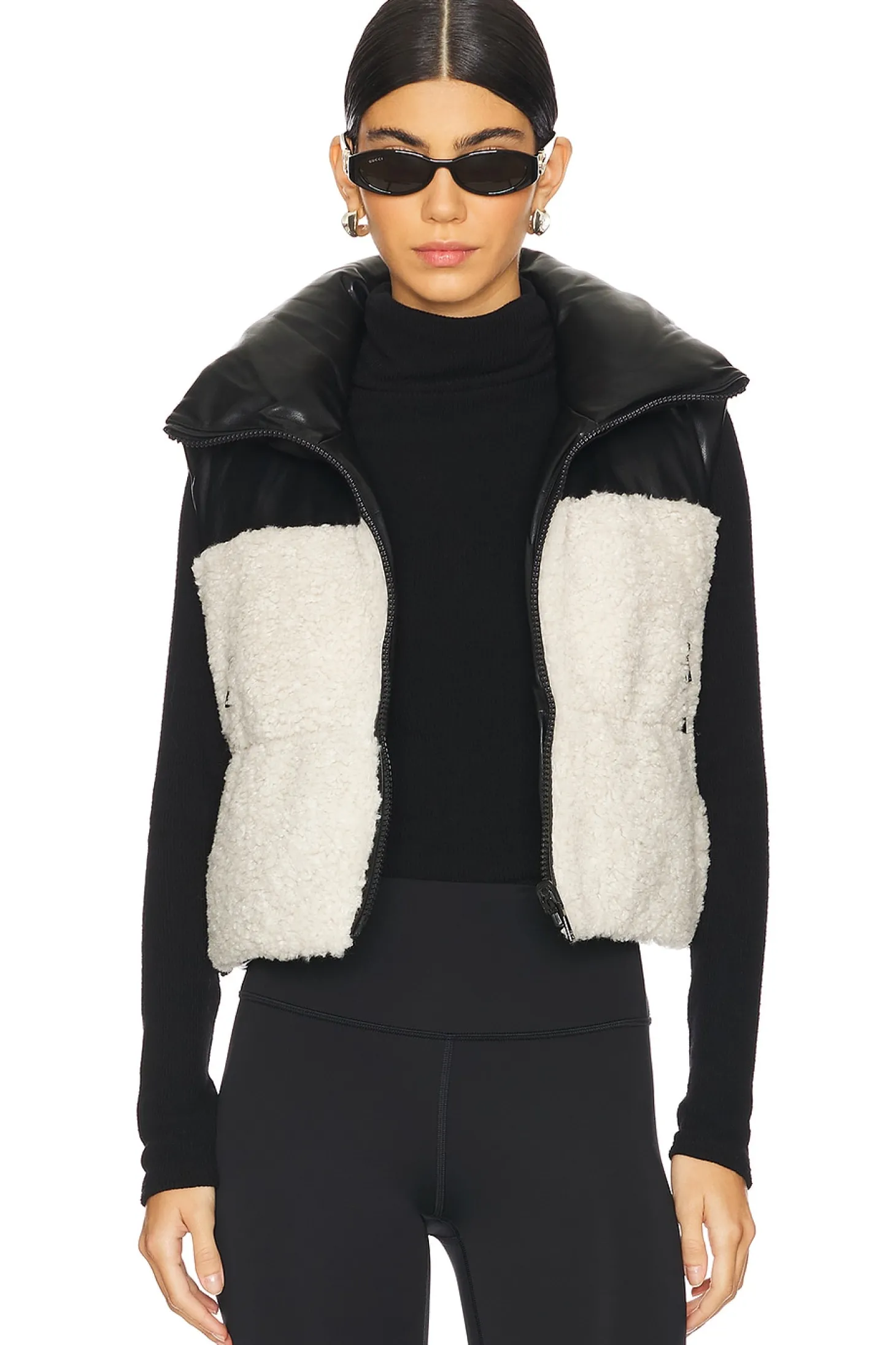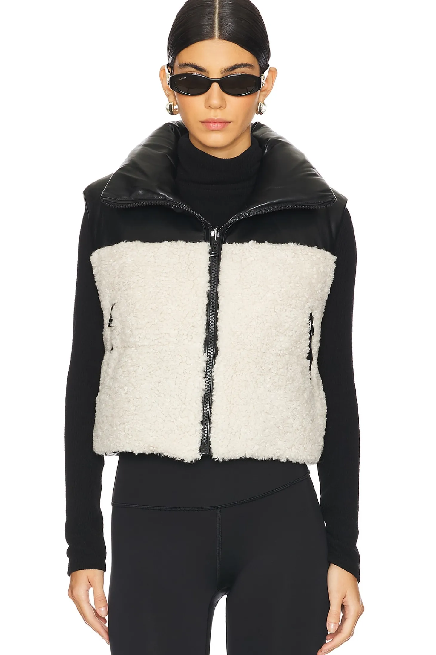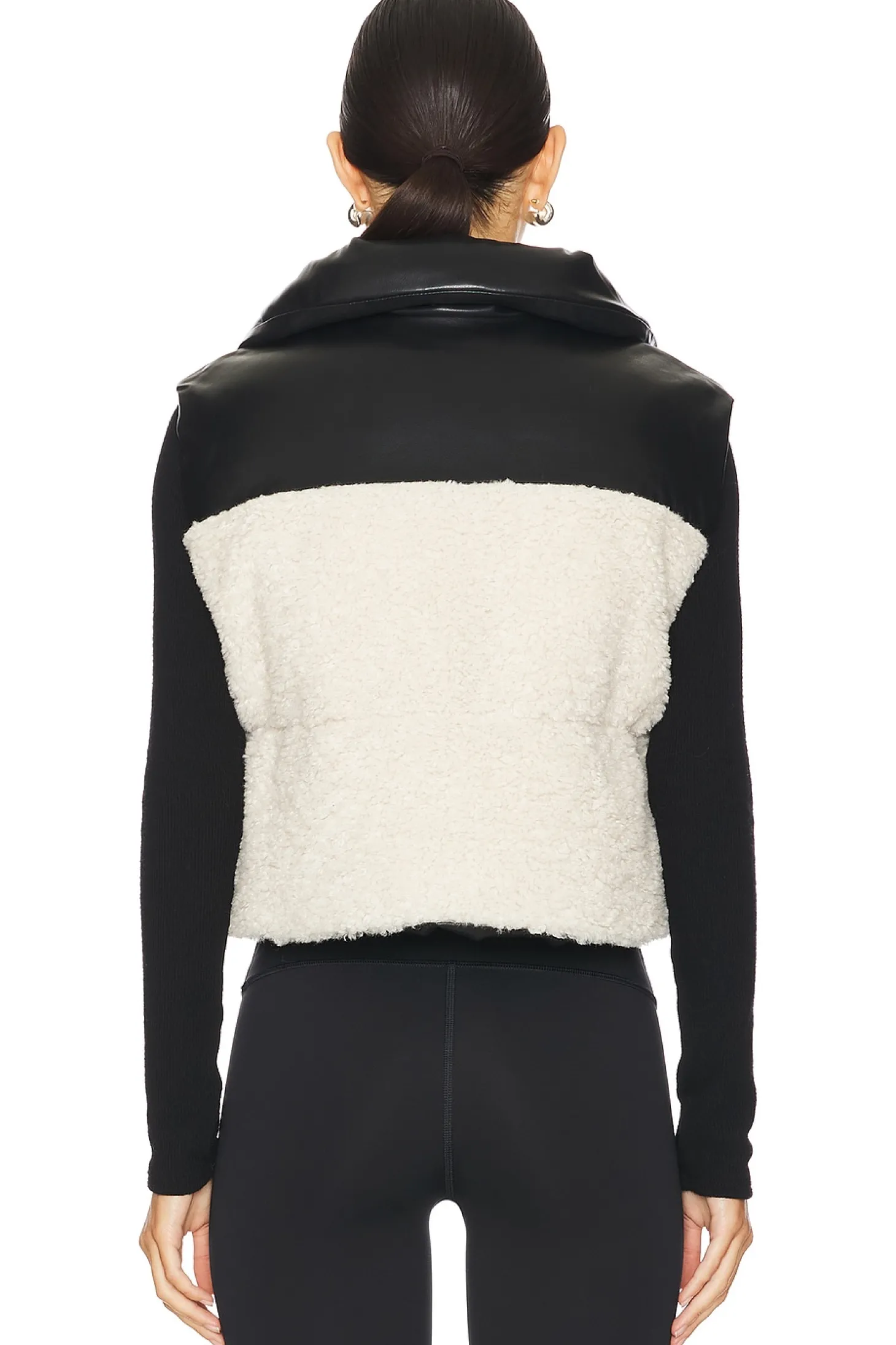 Self: 100% polyurethane Self 2: polyester.Made in China.Dry clean only.Front zipper closure.Side slant zipper pockets.Pull-cord hem.Reversible styling.Faux fur and faux leather fabric