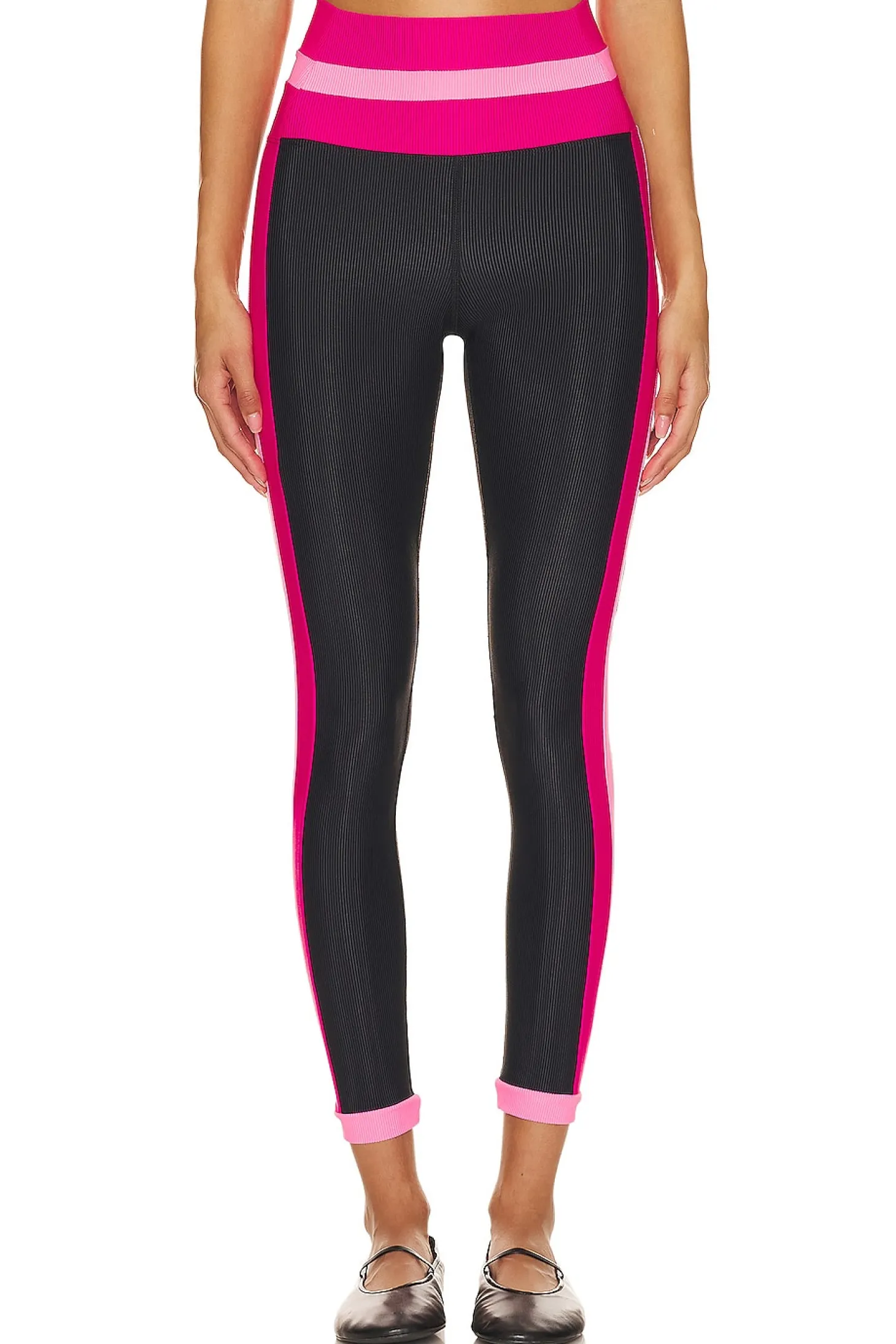 82% polyester 18% spandex.Made in China.Machine wash recommended.Elastic waistband.Double layer waist.Colorblock striping at waist, sides, and cuffs.Item not sold as a set