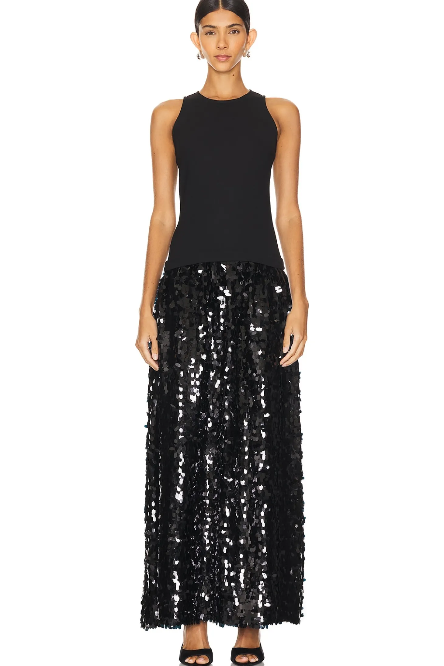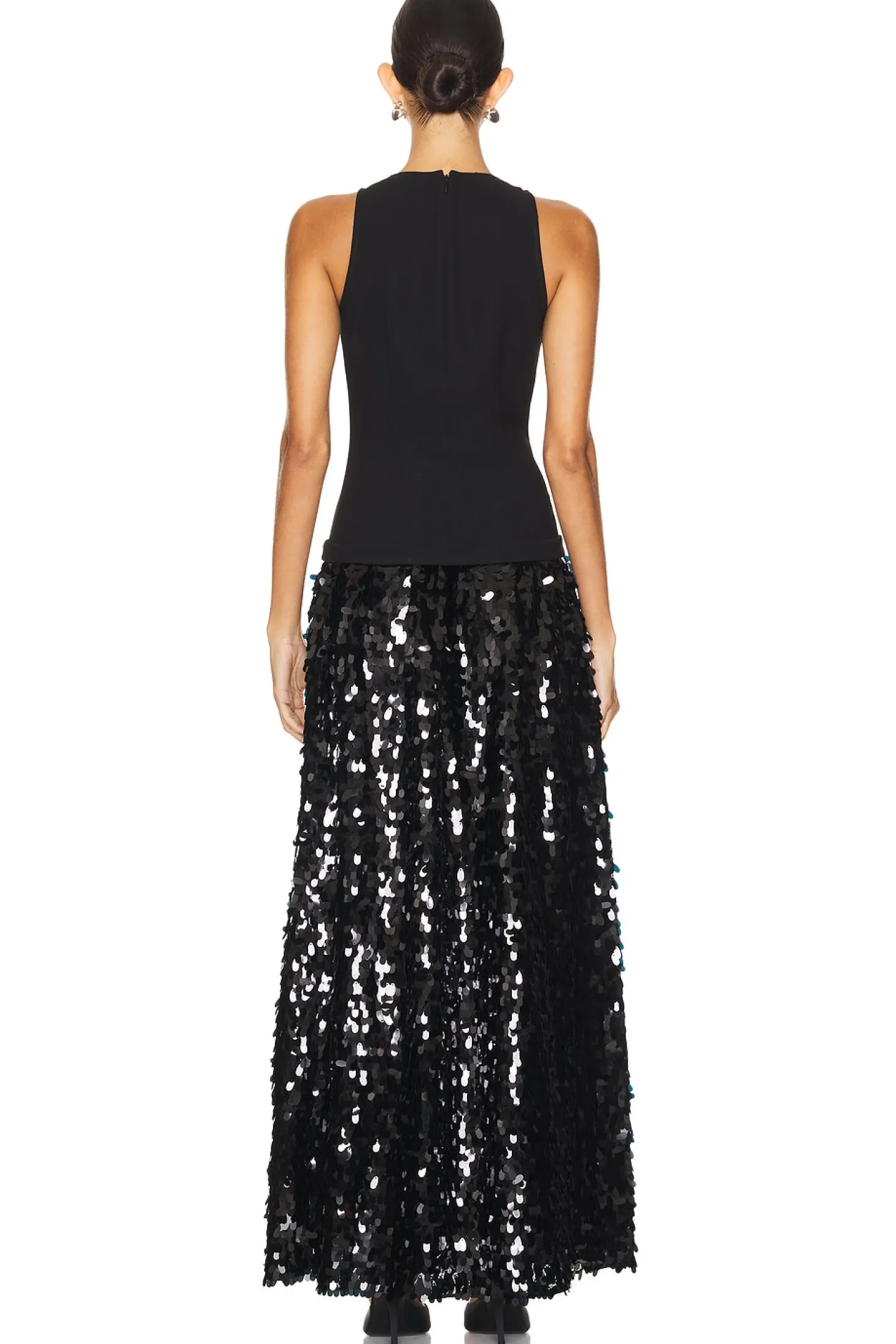 100% polyester.Made in China.Spot clean only.Fully lined.Hidden back zipper closure.Crepe bodice with sequin embellished skirt