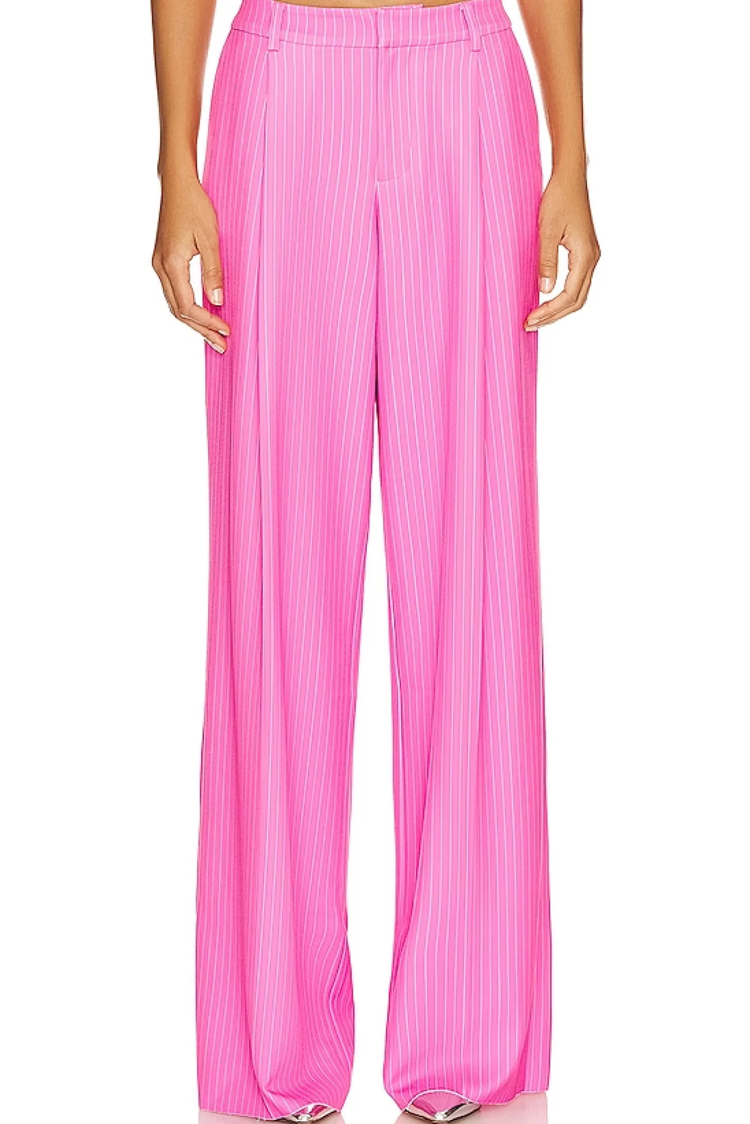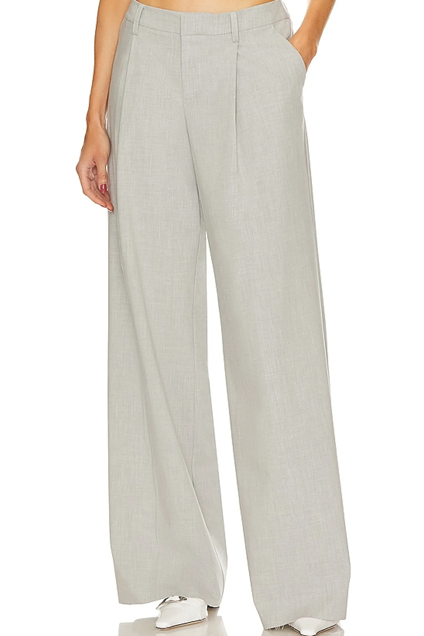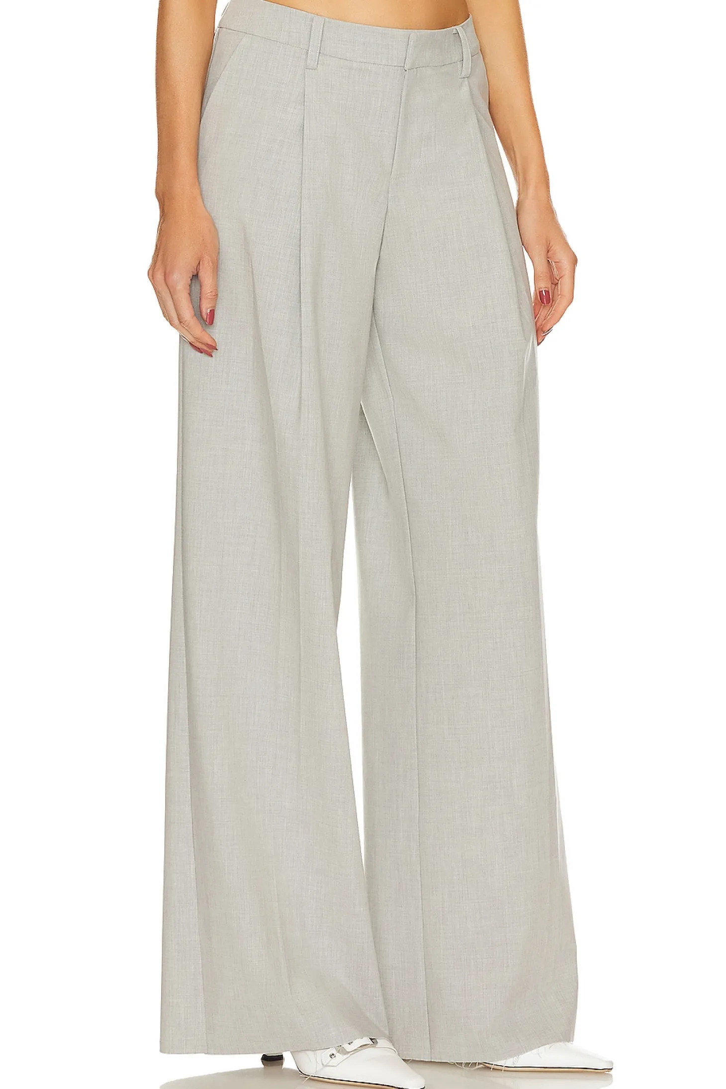 Self: 57% polyester 29% rayon 10% wool 4% spandex Lining: 55% polyester 45% viscose.Made in China.Dry clean only.Zip fly with hook and bar closure.Side slant pockets.Pleated suiting fabric with frayed raw-cut hem.22" at the knee and 22" at the leg opening