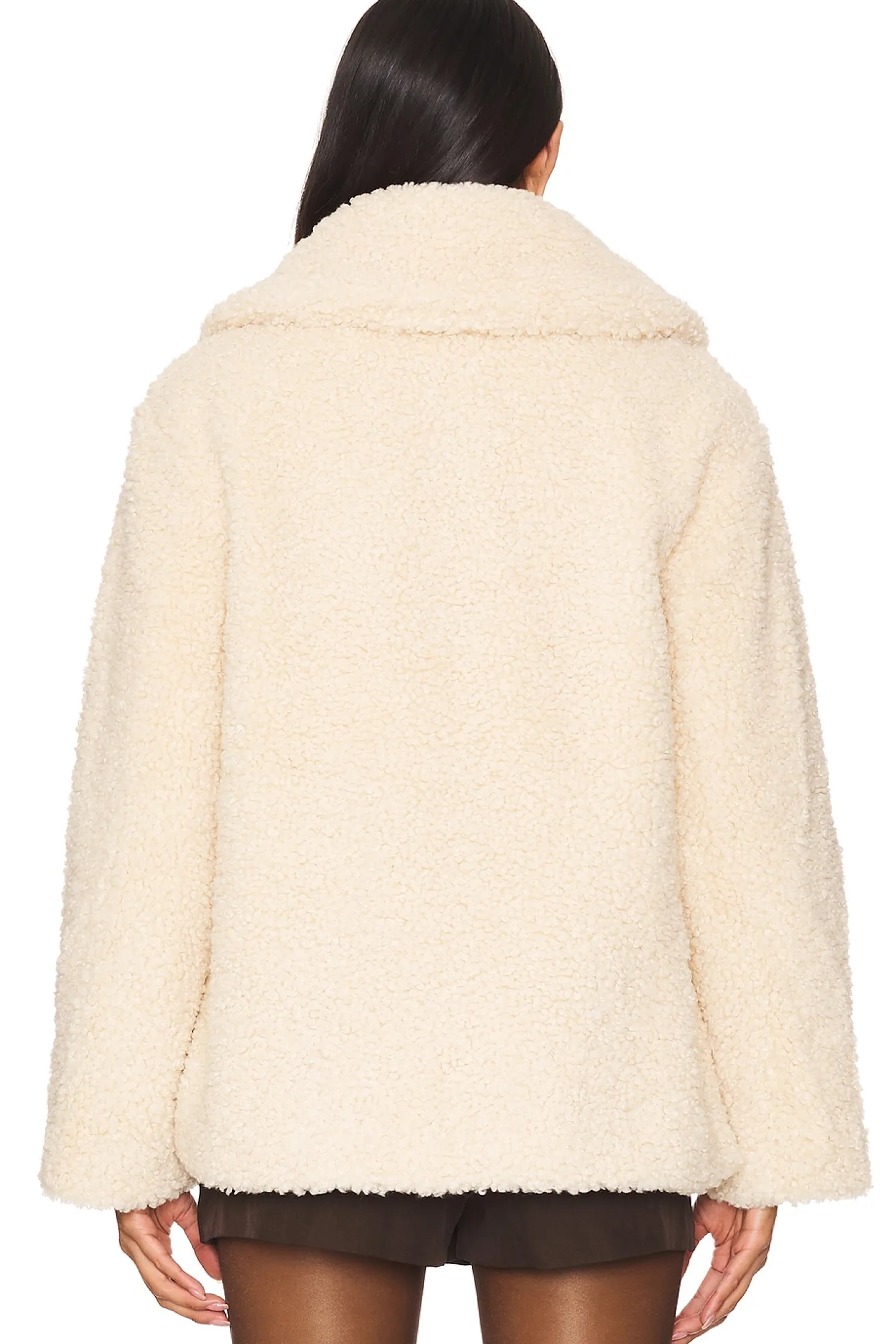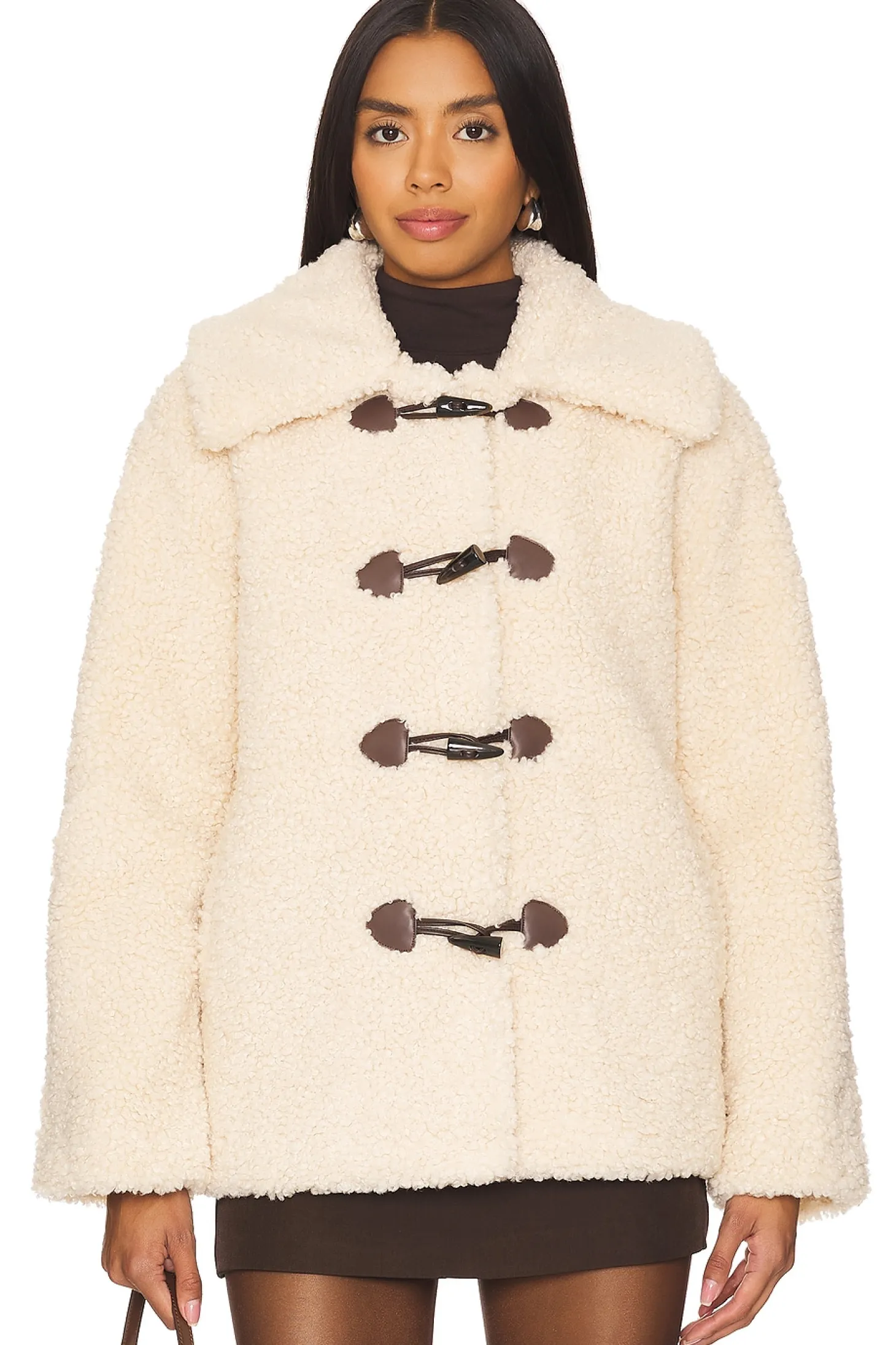 Self & Lining: 100% polyester.Made in China.Dry clean only.Front toggle closure.Side seam pockets.Sherpa fabric