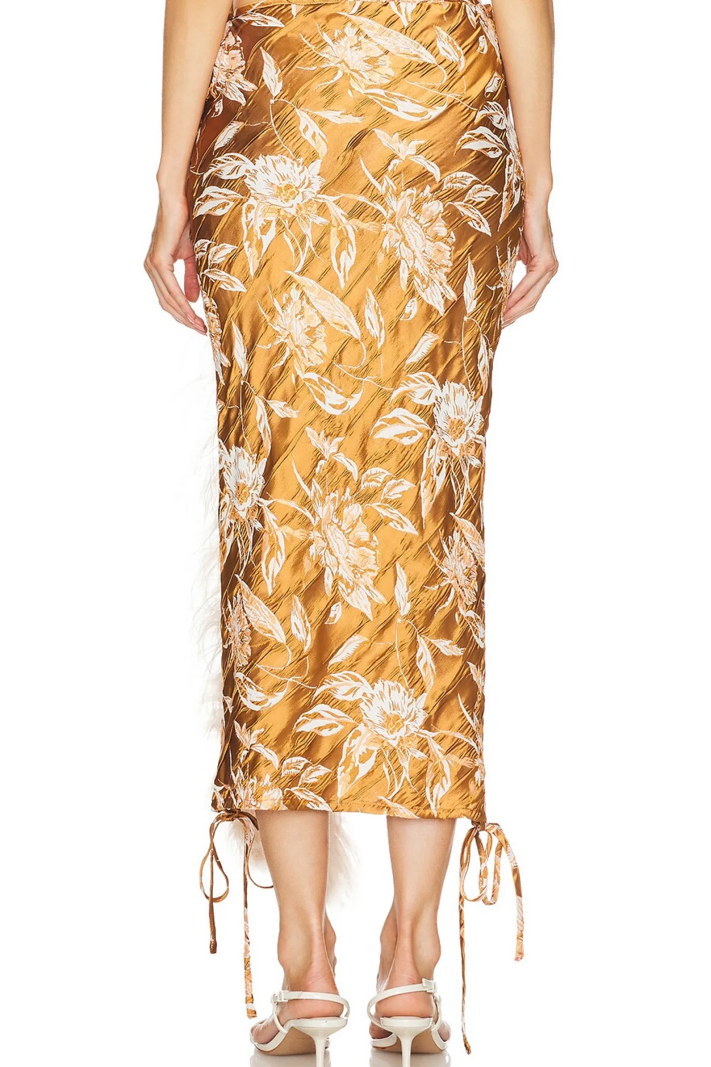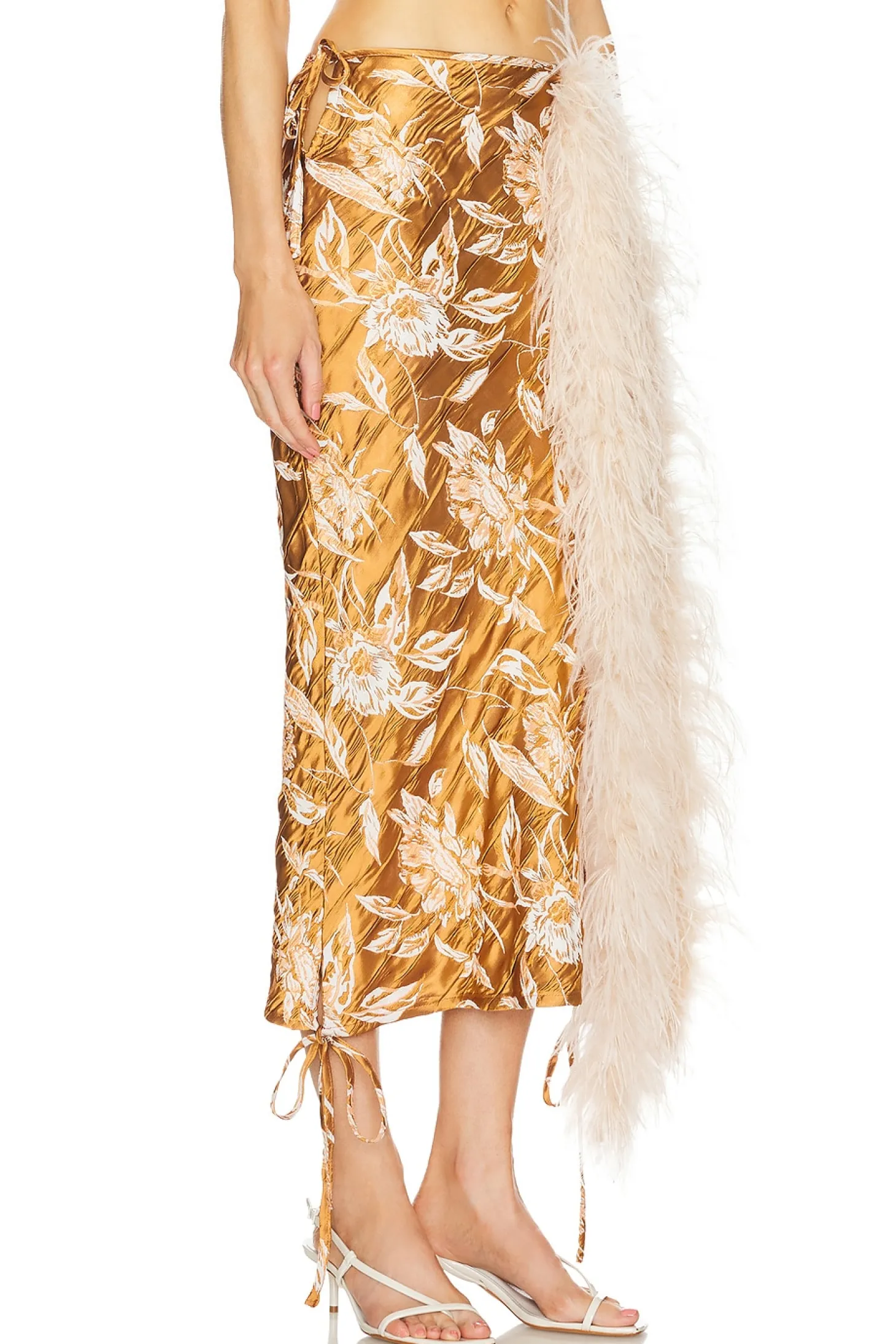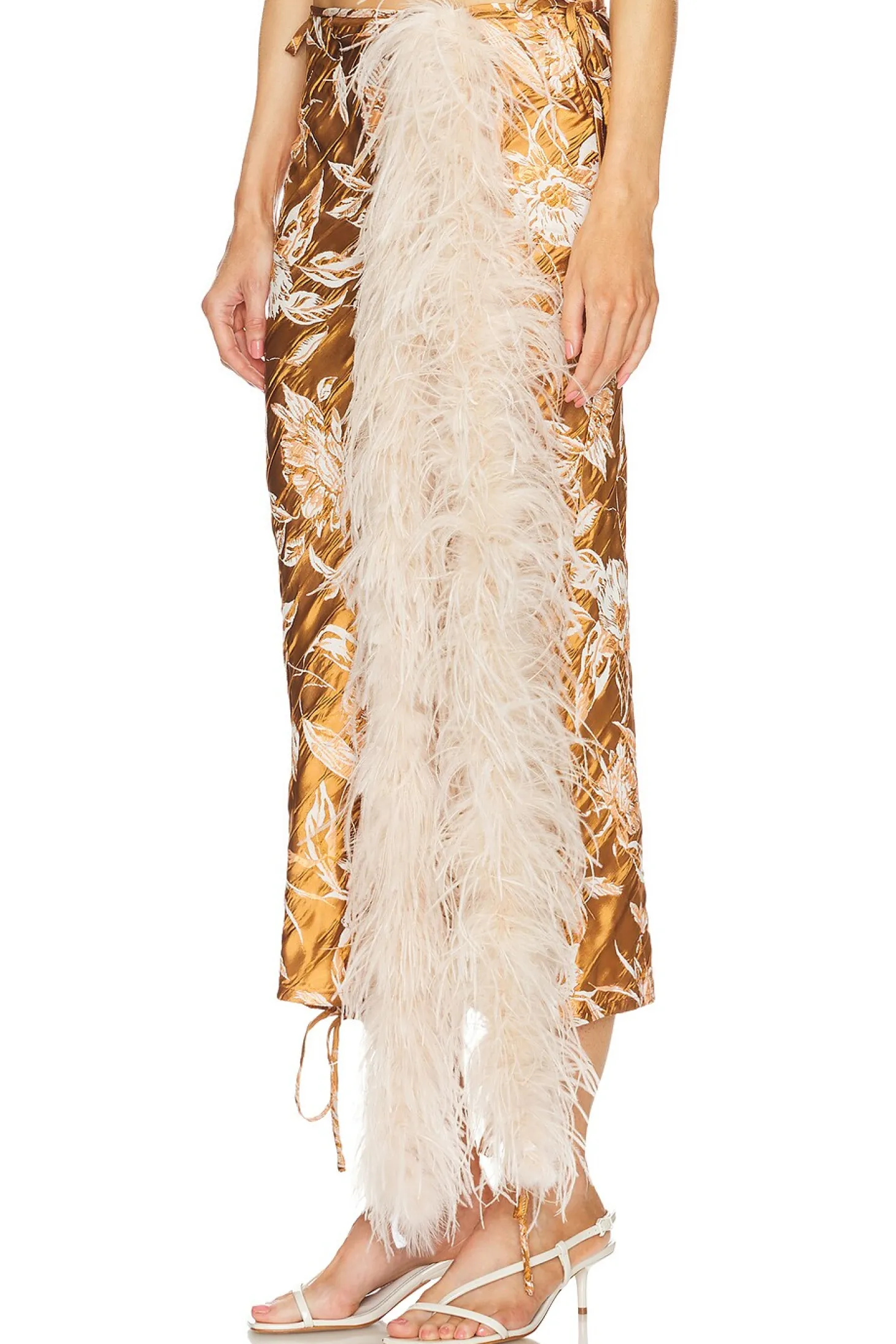 44% acetate 33% viscose 22% polyester 1% elastane.Made in Greece.Dry clean only.Unlined.Adjustable tie at waist and hem.Satin jacquard fabric with feather trim.Item not sold as a set.Skirt measures approx 33" in length
