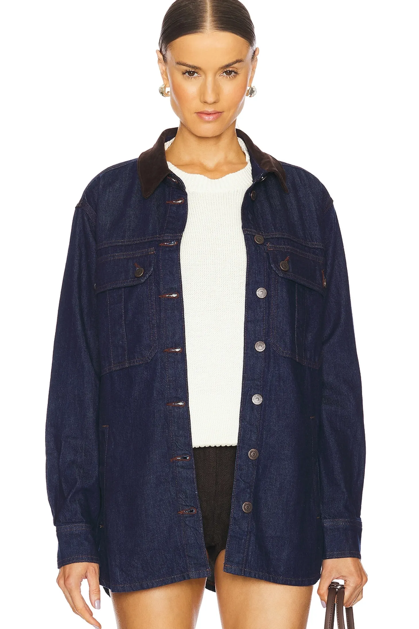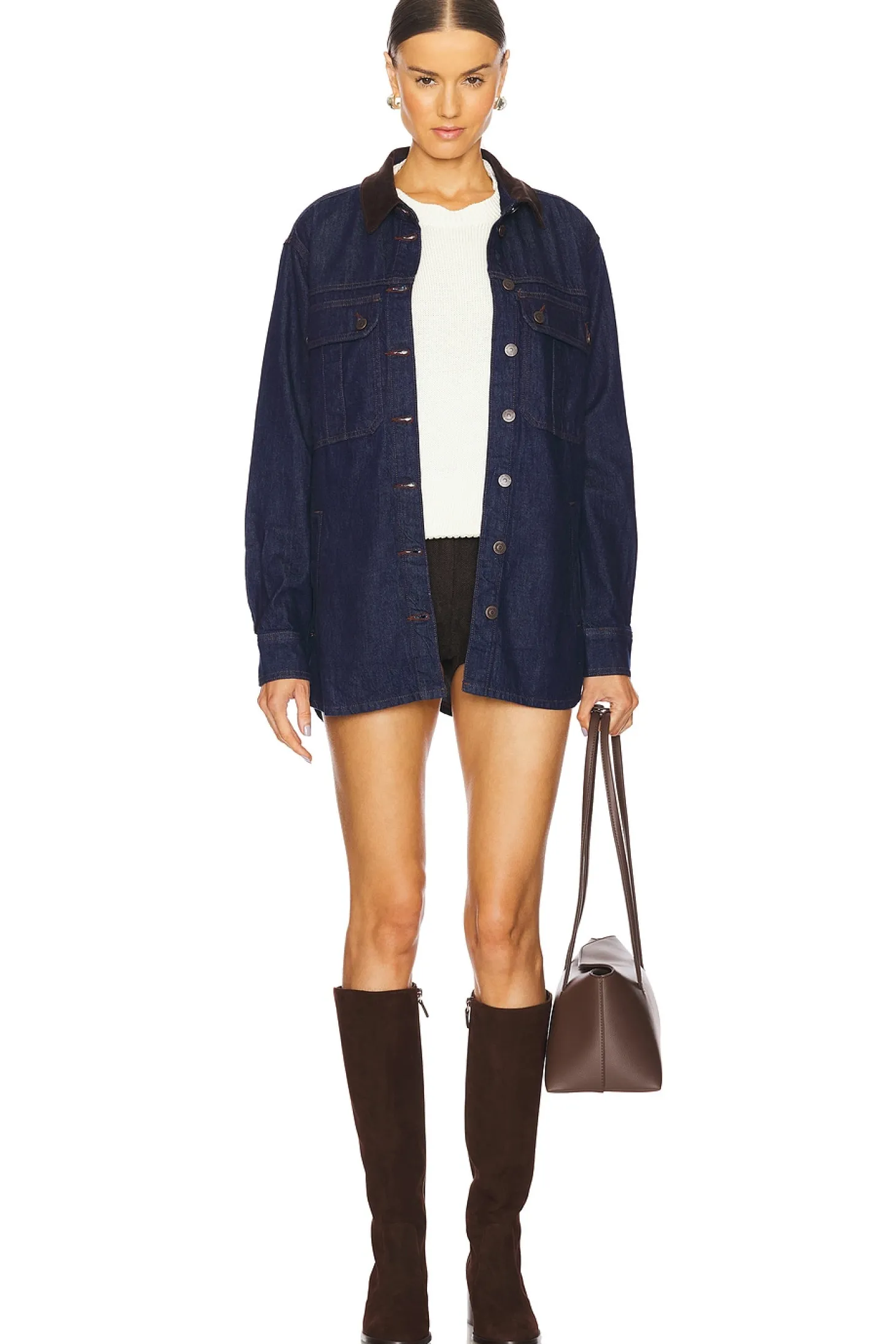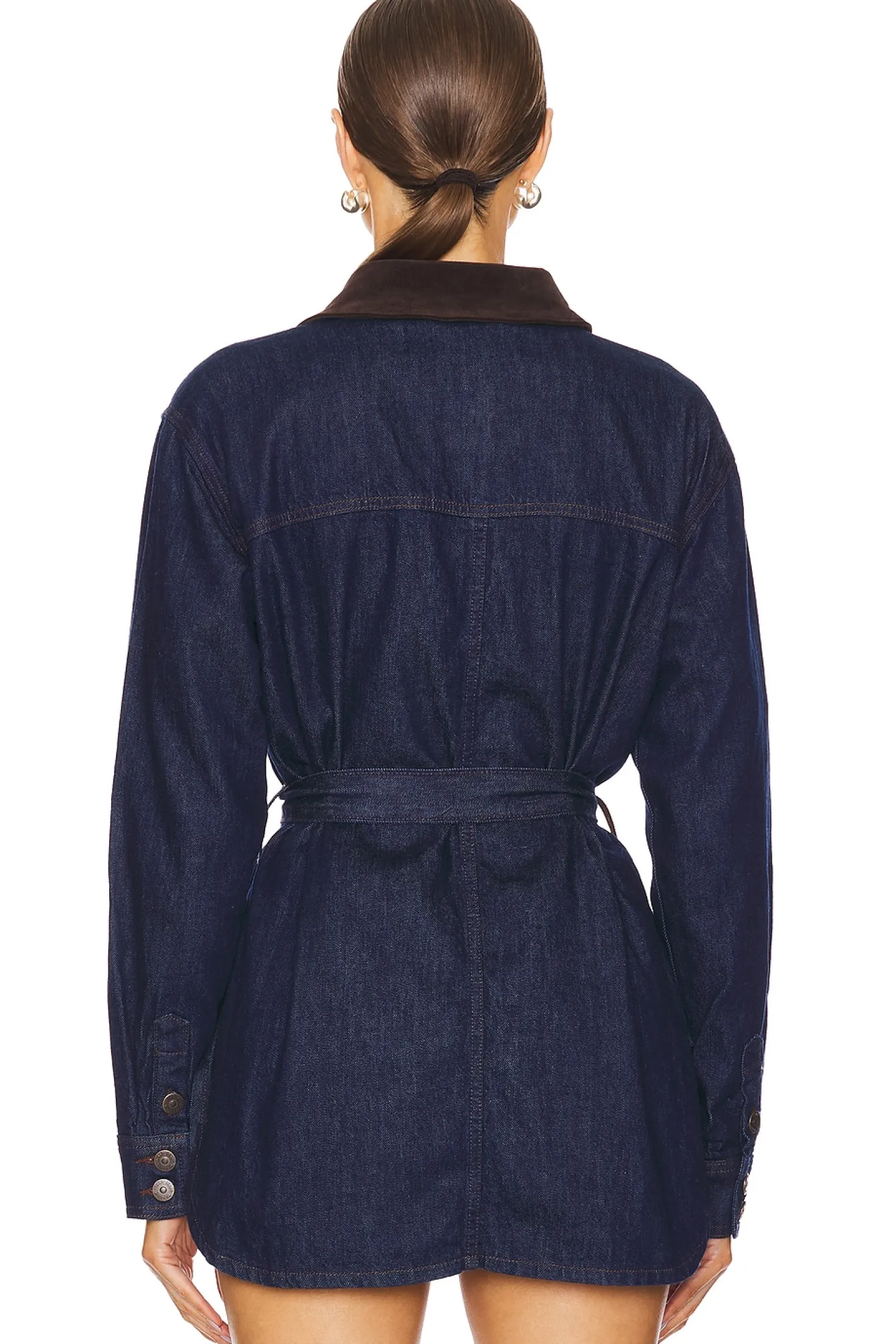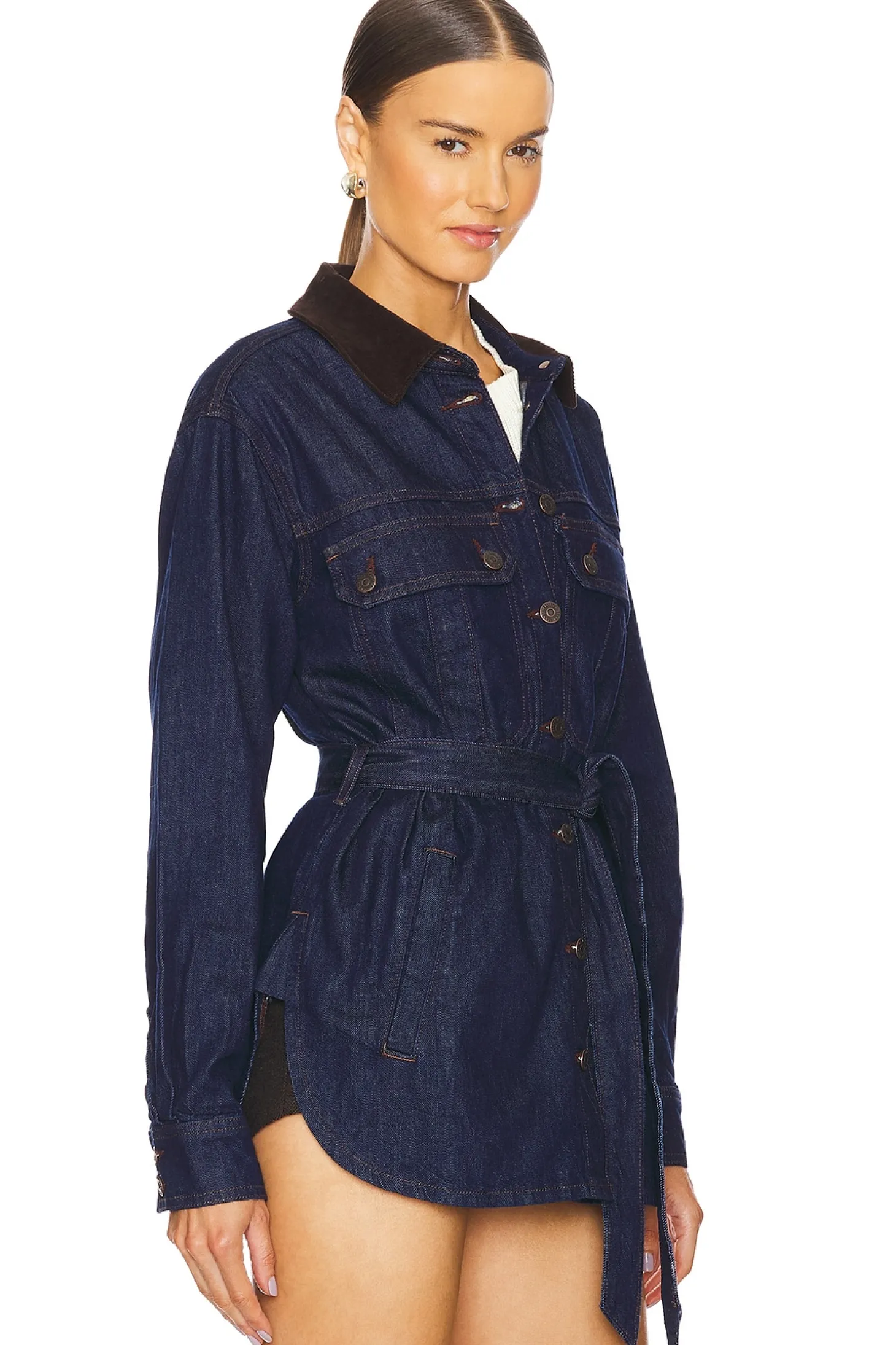 100% cotton.Made in USA.Machine wash.Button down closure.Slant pocket styling Dual buttoned breast pockets.Detachable waist-tie.Corduroy fabric at collar