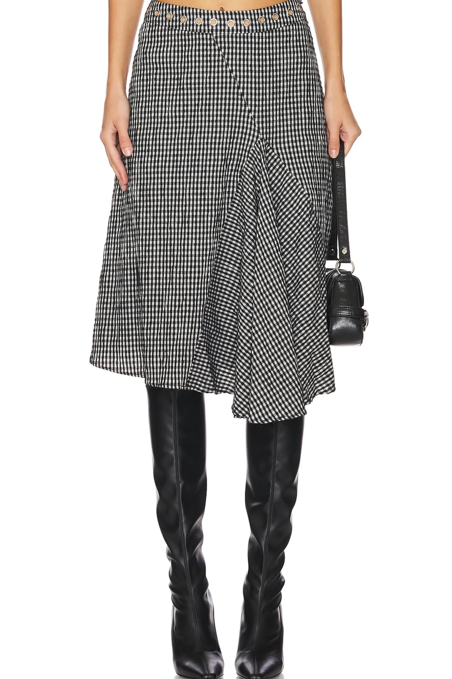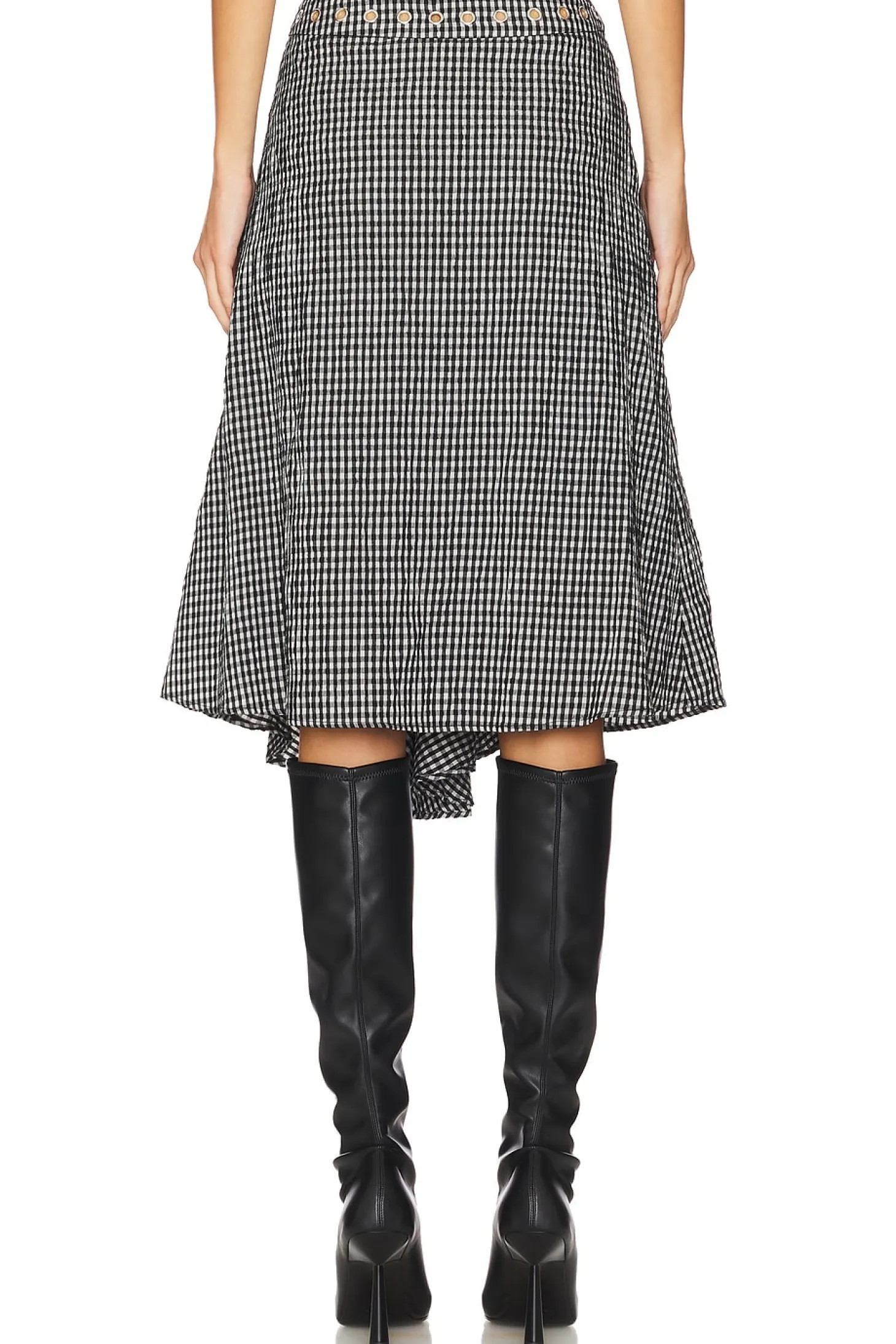 Self: 60% cotton 38% polyester 2% spandex Lining: 79% tencel 21% modal.Made in China.Dry clean only.Fully lined.Hidden side zipper closure.Grommet accent at waist.Seersucker fabric with fishtail design at front Item not sold as a set.Waist to shortest hem measures approx 25" and to longest hem approx 28" in length