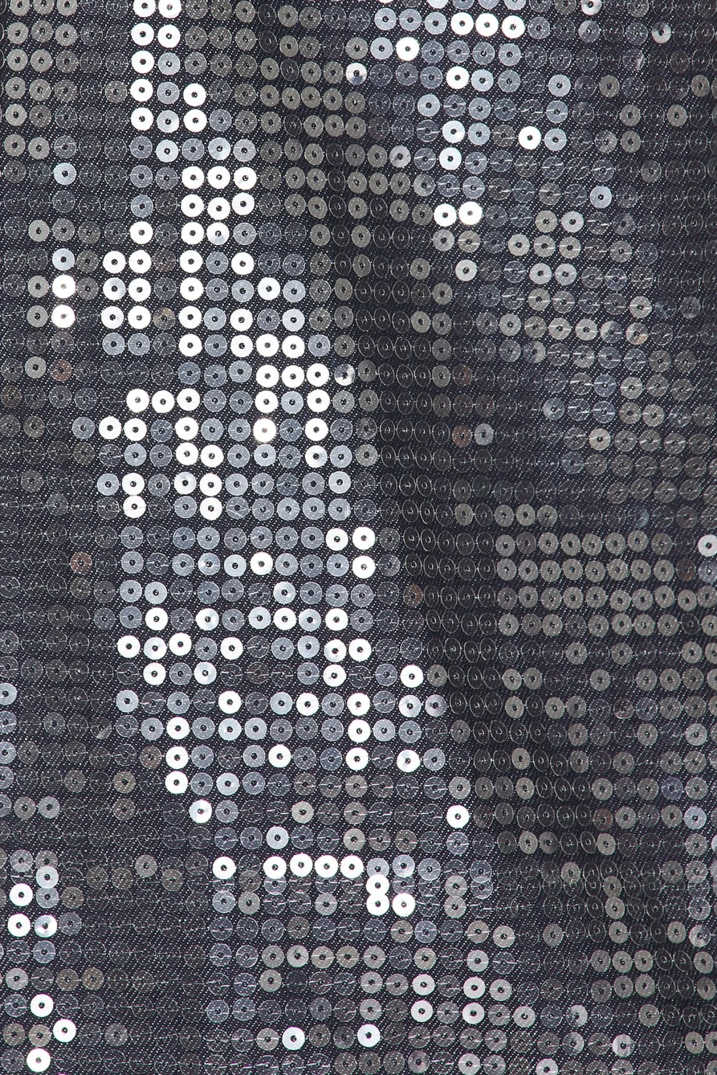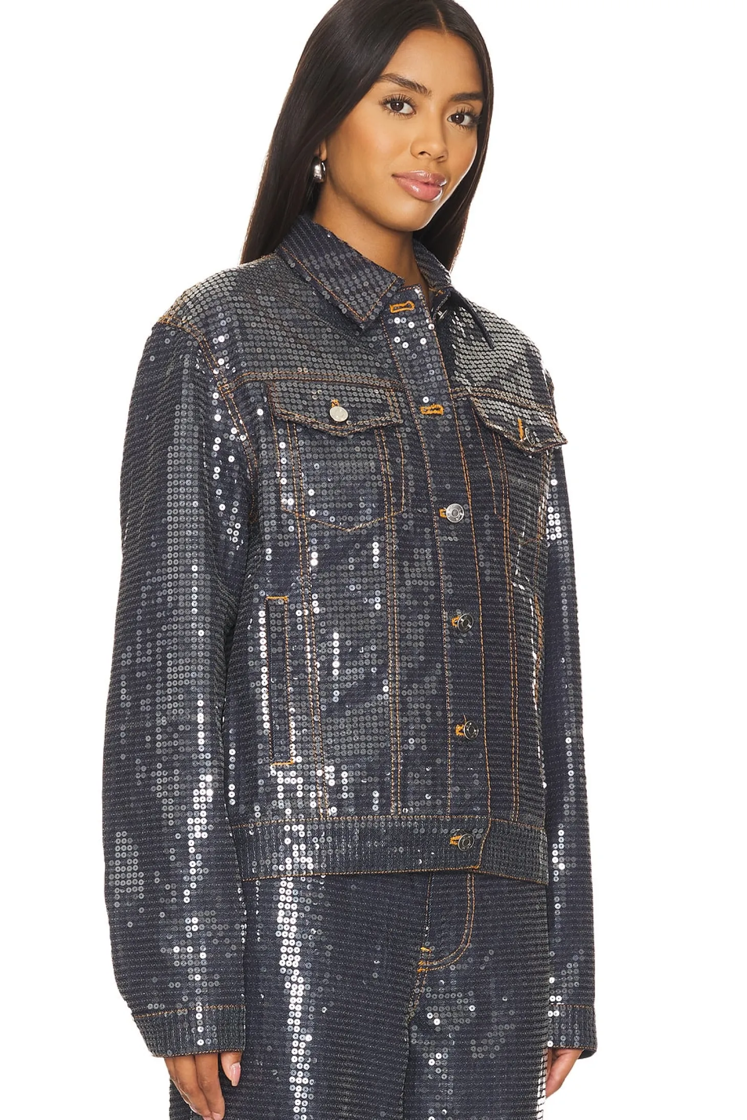 Denim textile.Imported.Dry clean recommended.Front button closure.Breast button pockets.Sequined denim