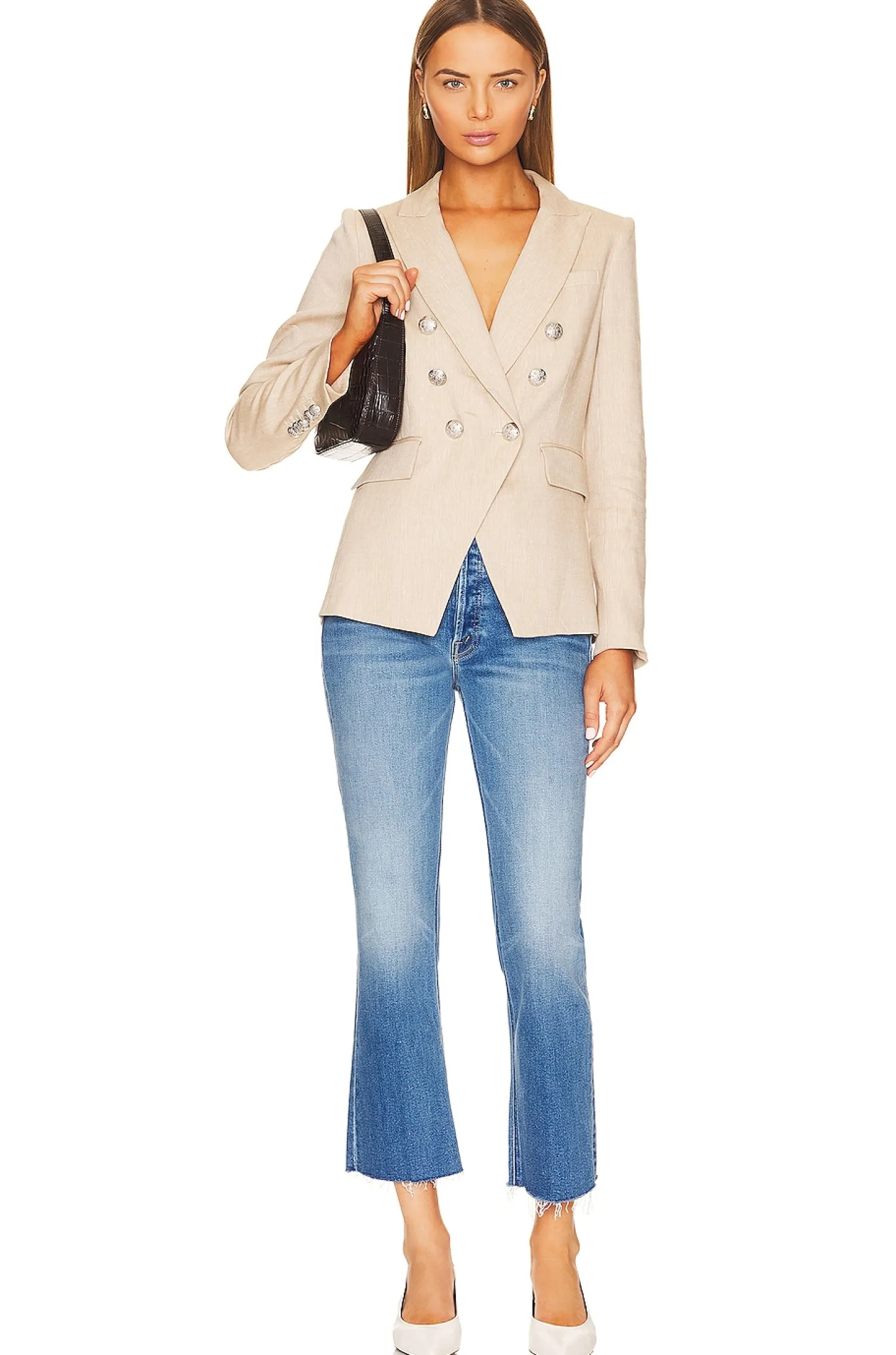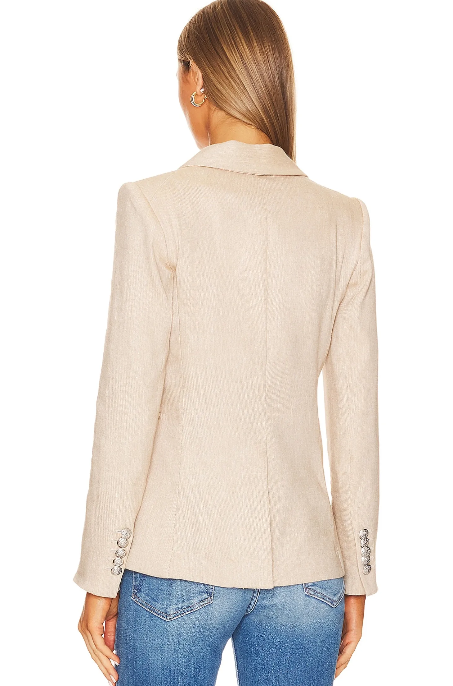 58% linen 27% polyester 14% viscose 1% elastane Lining: 96% polyester 4% spandex.Made in USA.Dry clean only .Double-breasted front button closure.Faux front flap pockets.Back vent.Linen fabric