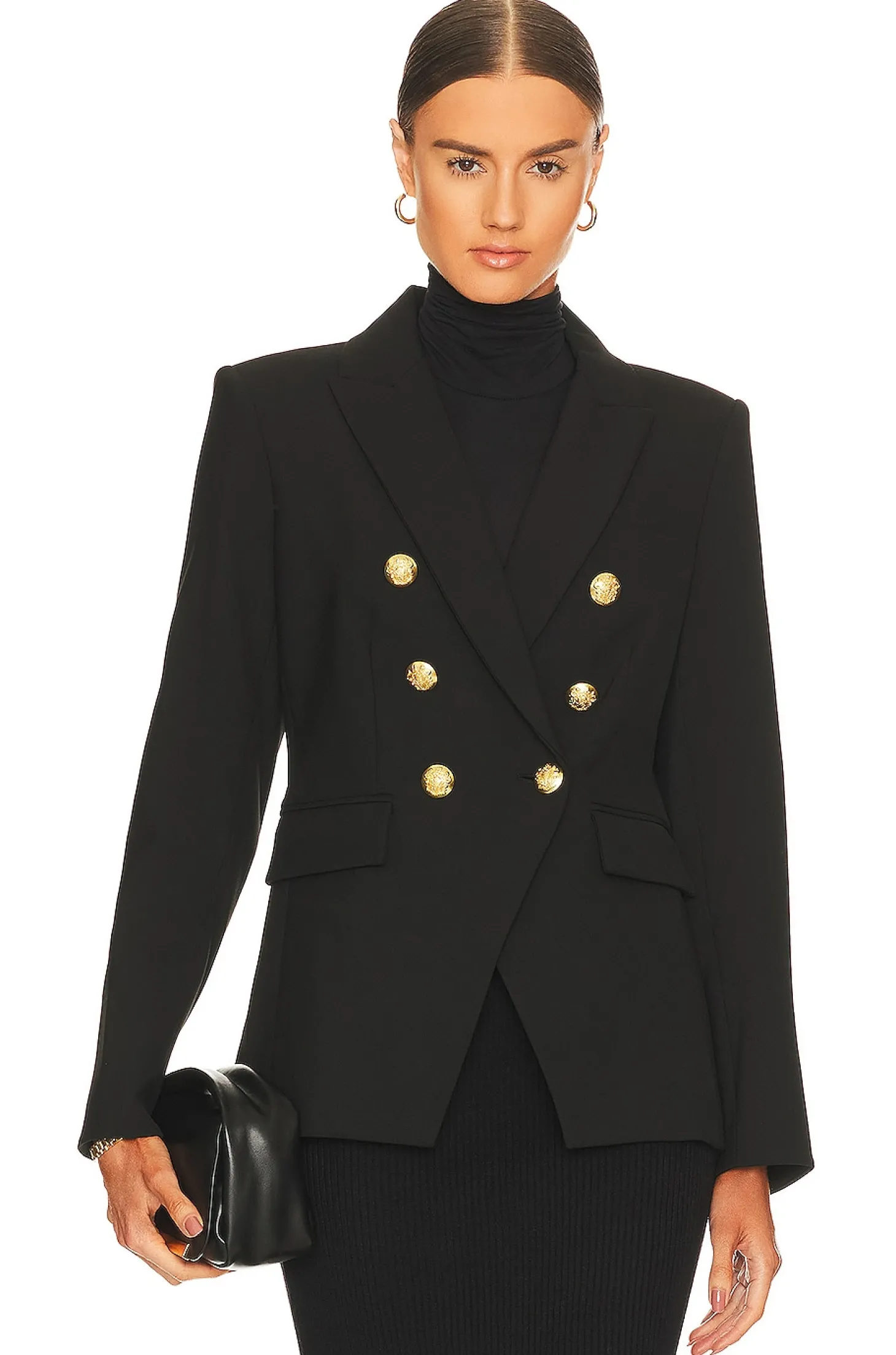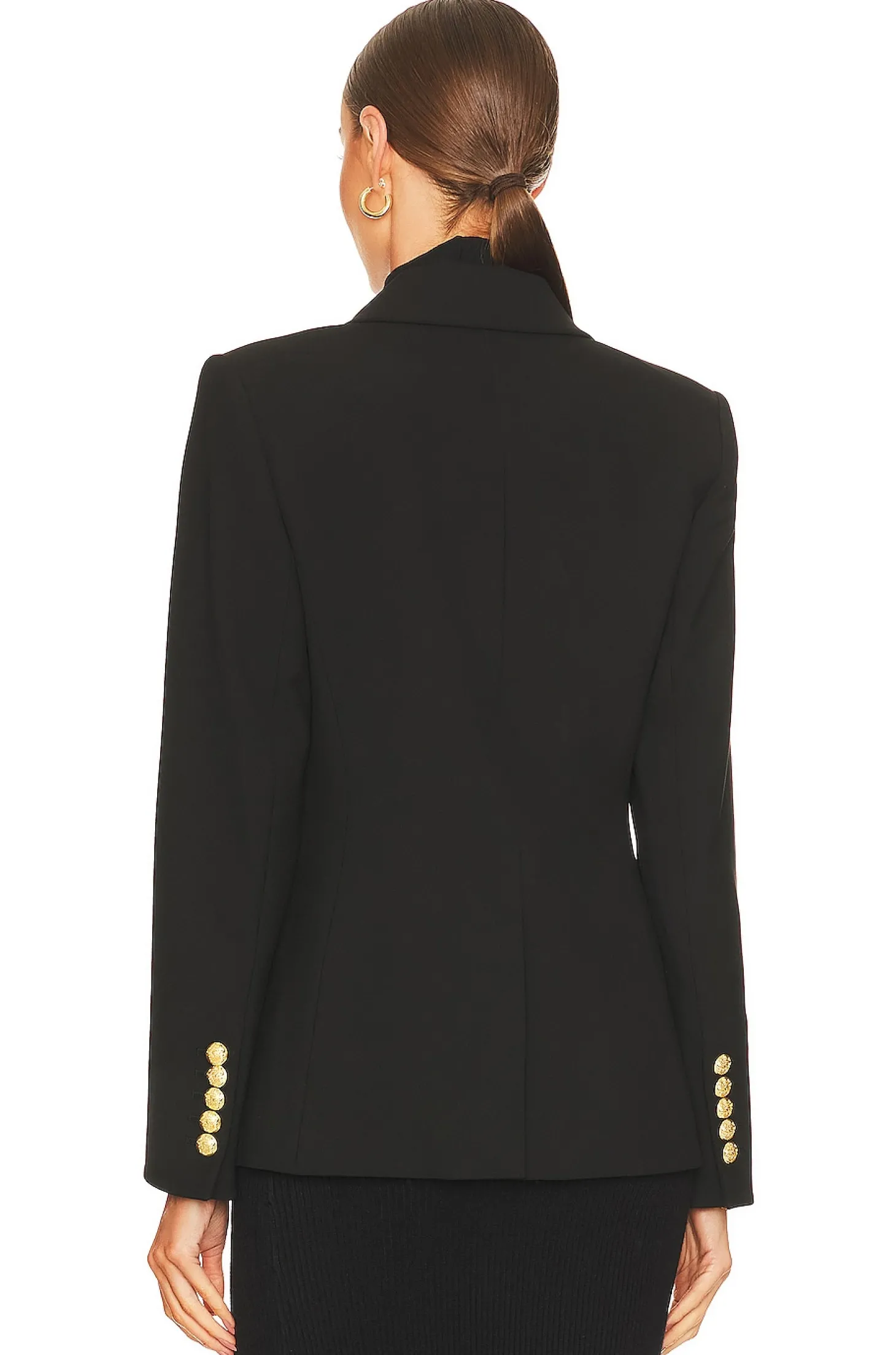 Self: 63% poly 27% viscose 7% cotton 3% elastane Lining: 52% cotton 48% polyester twill.Made in USA.Dry clean only.Hidden front zipper closure with double-breasted button overlay.Gold-tone engraved buttons Buttoned cuffs.Front flap pockets.Suiting fabric with back vent