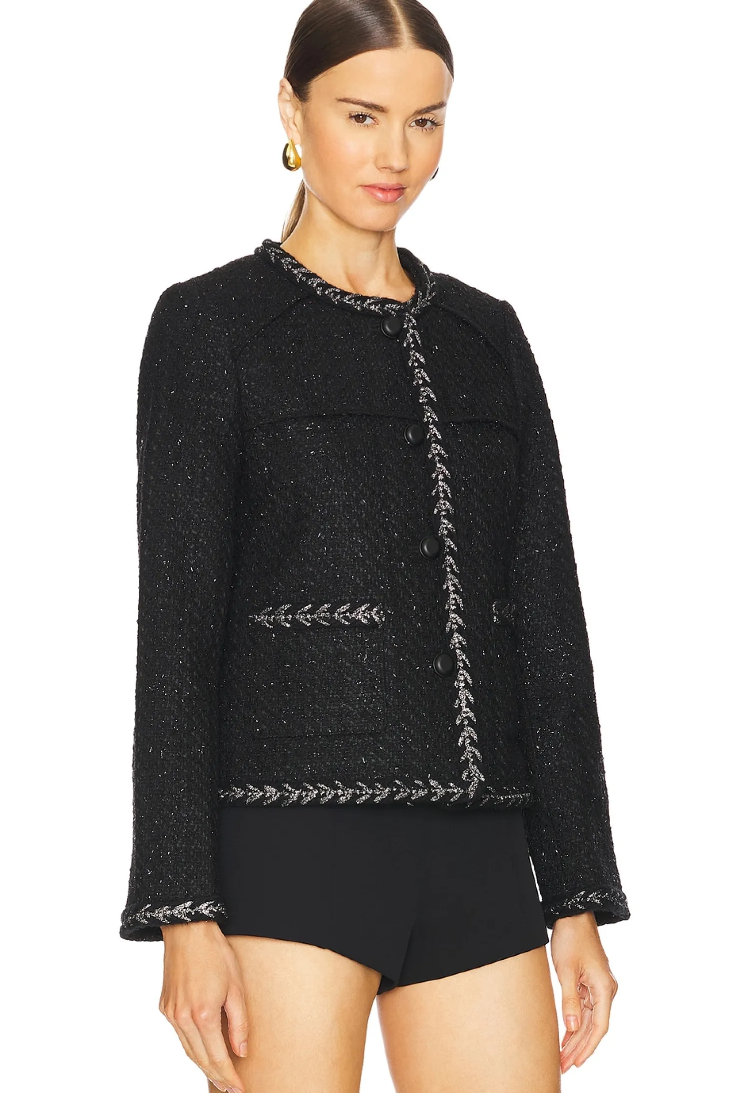 Self: 69% polyester 31% wool Lining: 51% viscose 49% polyester.Made in Vietnam.Dry clean only.Front button closure.Tweed fabric with metallic threading and padded shoulders