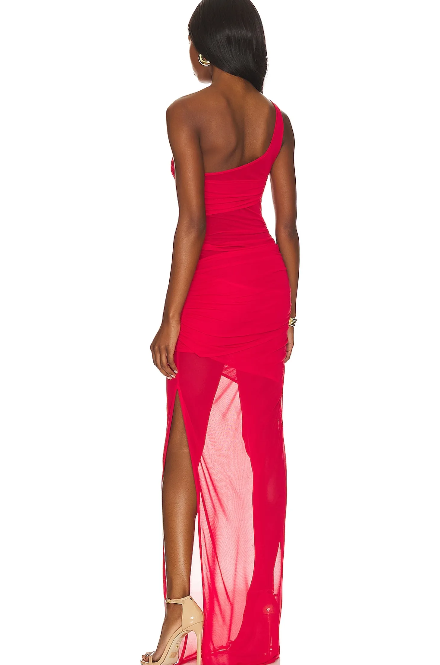 77% viscose 23% polyester.Made in Turkey.Dry clean only.Partially lined.Pull-on styling.One shoulder styling.Ruched mesh fabric overlay