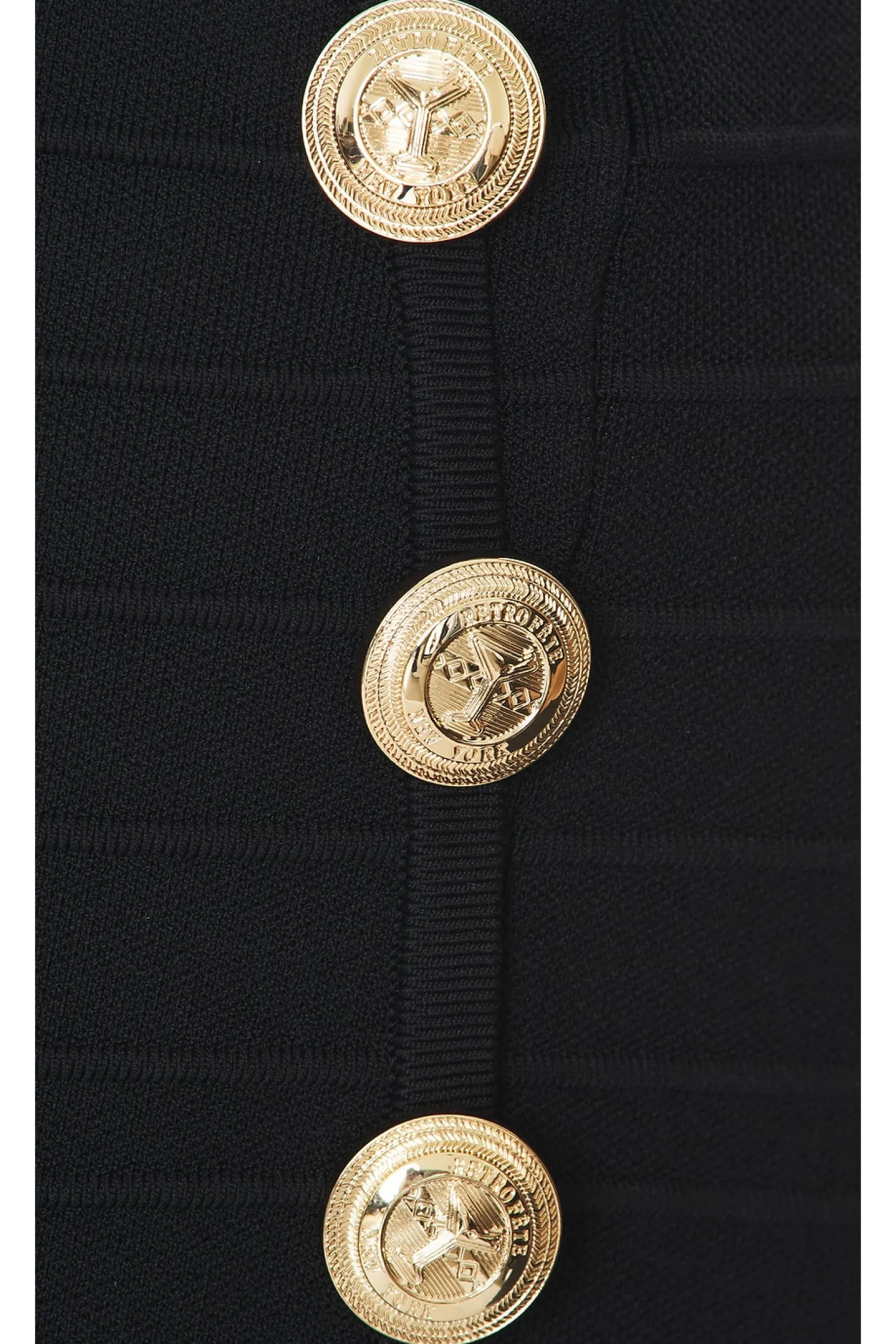 63% rayon 34% nylon3 % spandex.Made in China.Dry clean only.Ribbed ponte knit fabric with gold tone button accents.Stretch fit.Item not sold as set.Shorts measure approx 28" in length
