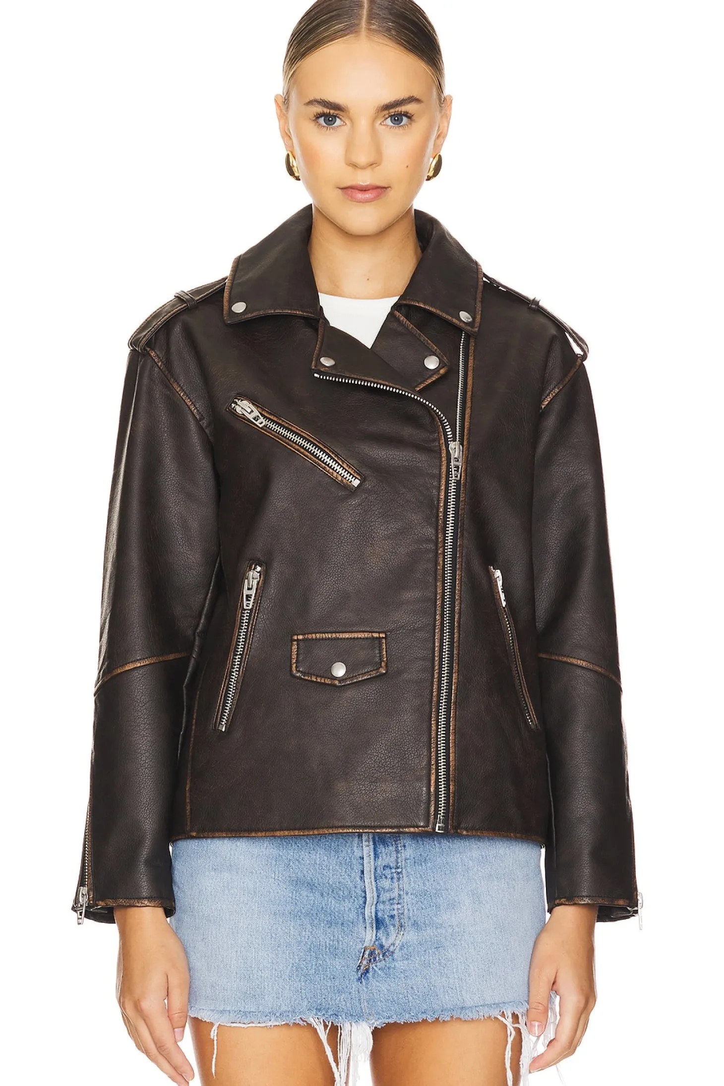 Self: 60% polyurethane 40% polyester Lining: 98% polyester 2% spandex.Made in China.Spot clean.Exposed front zipper closure.Front pockets with zip closure.Zip cuffs.Faux leather