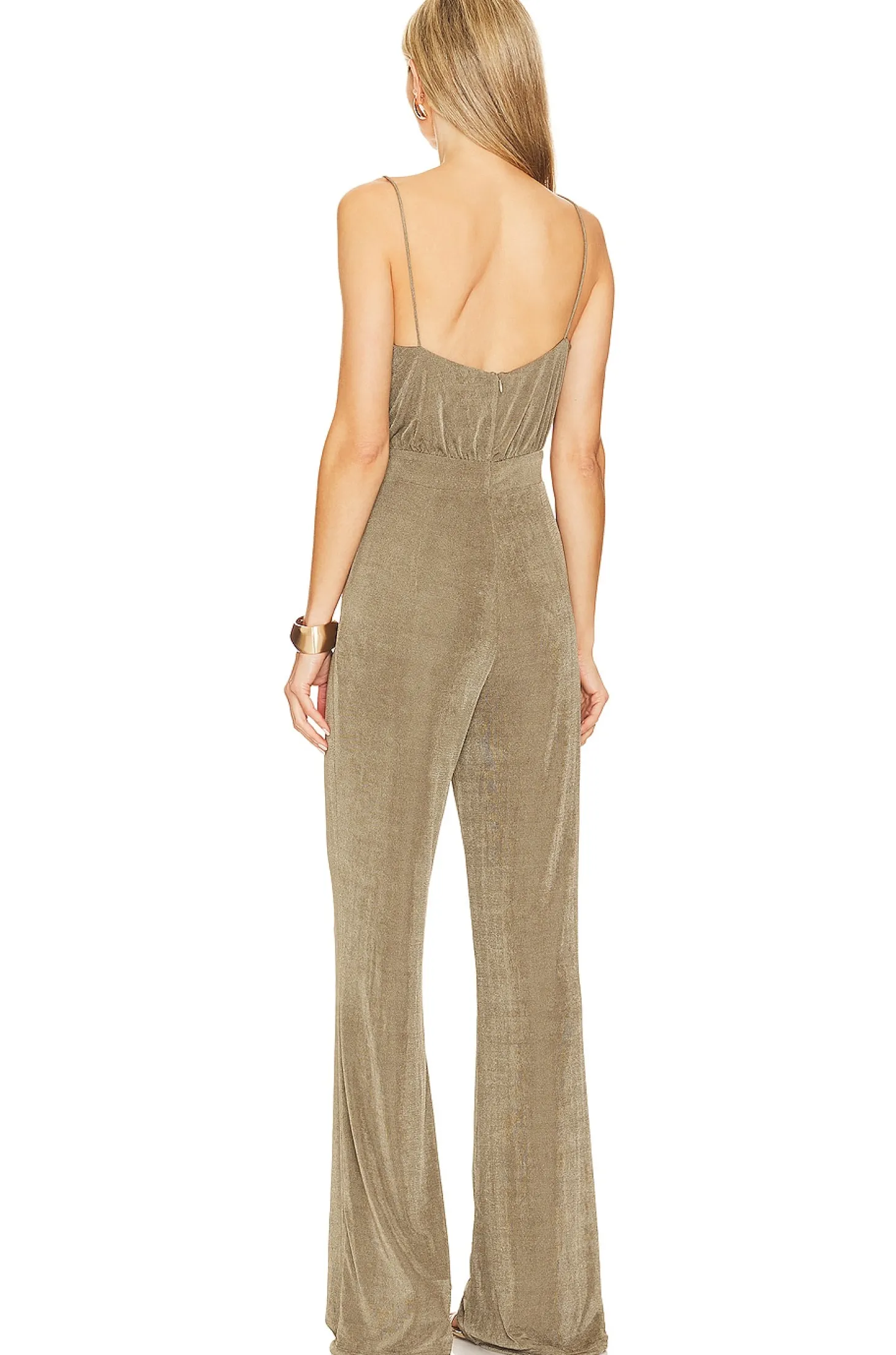 Polyester blend.Imported.Dry clean recommended.Hidden back zipper closure.Asymmetrical cowl neckline.Slinky jersey fabric with metallic finish