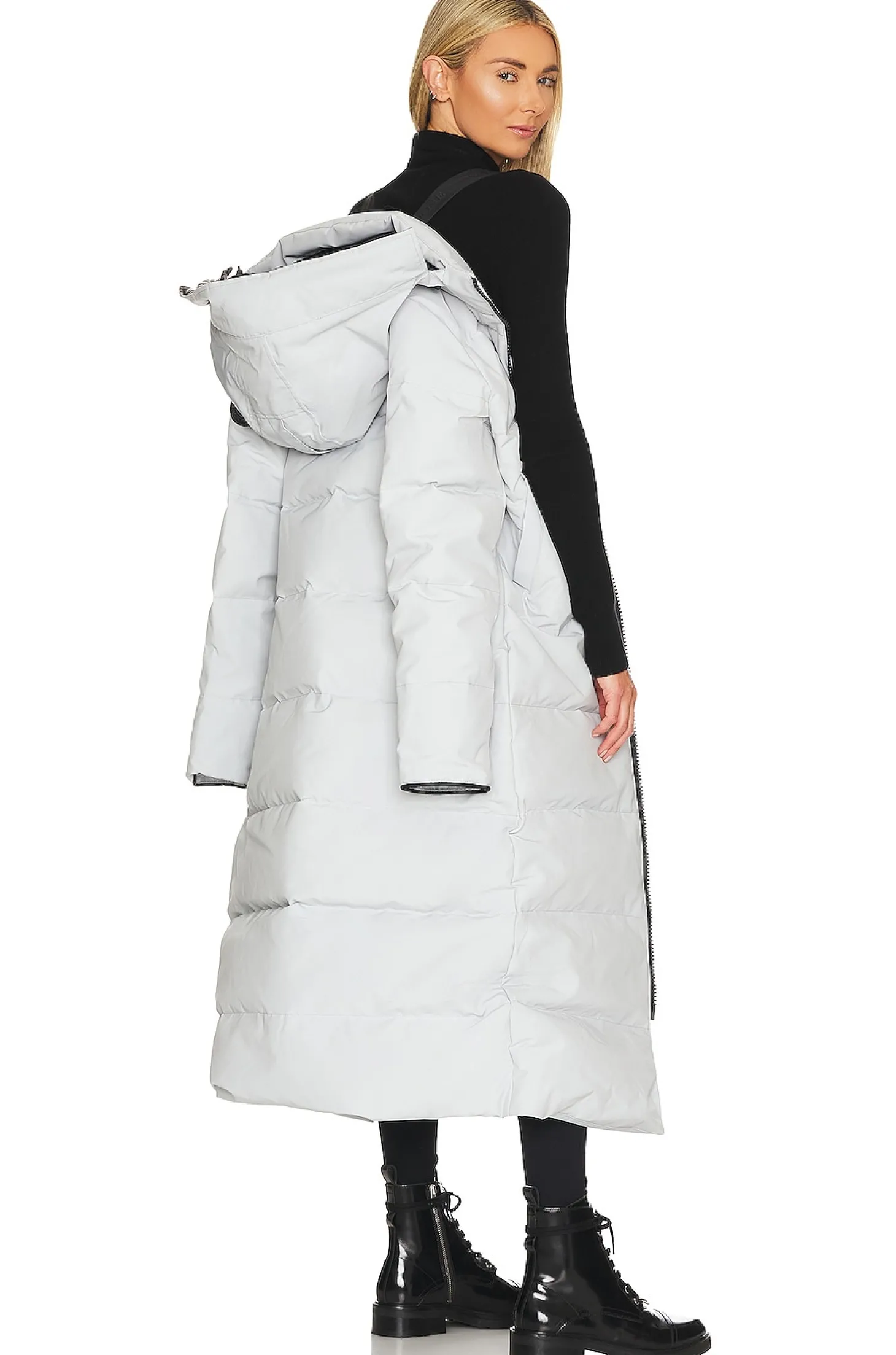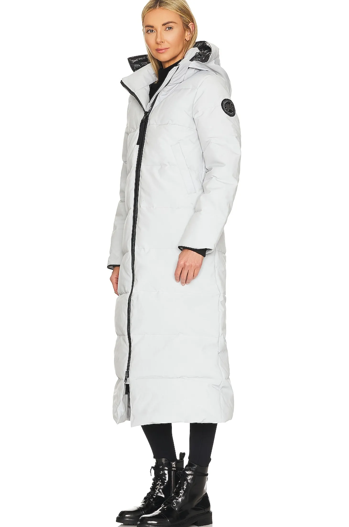 Self: 84% polyester 16% cotton Lining: 100% polyamide Fill: 80% duck down 20% duck feather.Made in Canada.Dry clean only.Double zipper closure.Removable hood.Side slant pockets with snap button closure and inner slip pockets.Inner side zip pocket.Ripstop fabric