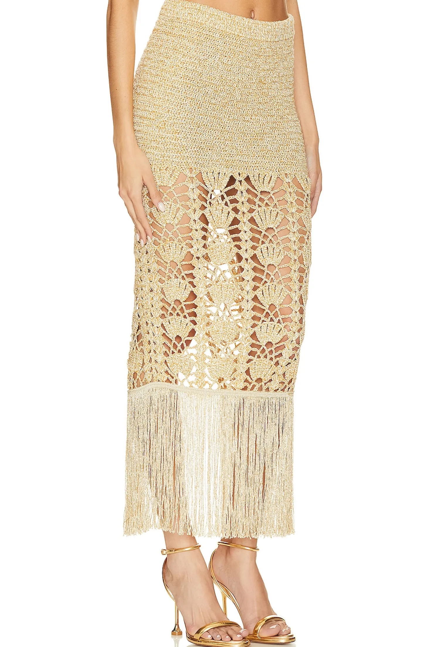 50% acrylic 24% polyester 13% nylon 13% metallic.Made in China.Hand wash.Unlined.Pull-on styling.Fringe trim.Lightweight knit fabric with metallic threading throughout and back vent.Skirt measures approx 40" in length
