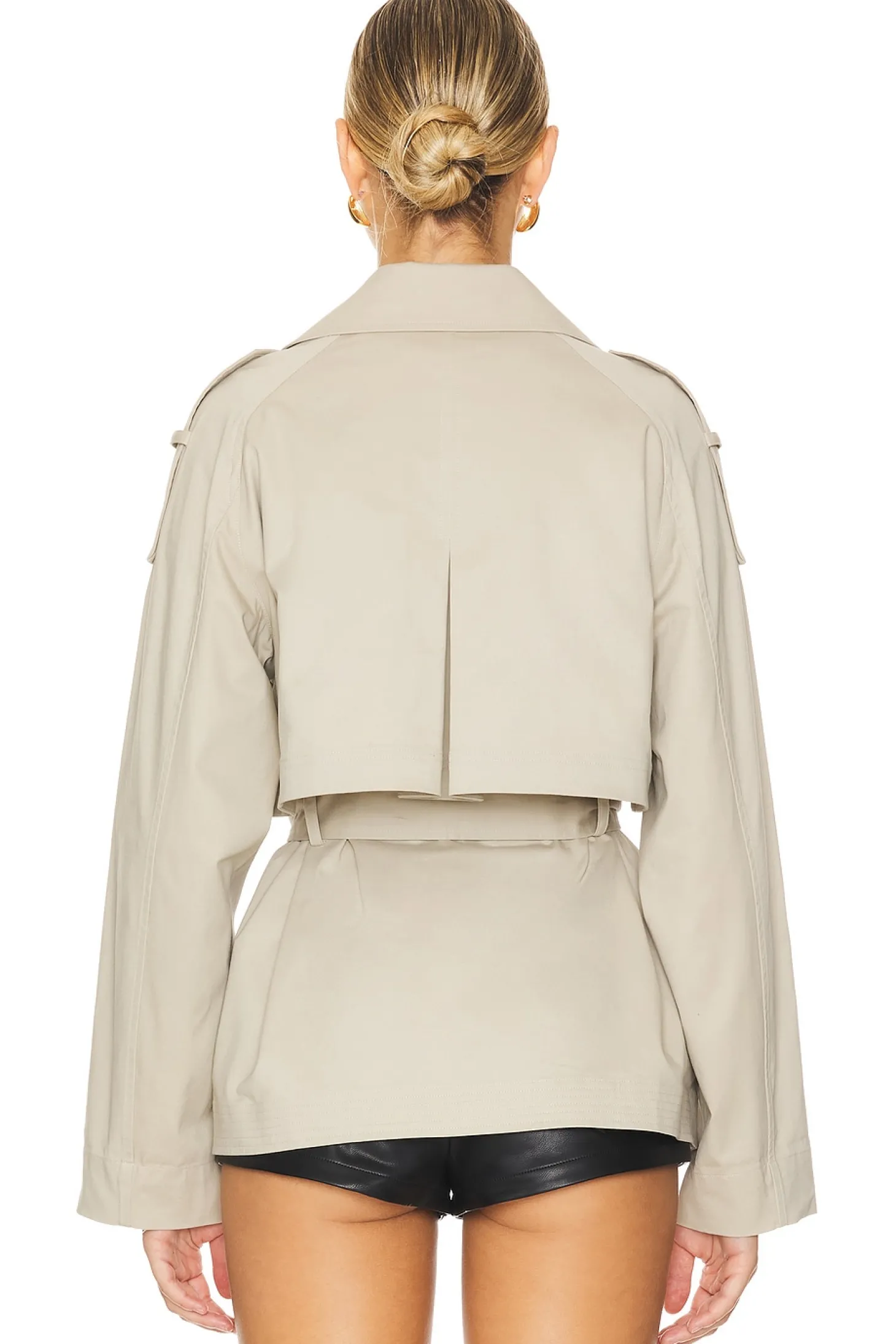 Gabardine textile.Made in Vietnam.Machine wash cold.Front double-breasted button closure with Optional tie at waist.Epaulettes.Back vent.Side slit pockets