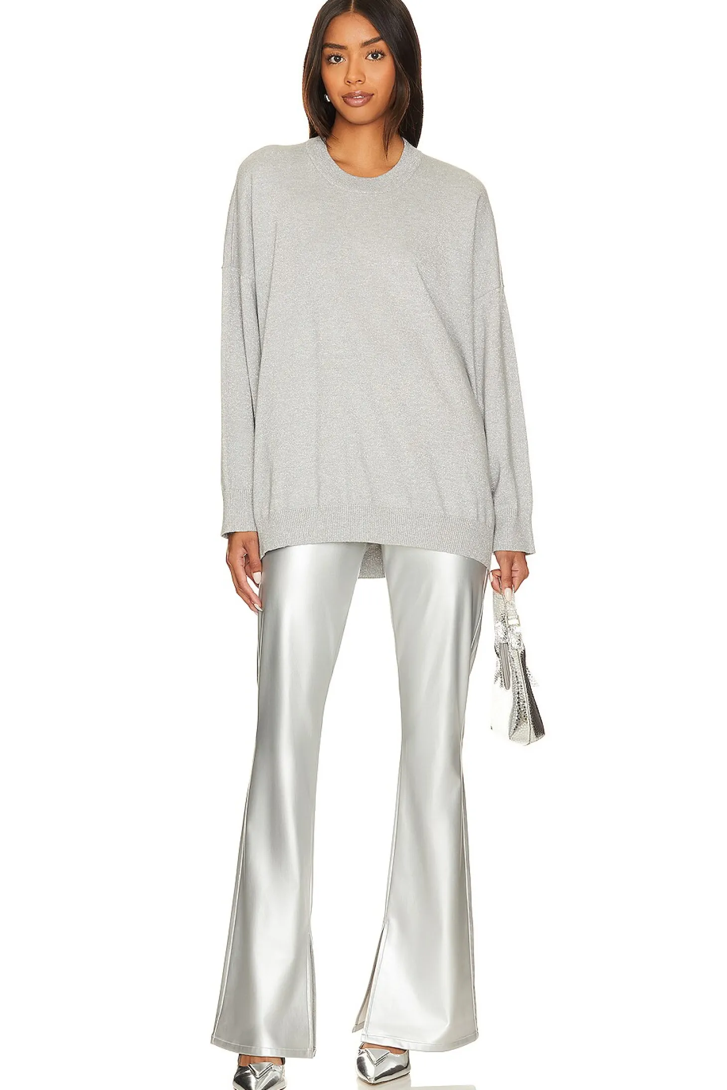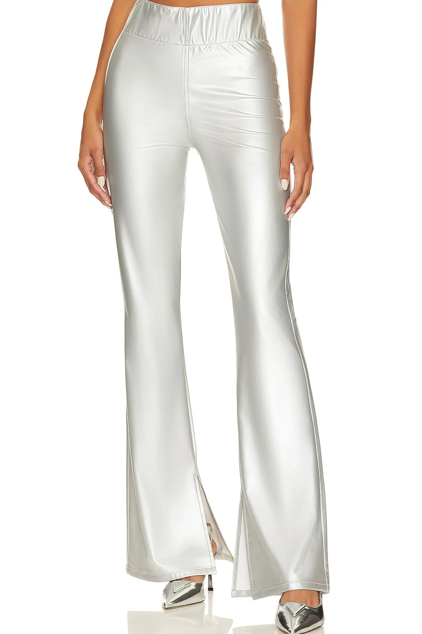 Polyurethane blend fabric.Imported.Dry clean recommended.Pull-on styling with elastic waistband.Back slip pockets with darted MUMU logo.Metallic faux leather fabric.14" at the knee breaks to 20" at the leg opening