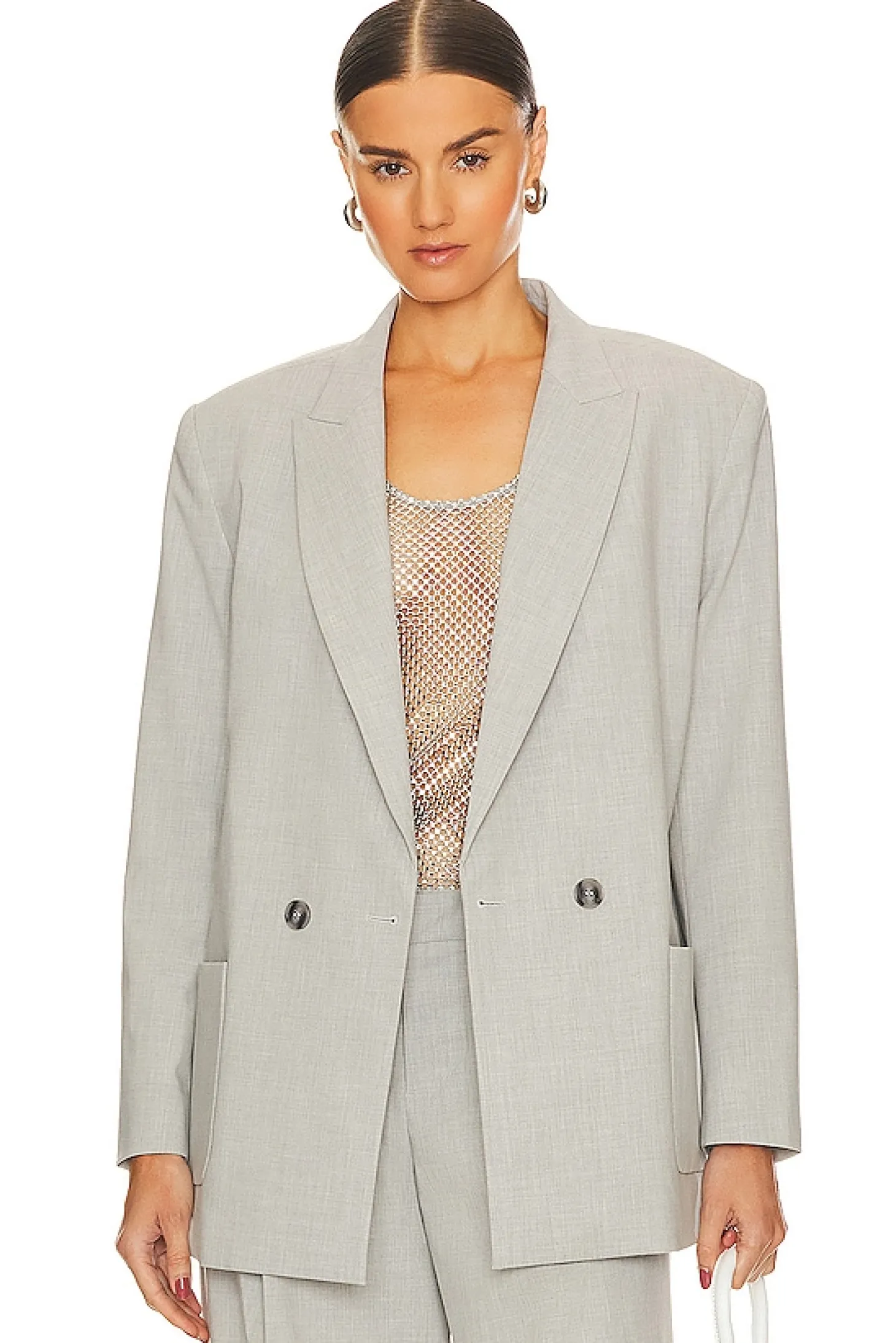 Self: 57% polyester 29% rayon 10% wool 4% spandex Lining: 55% polyester 45% viscose.Made in China.Dry clean only.Double breasted front button closure.Padded shoulders.Front slip pockets.Suiting fabric.Item not sold as a set