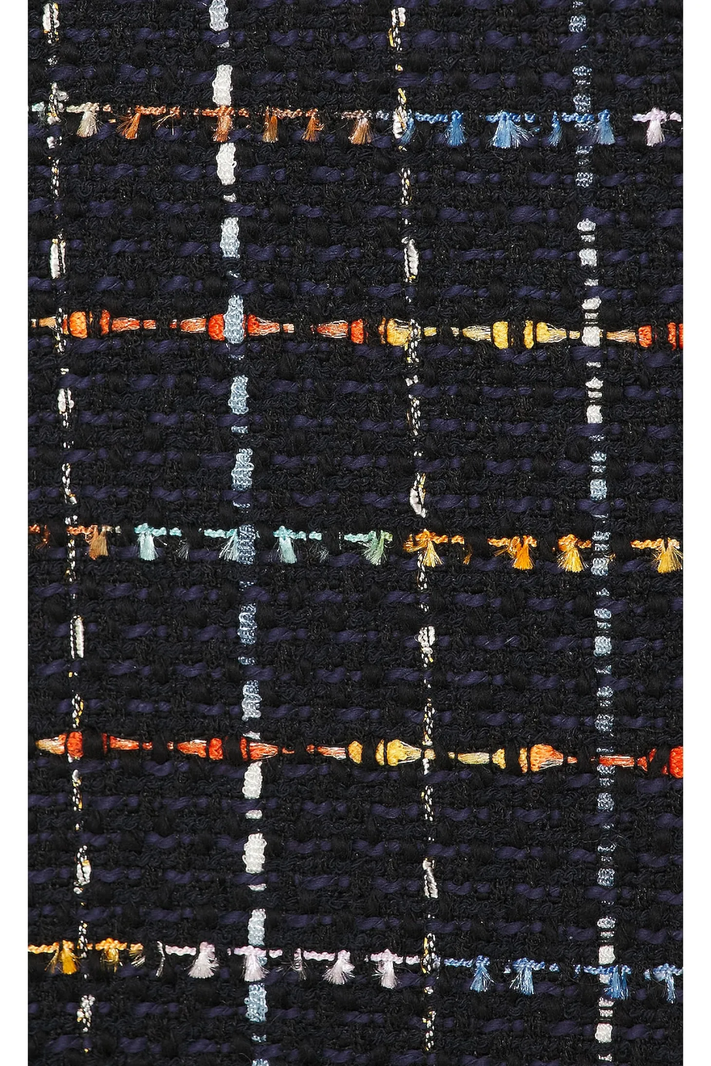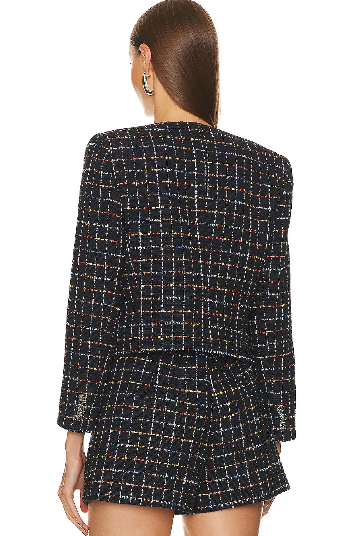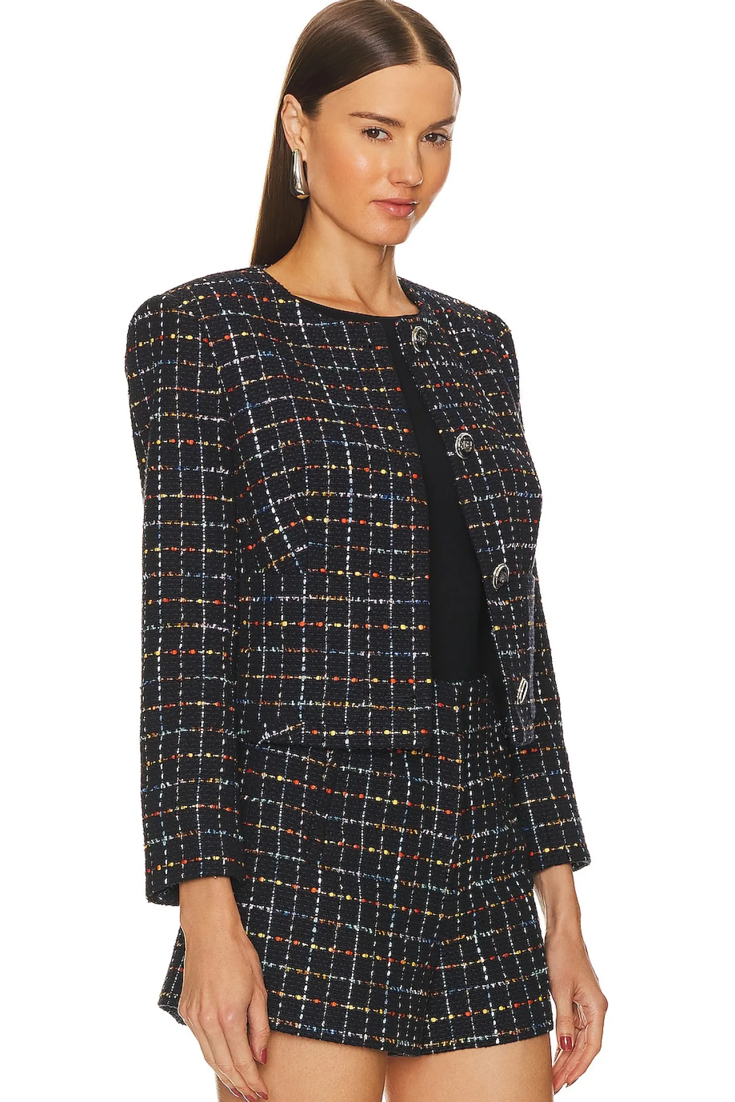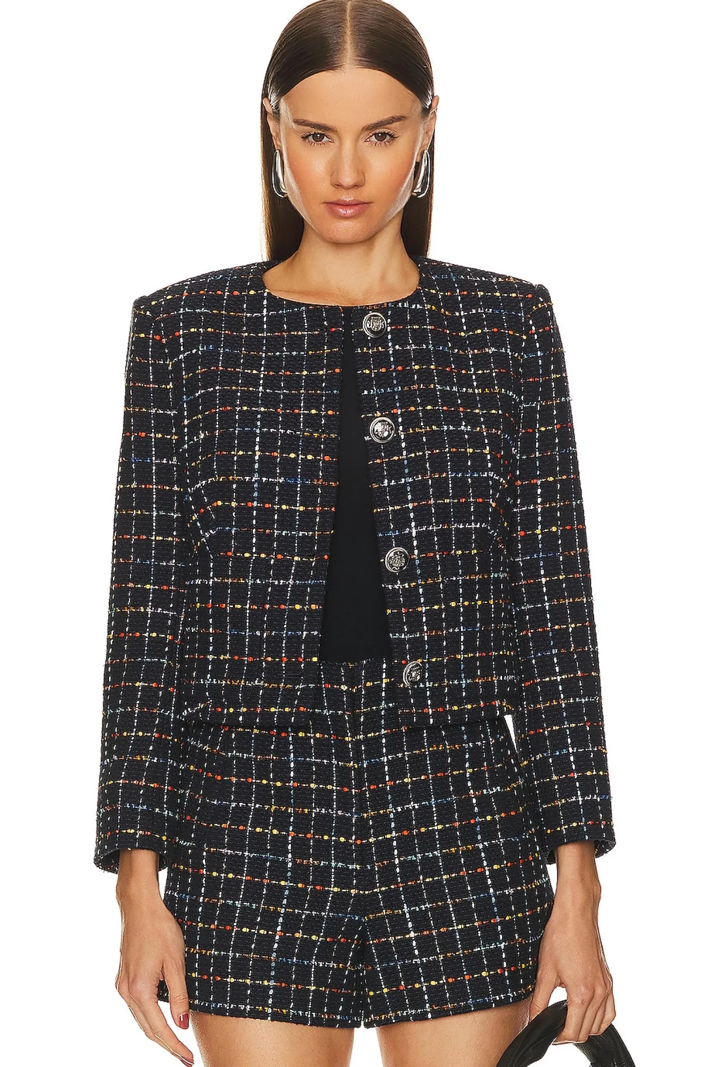 Self: 60% cotton 40% polyester Lining: 100% polyester.Made in China.Dry clean only.Front button closure with button cuffs.Padded shoulder.Tweed fabric with side slip pockets.Item not sold as set