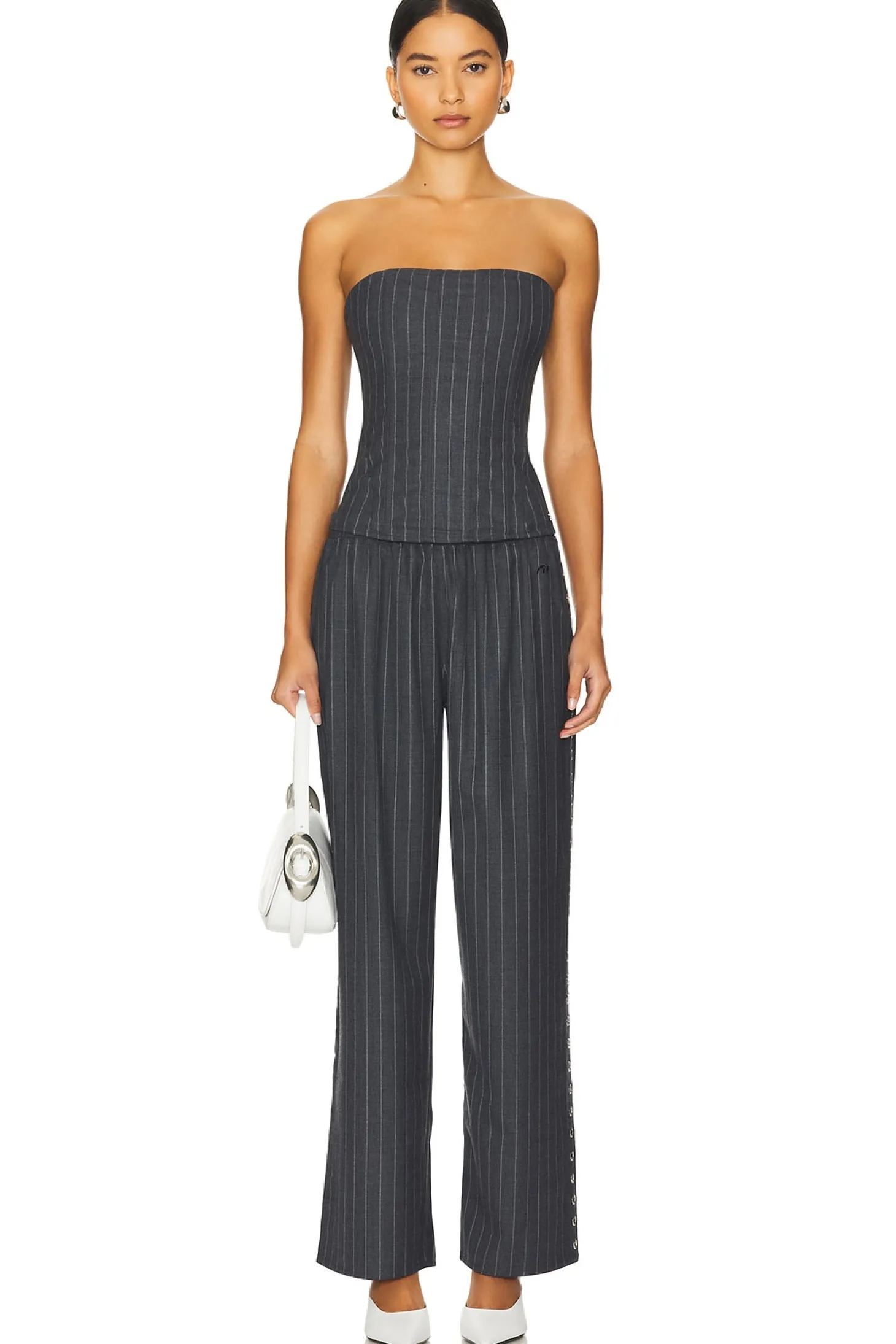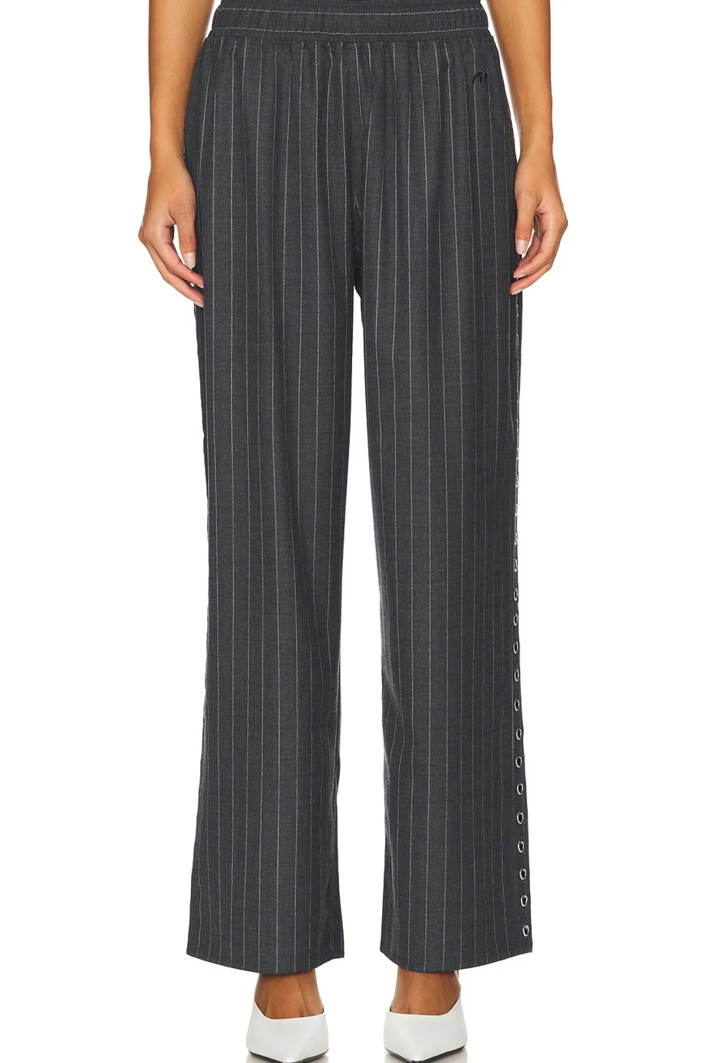 42% wool 29% viscose 28% polyester 3% spandex.Made in China.Dry clean only.Elastic waistband and interior drawstring.Ring hardware at sides.Lightweight twill fabric.Item not sold as set.22" at the knee narrows to 19" at the leg opening