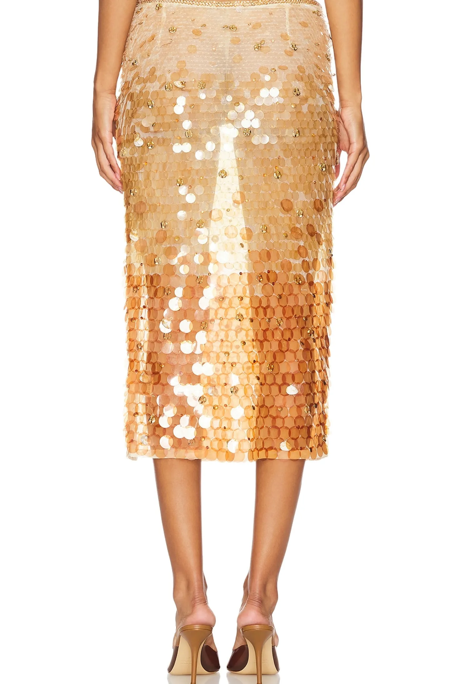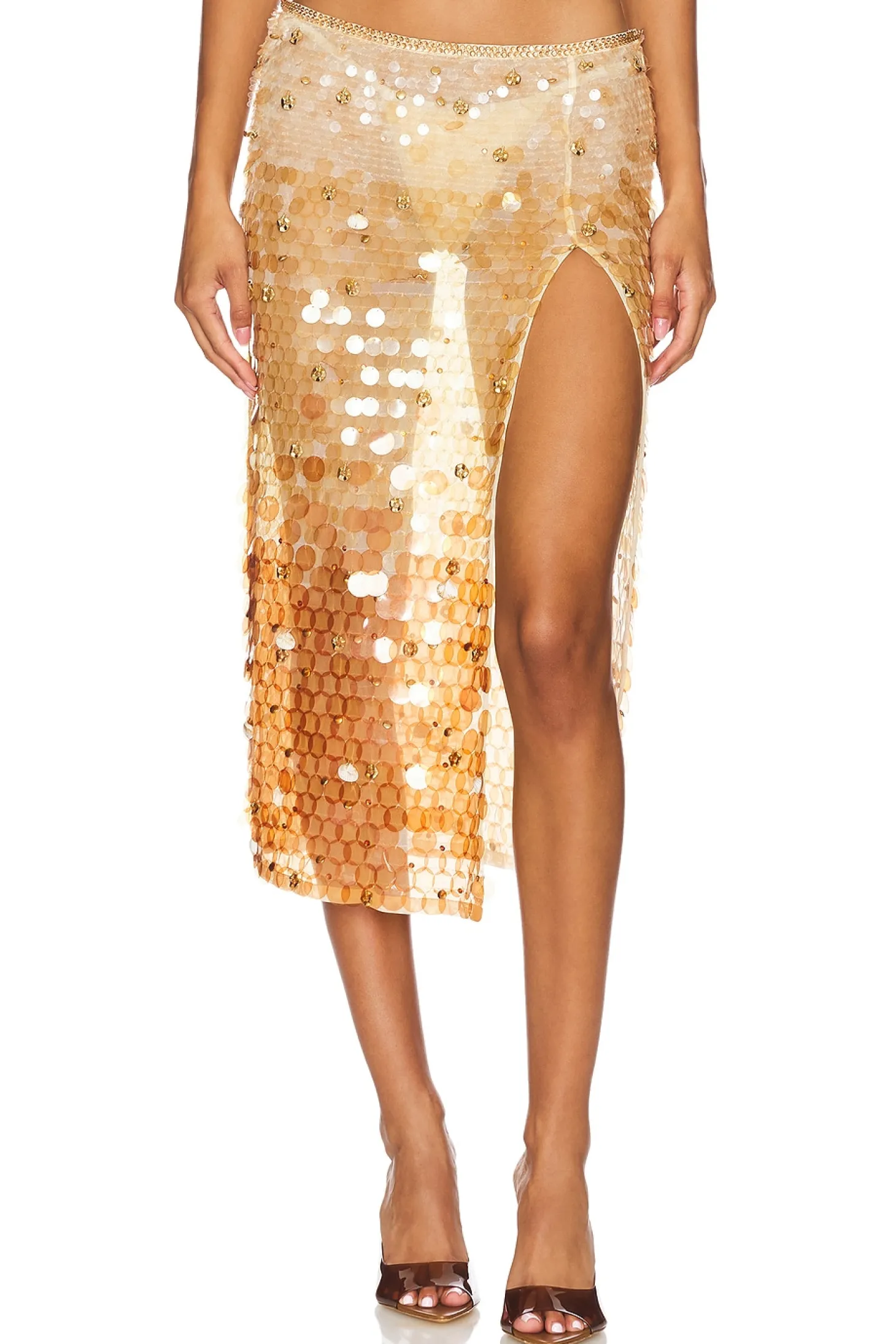 100% nylon.Made in India.Dry clean only.Unlined.Hidden side zipper closure.High cut side seam slit Lightweight oversized sequin embellished fabric.Garment is intentionally sheer, undergarments will show through. Please note undergarment not included Item not sold as a set.Waist to shortest hem measures approx 7" and to longest hem approx 29" in length