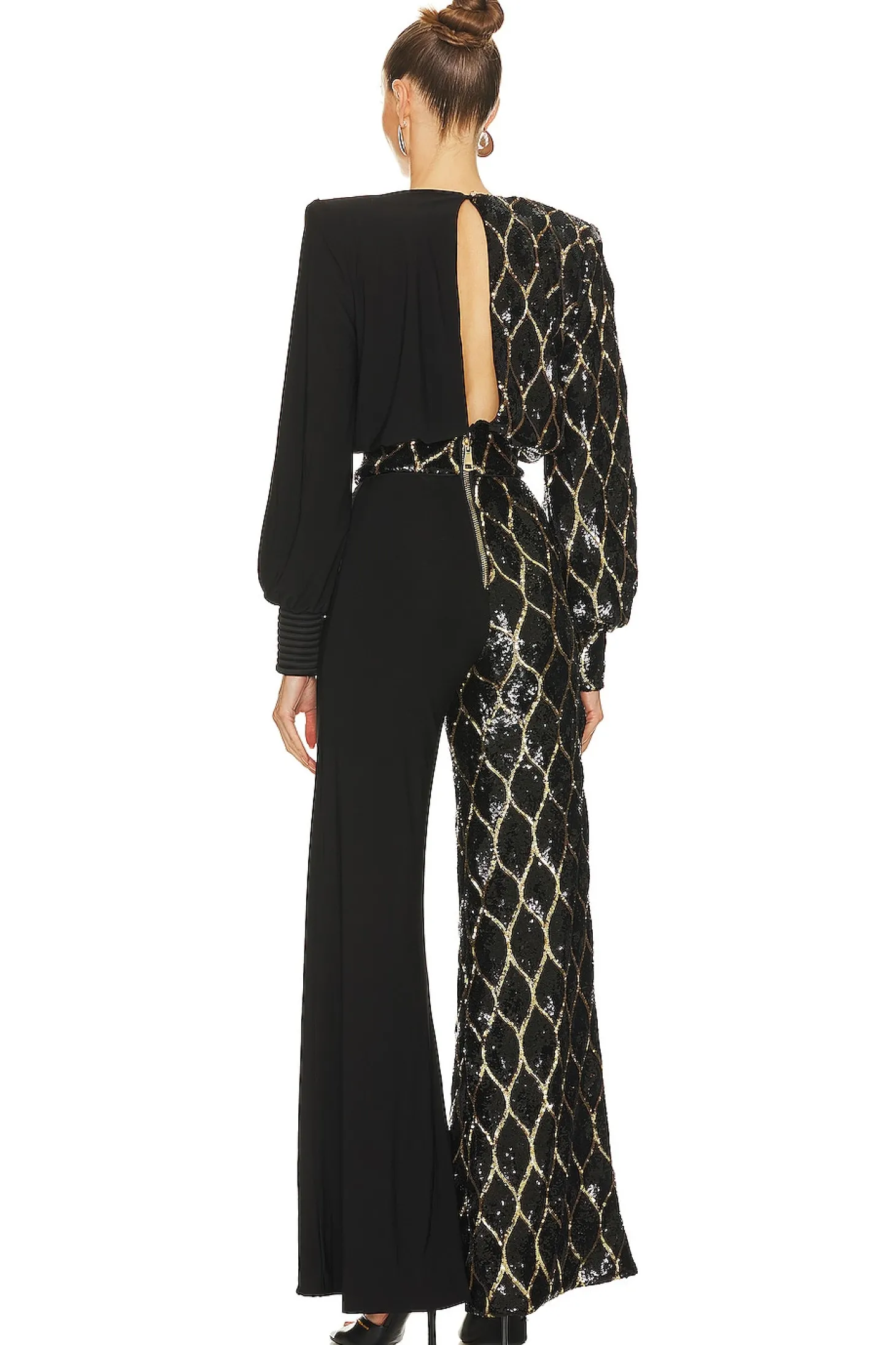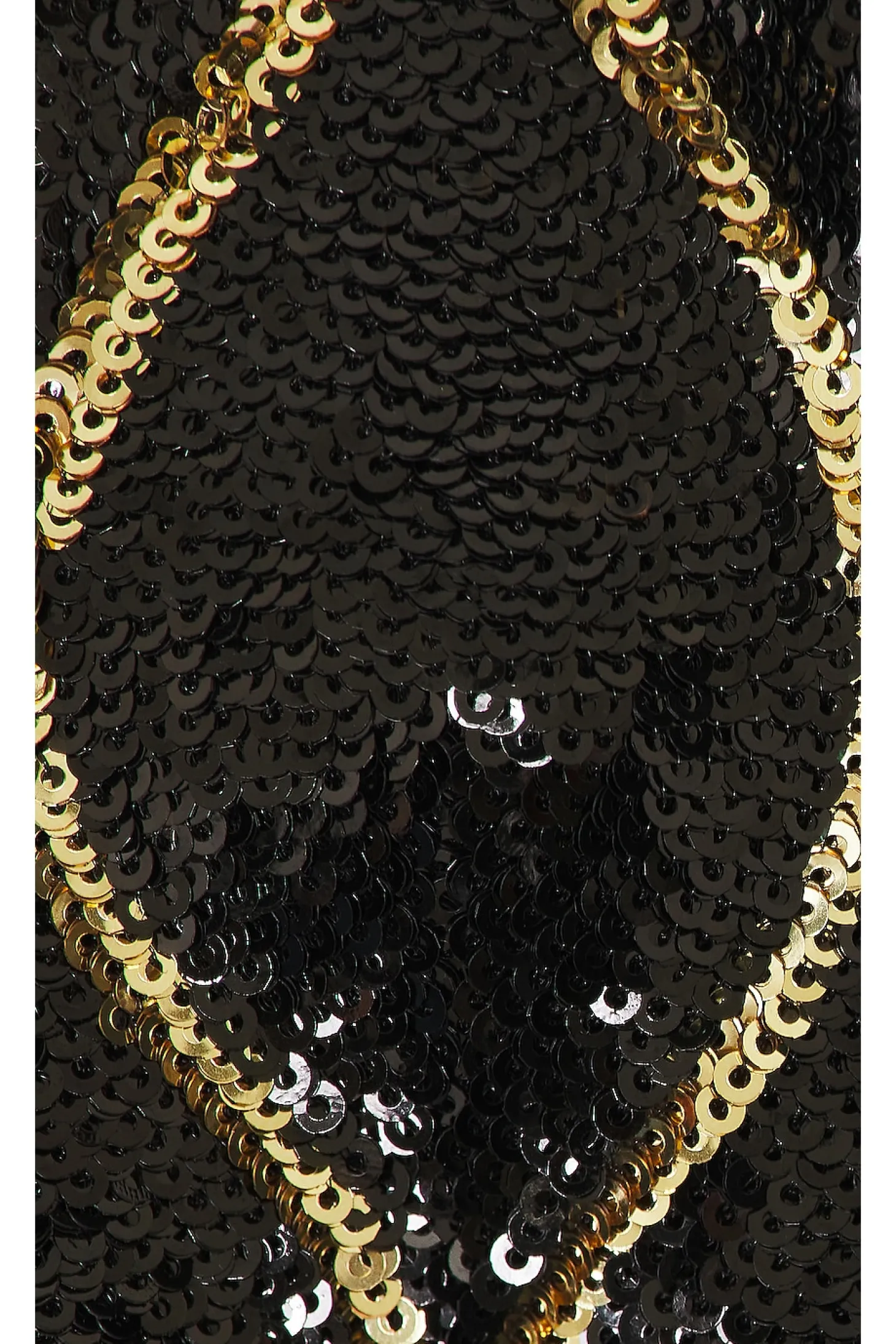 Self: 100% polyester Lining: 95% polyester 5% elastane.Made in China.Hand wash.Exposed back zipper closure.Split back with loop button closure at neckline.Padded shoulders.Tonal sequin embellishments and jersey fabric panels