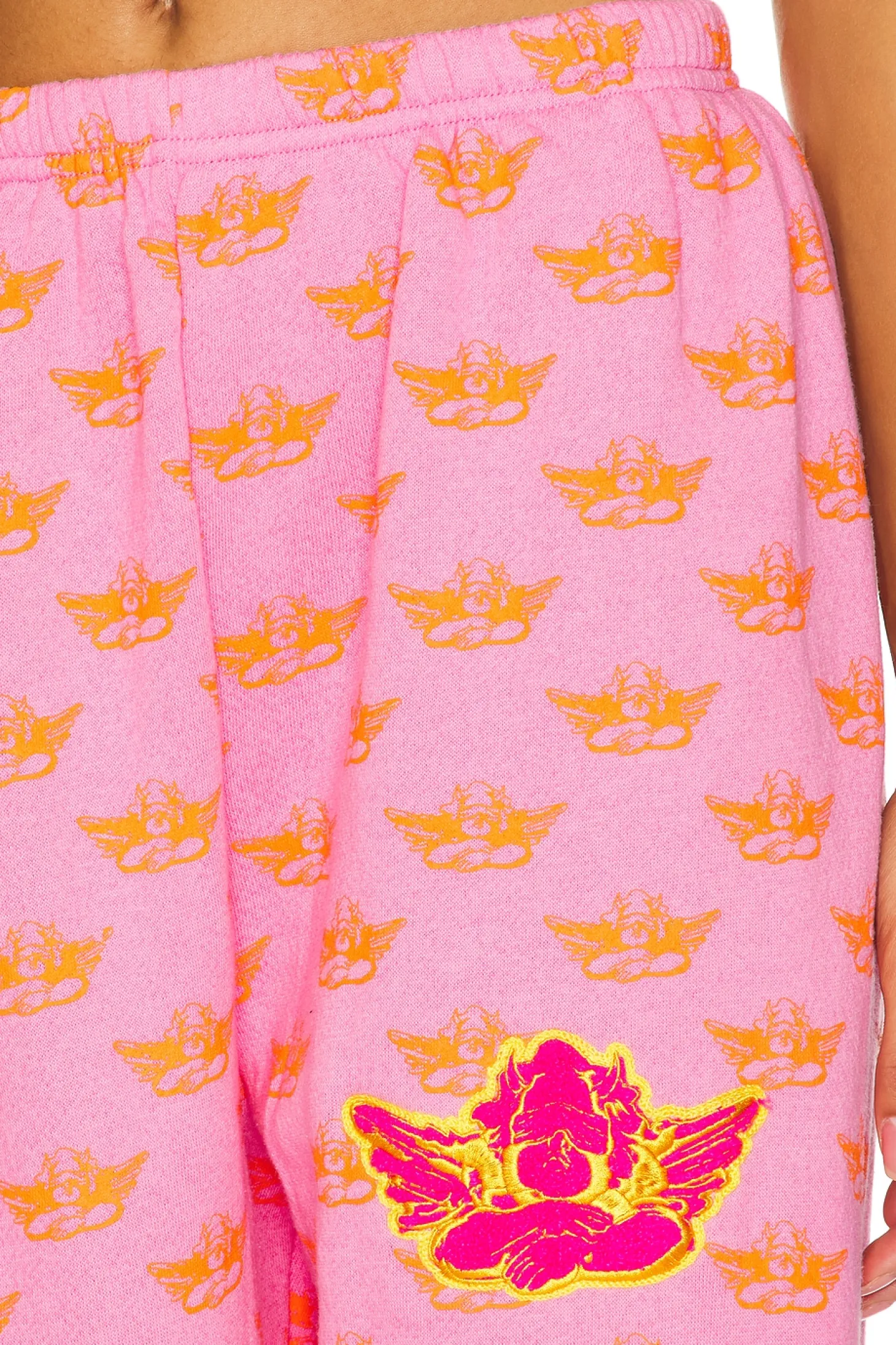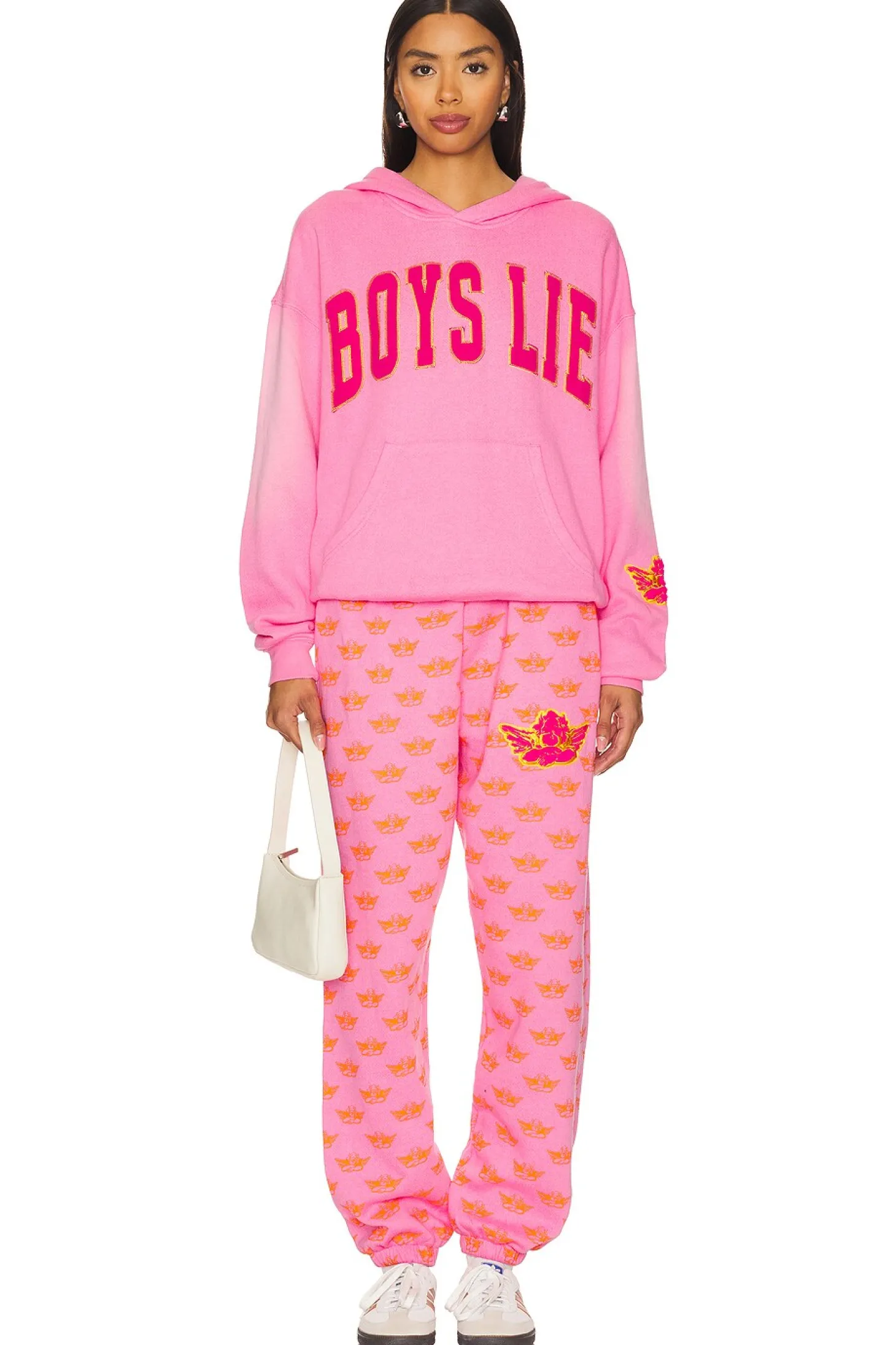 66% cotton 21% rayon 13% polyester.Made in China.Machine wash.Elastic waistband with interior drawstring.Front logo Elastic cuffs.Logo print fabric with fleece lining.Item not sold as set.21" at the knee narrows to 10" at the leg opening