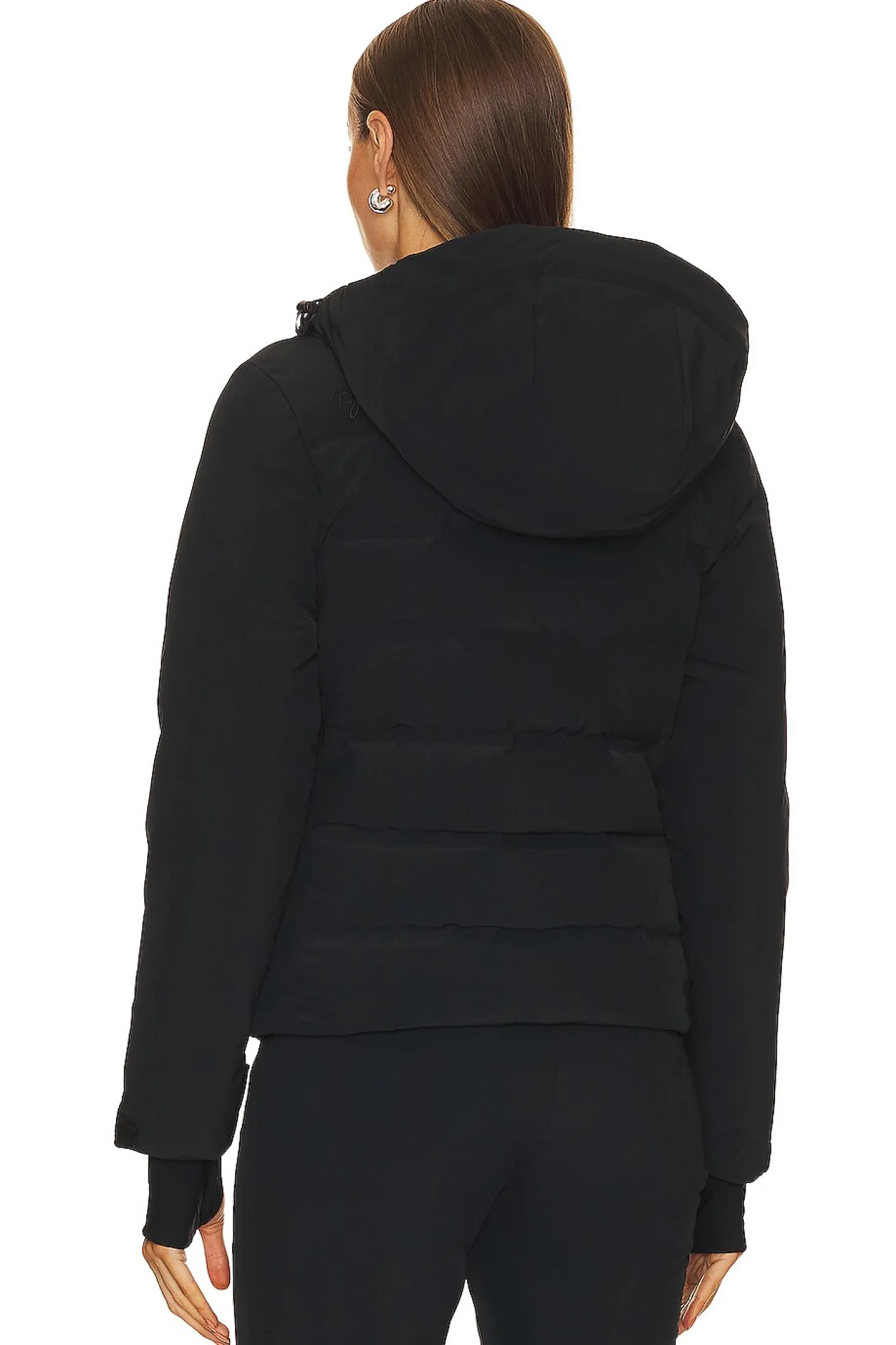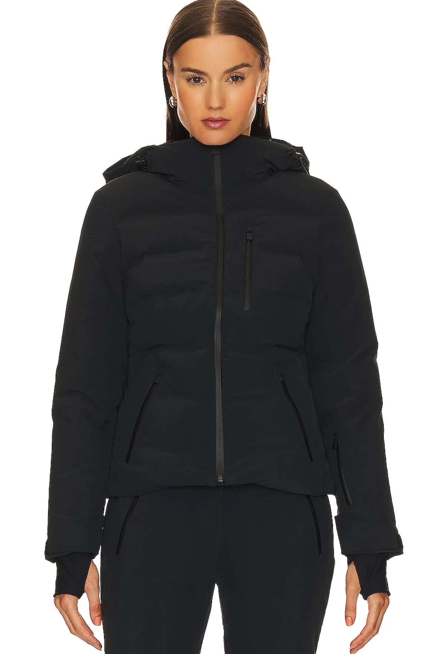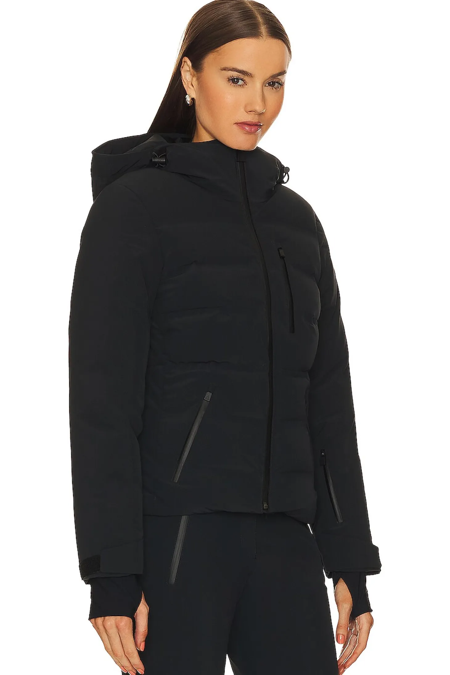 Self: 86% polyamide 14% elastane Lining: 65% polyester 32% polyamide 3% elastane Filling 1: 100% down Filling 2: 100% polyester.Made in Slovakia.Machine wash.Front zipper closure.Front and side zip pockets Sleeve zip pocket.Interior slip pockets and interior snowcatcher.Drawcord hood and interior drawcord hem.Thumbhole design