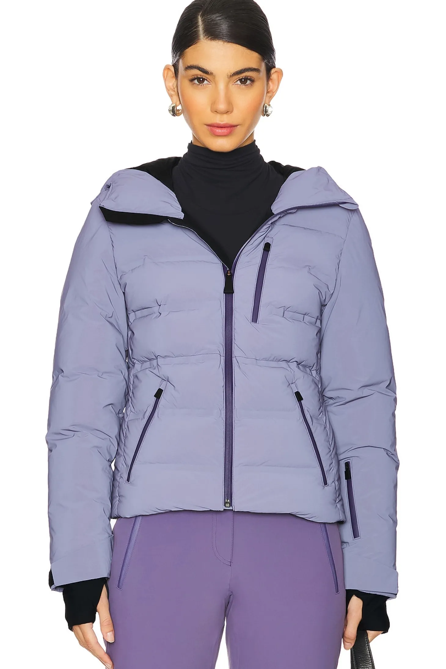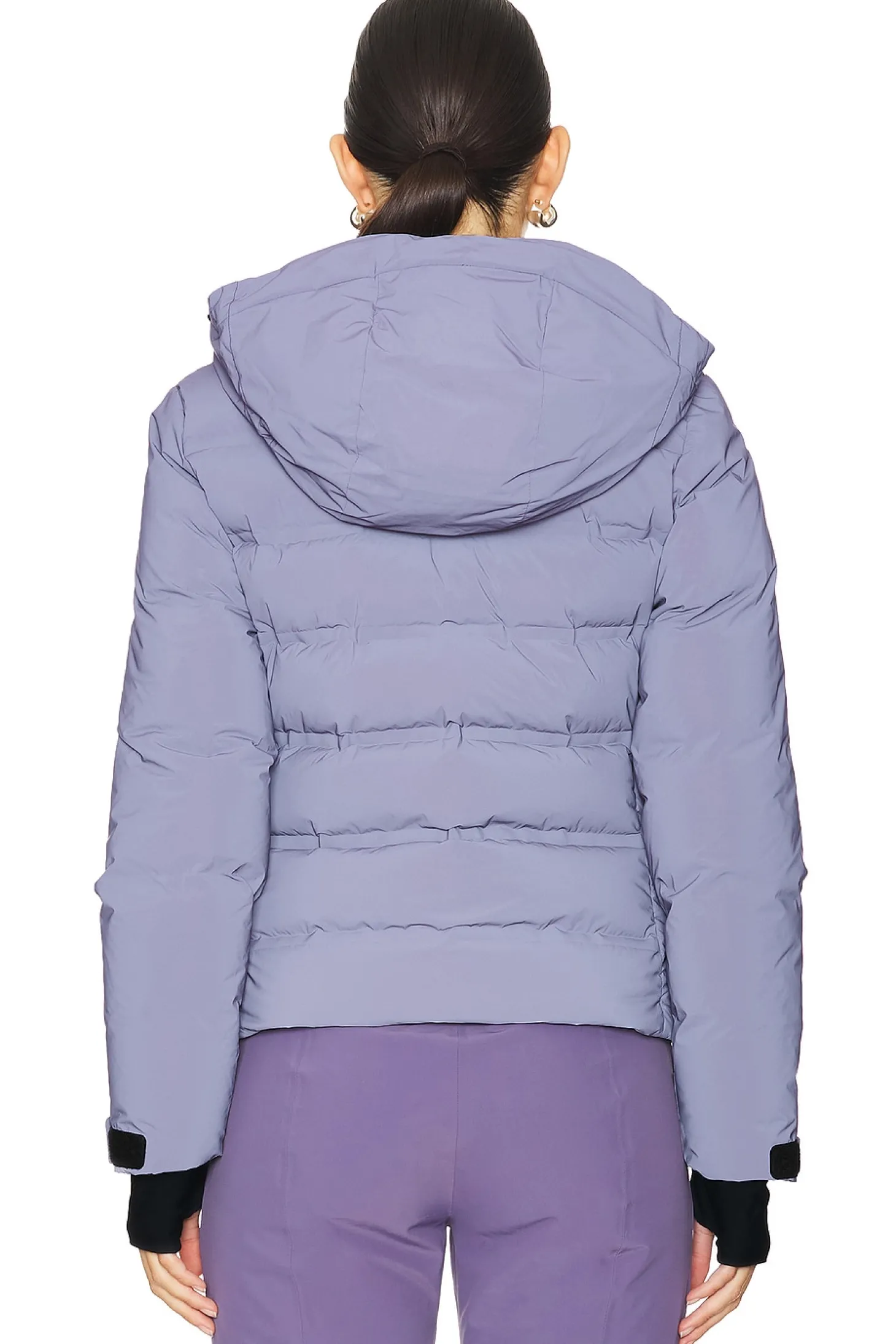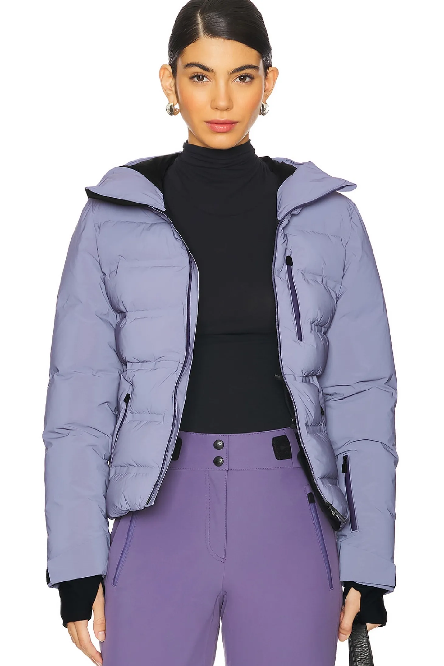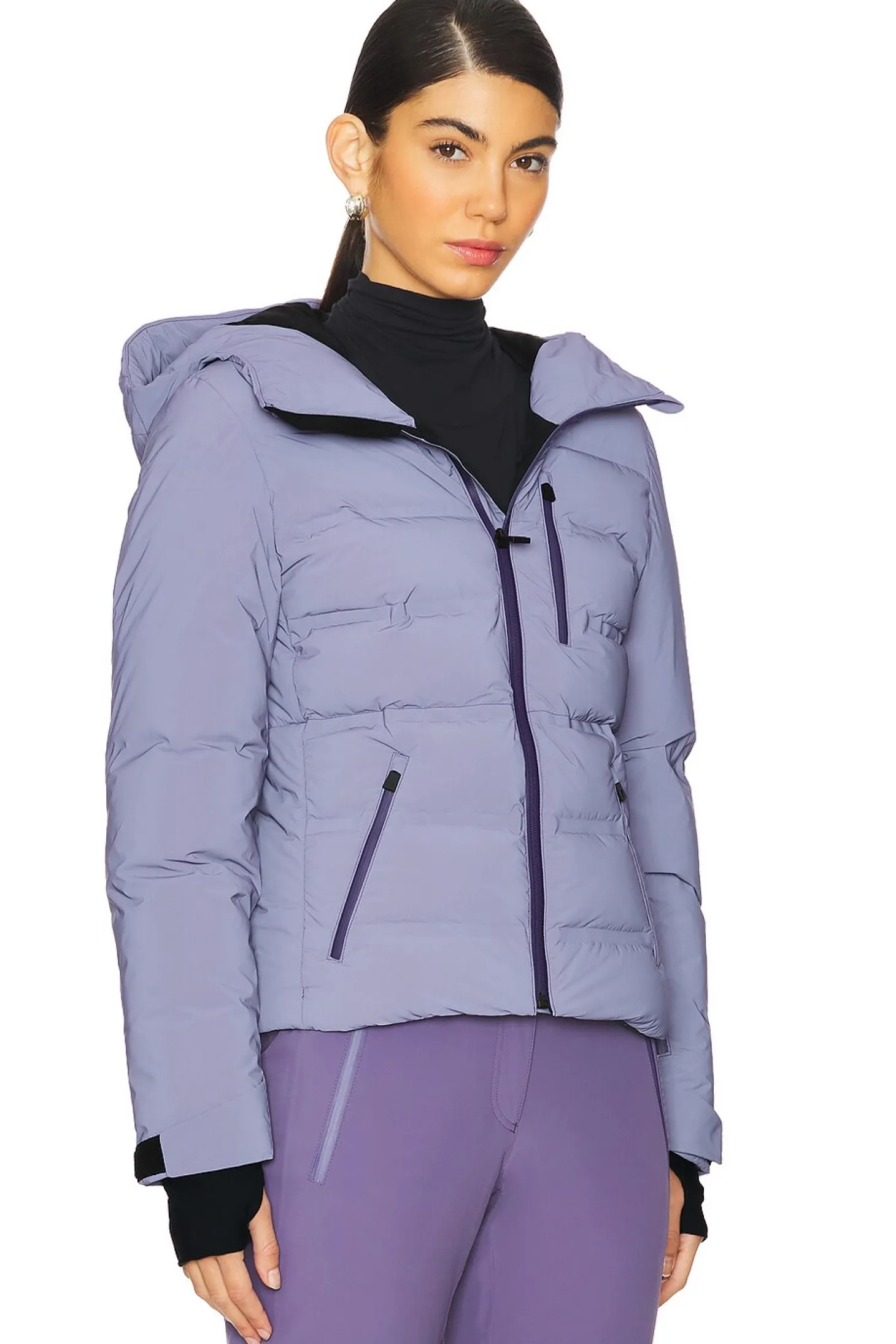 Self: 52% glass 29% polyurethane 19% polyamide Insert: 86% polyamide 14% elastane Lining: 65% polyester 32% polyamide 3% elastane Filling 1: 100% down Filling 2: 100% polyester.Made in Slovakia.Machine wash.Front zipper closure.4-pocket styling.Drawcord hood.Puffed ripstop fabric with thumbhole design and drawcord hem