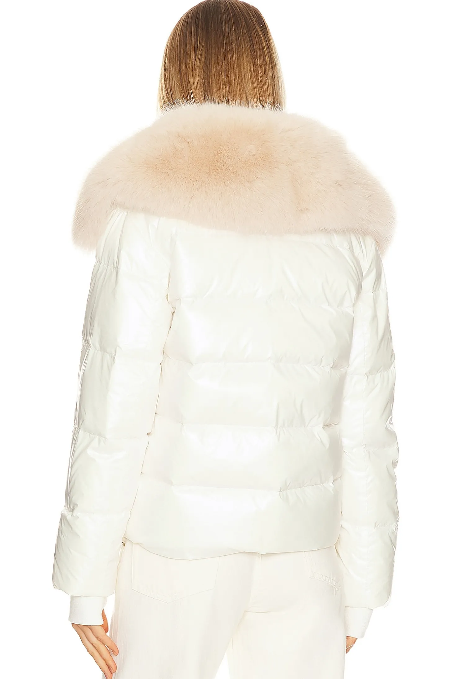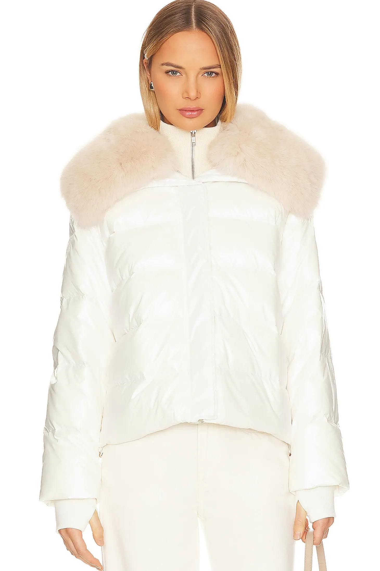 Self 1: 100% polyester Self 2: 100% nylon Fill: 90% goose down 10% goose feather Lining: 100% polyester Knit: 100% acrylic.Made in China.Dry clean only.Front zipper closure with velcro detail.Detachable faux fur collar.Side slant pockets.Ribbed cuffs with thumbhole design.Interior drawcord closure Ripstop fabric