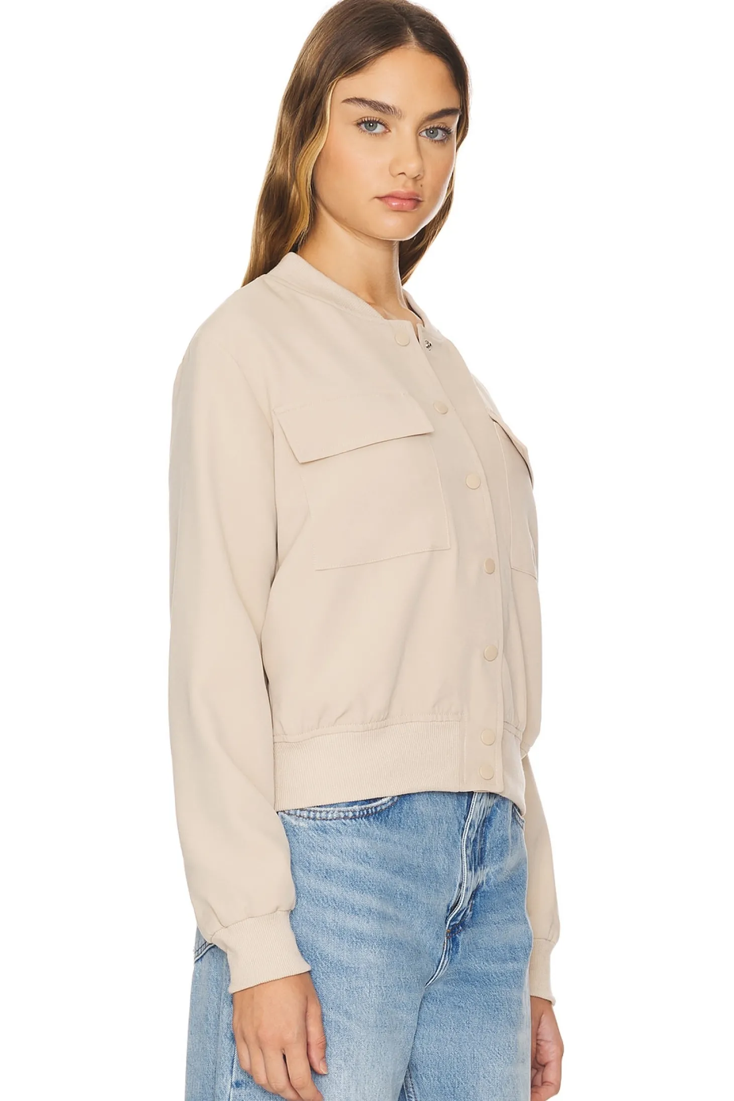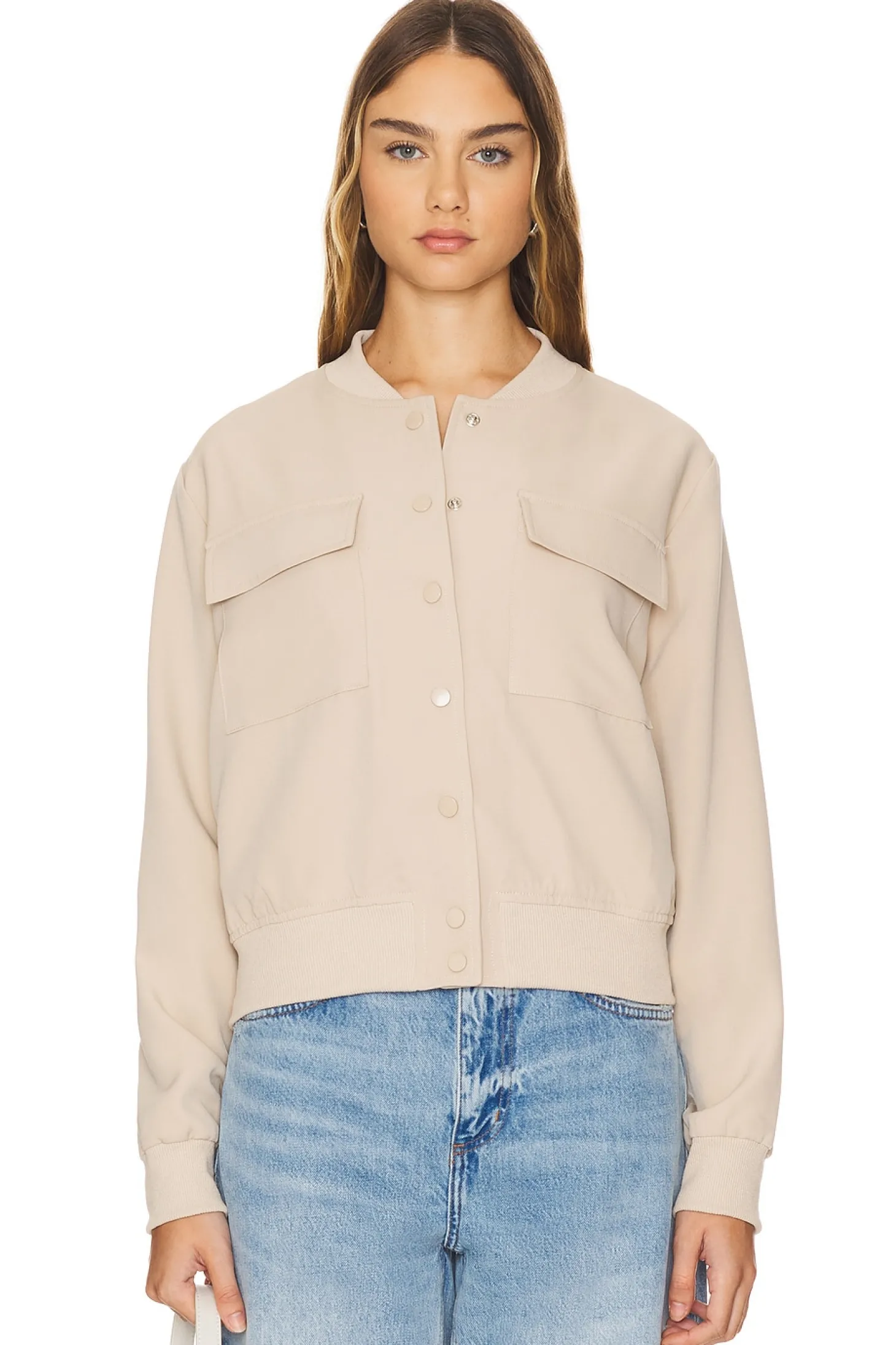 Self: 100% polyester Contrast: 60% cotton 33% polyester 7% spandex Lining: 100% polyester.Made in China.Hand wash cold.Front button closure.Ribbed trim.Breast flap pockets