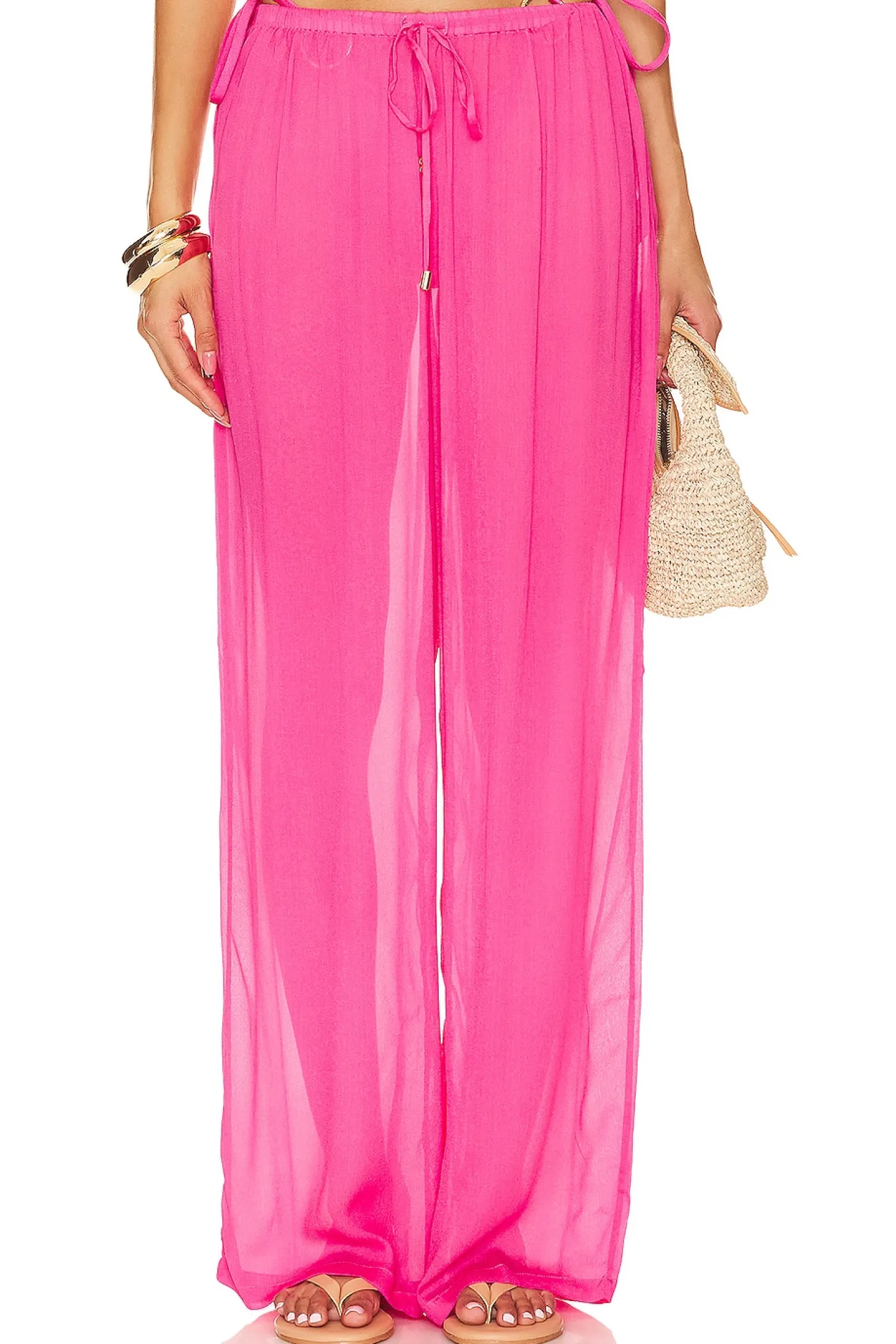 100% viscose.Made in Indonesia.Hand wash.Elastic drawstring waistband.Lightweight crepe fabric.Item not sold as a set.24" at the knee narrows to 20" at the leg opening