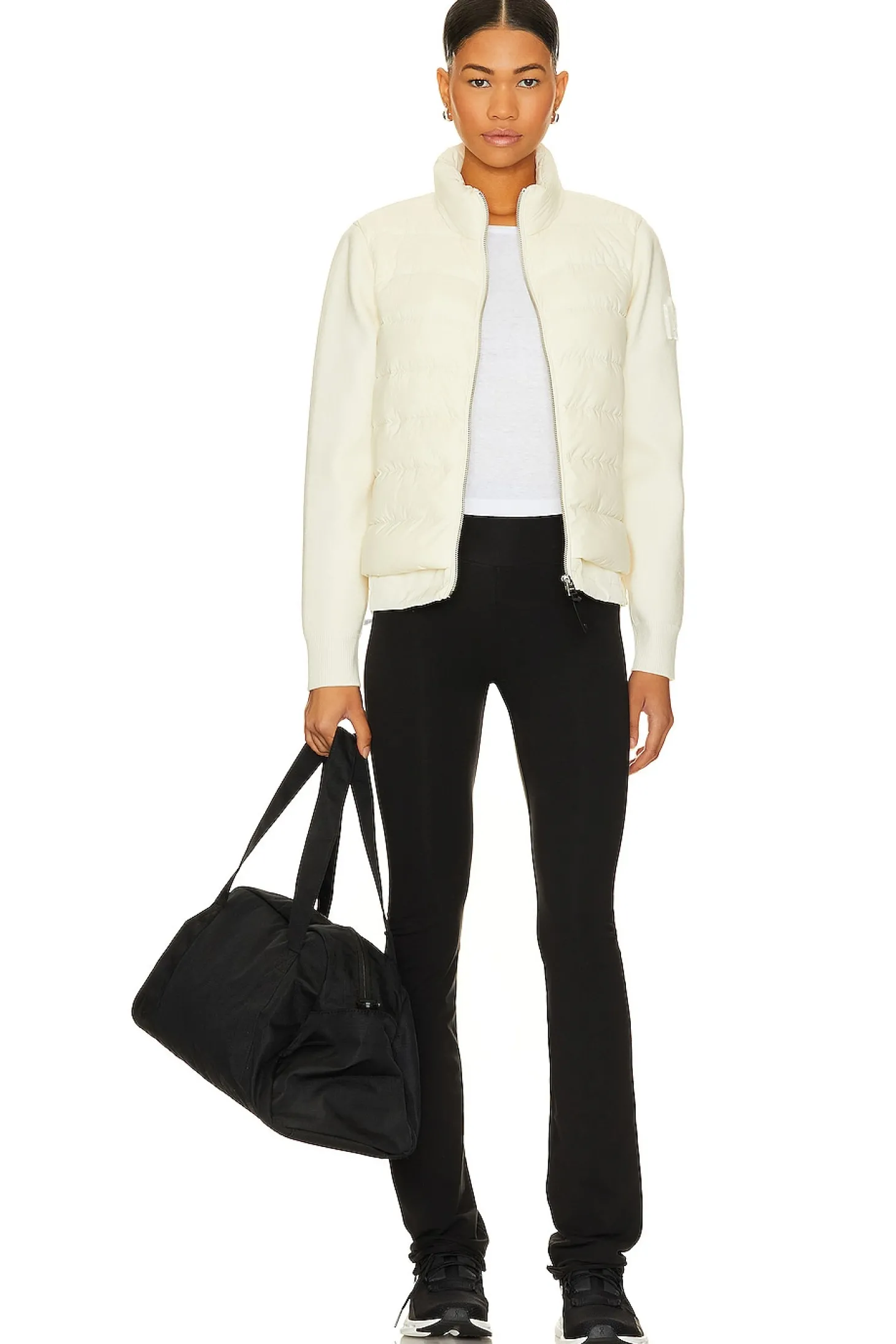 Self: 100% nylon Contrast Fabric: 100% recycled polyester Fill: 90% duck down 10% feathers Sleeves: 42% wool 42% acrylic 14% polyester 2% spandex.Made in China.Dry clean only.Exposed front zipper closure.Side zipper pockets.Puffer style challis fabric with ribbed knit sleeves