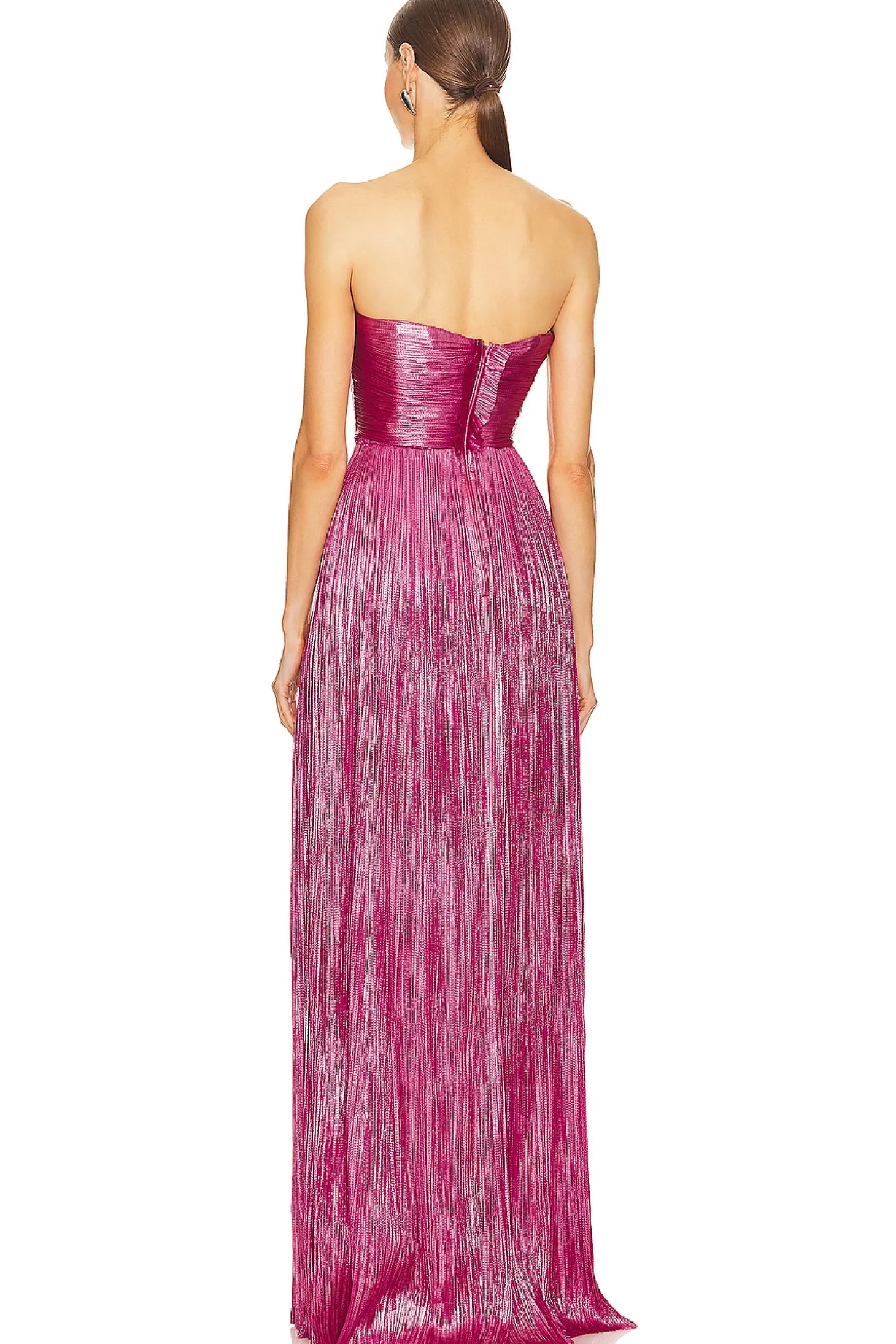Self: 92% nylon, 8% spandex Lining: 100% silk.Made in Romania.Dry clean only.Fully lined Built-in bustier with padded bust and boned bodice.Hidden back zipper closure.Draped fabric at bust.Lightweight metallic chiffon fabric with high side slit.Neckline to hem measures approx 59" in length