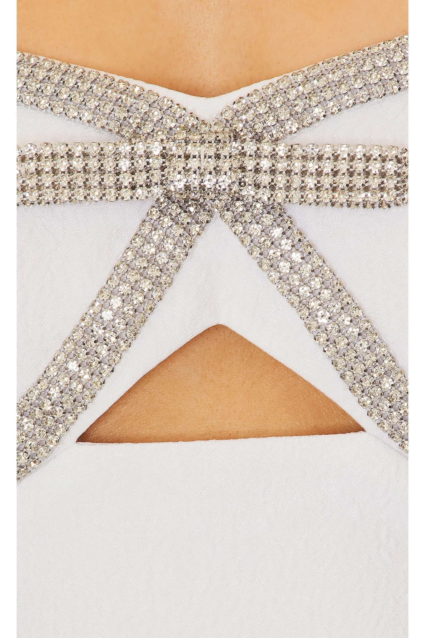 Polyester blend.Imported.Dry clean recommended.Fully lined.Hidden back zipper closure.Off shoulder styling.Bust cut-out Crepe fabric with crystal embellished trim.Neckline to hem measures approx 26" in length