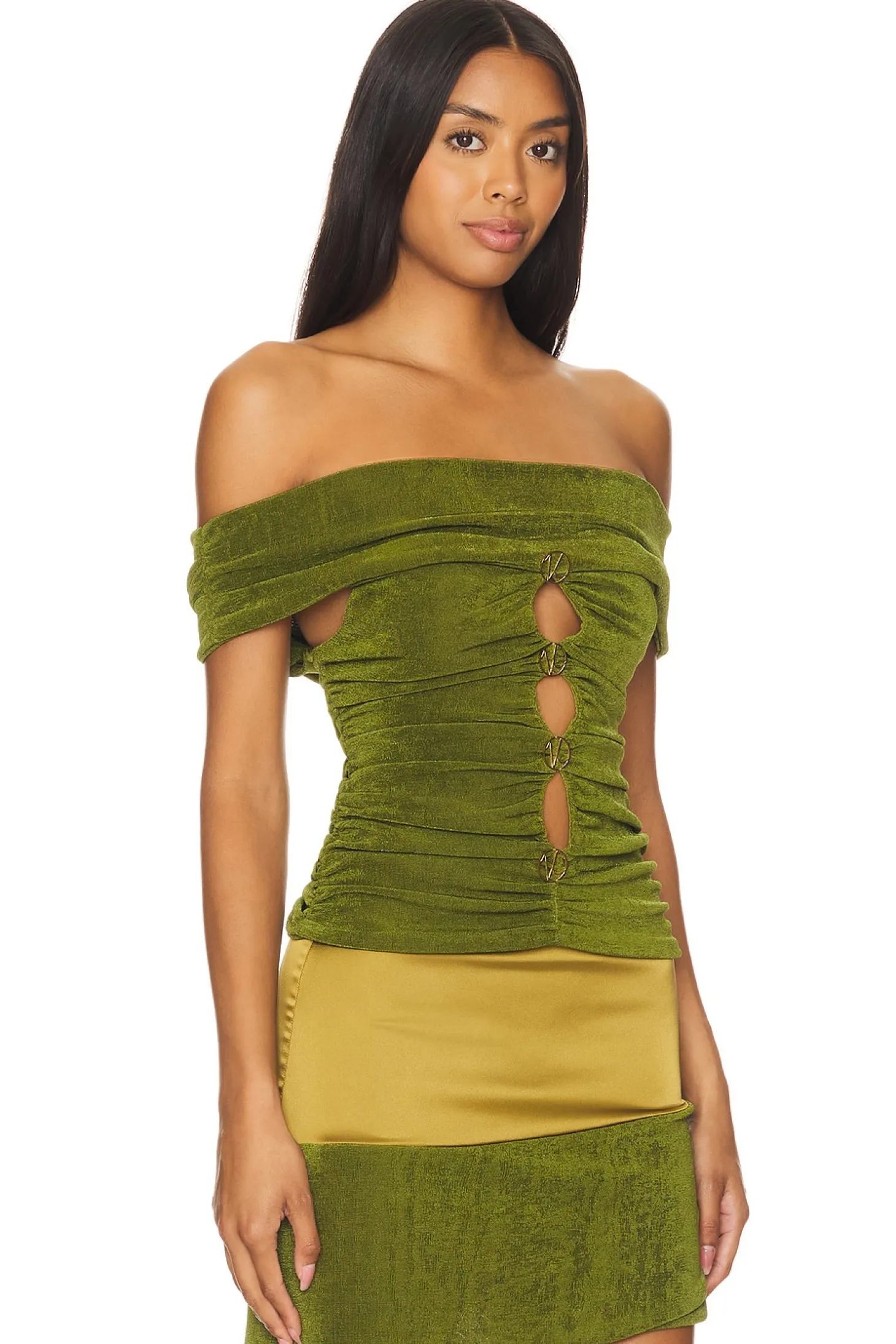 Slinky fabric.Imported.Dry clean recommended.Front cut-outs with gold-tone hardware.Ruched detail.Item not sold as a set