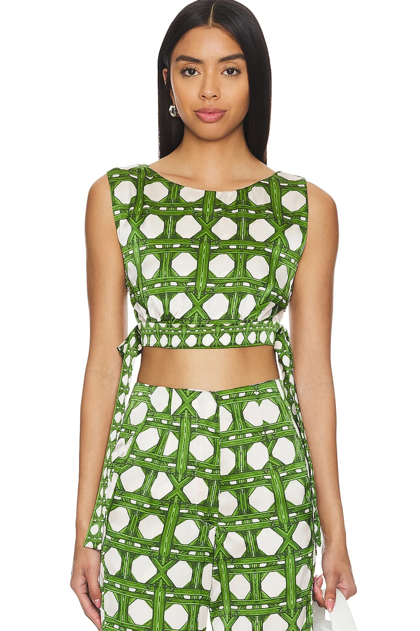 97% cotton 3% spandex.Made in USA.Dry clean only.Side button closures with satin ties.Satin fabric