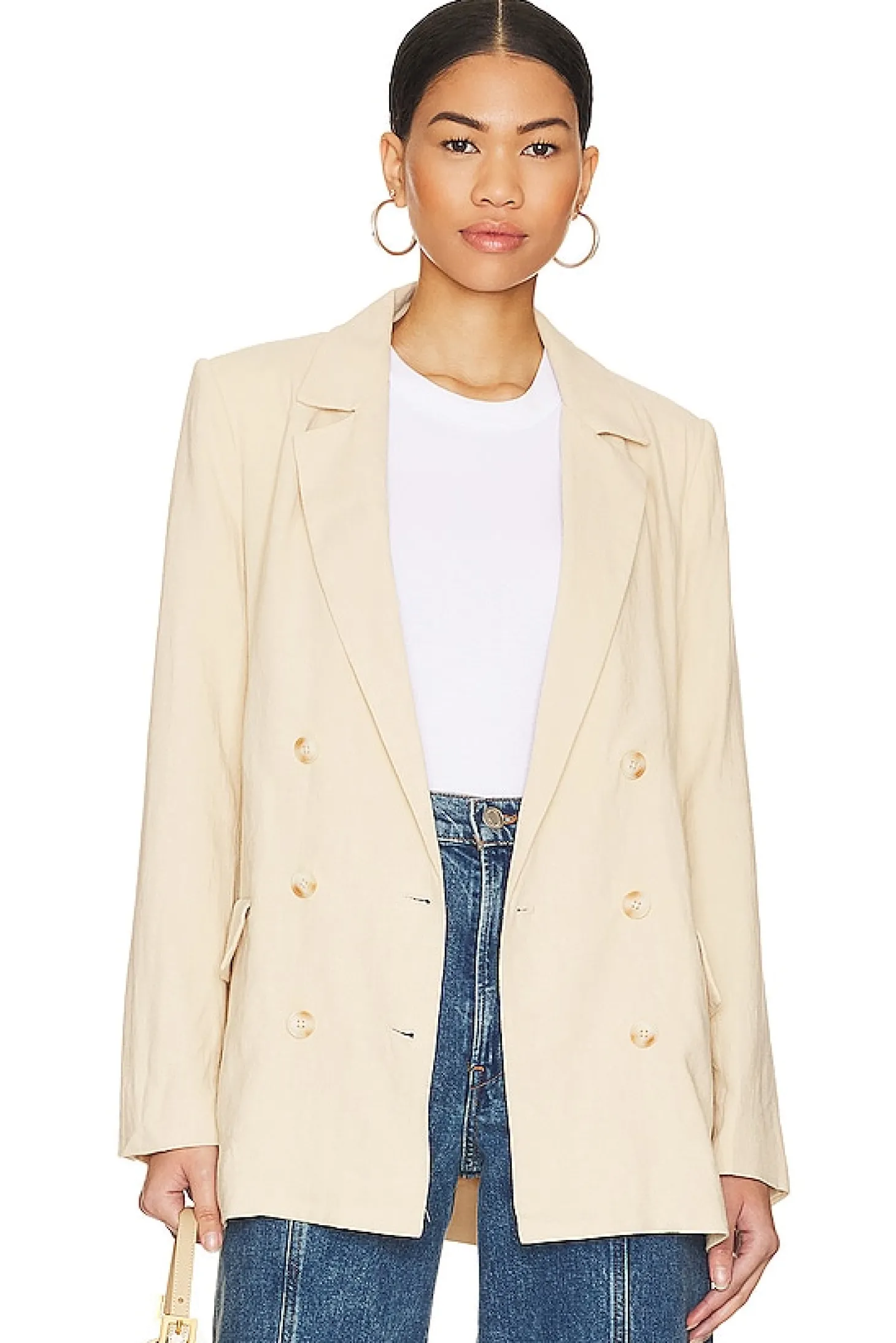 Self: 53% linen 47% viscose Lining: 100% viscose.Made in China.Dry clean only.Front button closure.Padded shoulders.Detachable waist tie.Front faux flap pockets.Buttoned cuffs