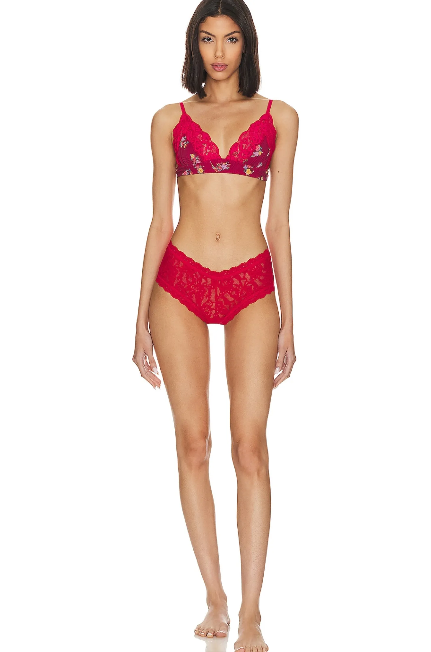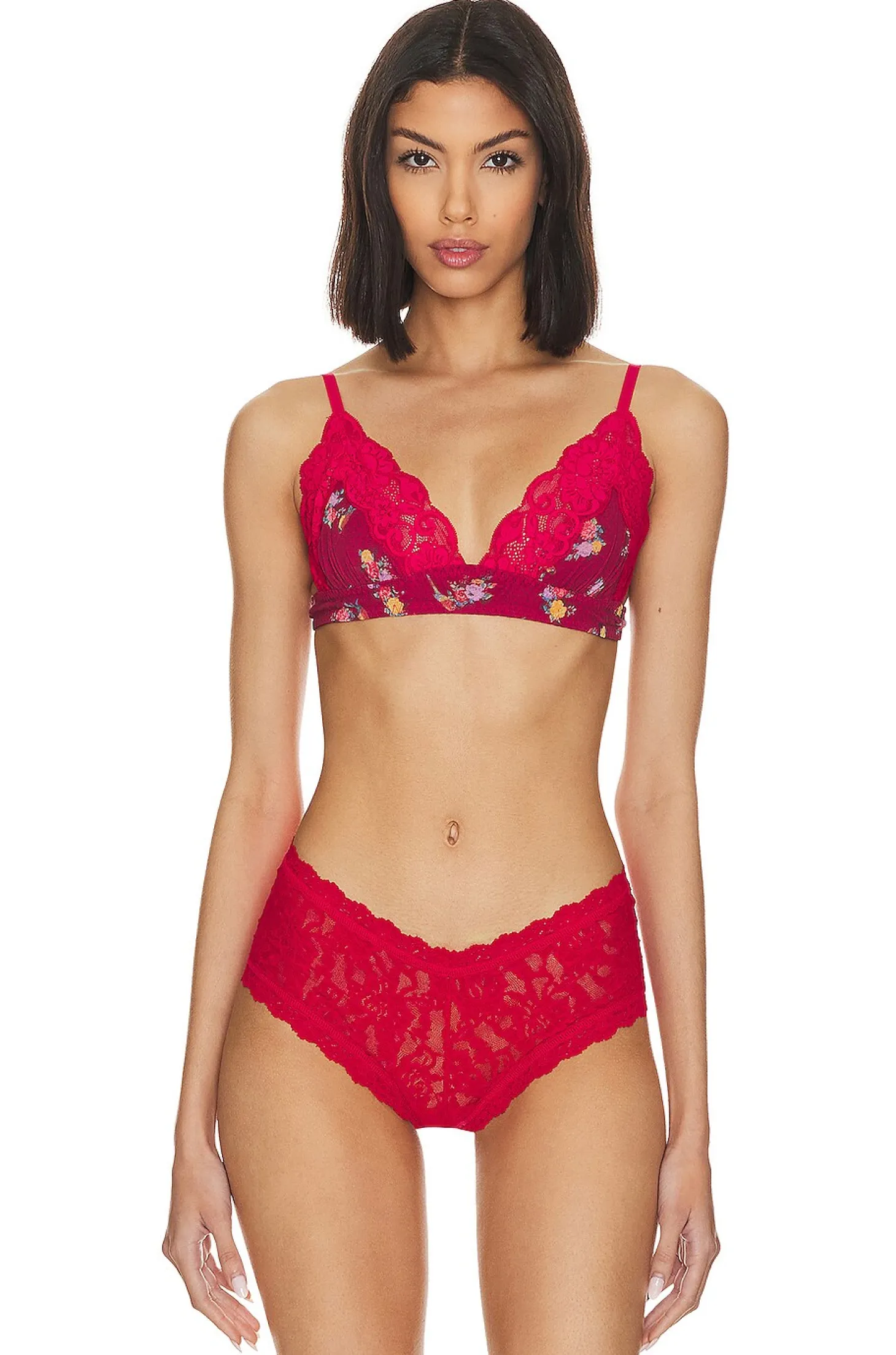 Self: 100% nylon Lace: 88% nylon 12% spandex.Made in China.Machine wash.Unpadded.Back S-hook closure.Delicate lace trim.Item not sold as set