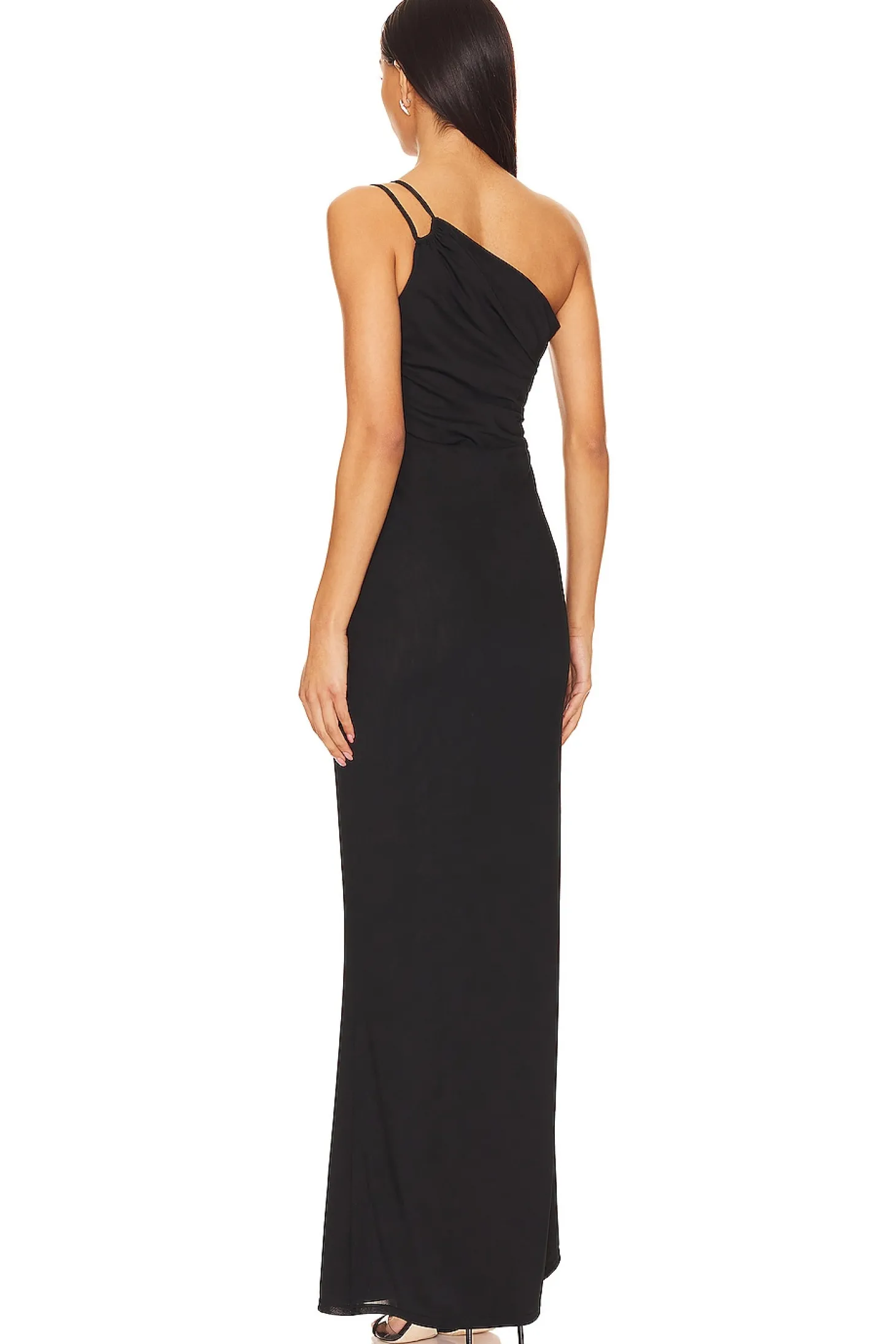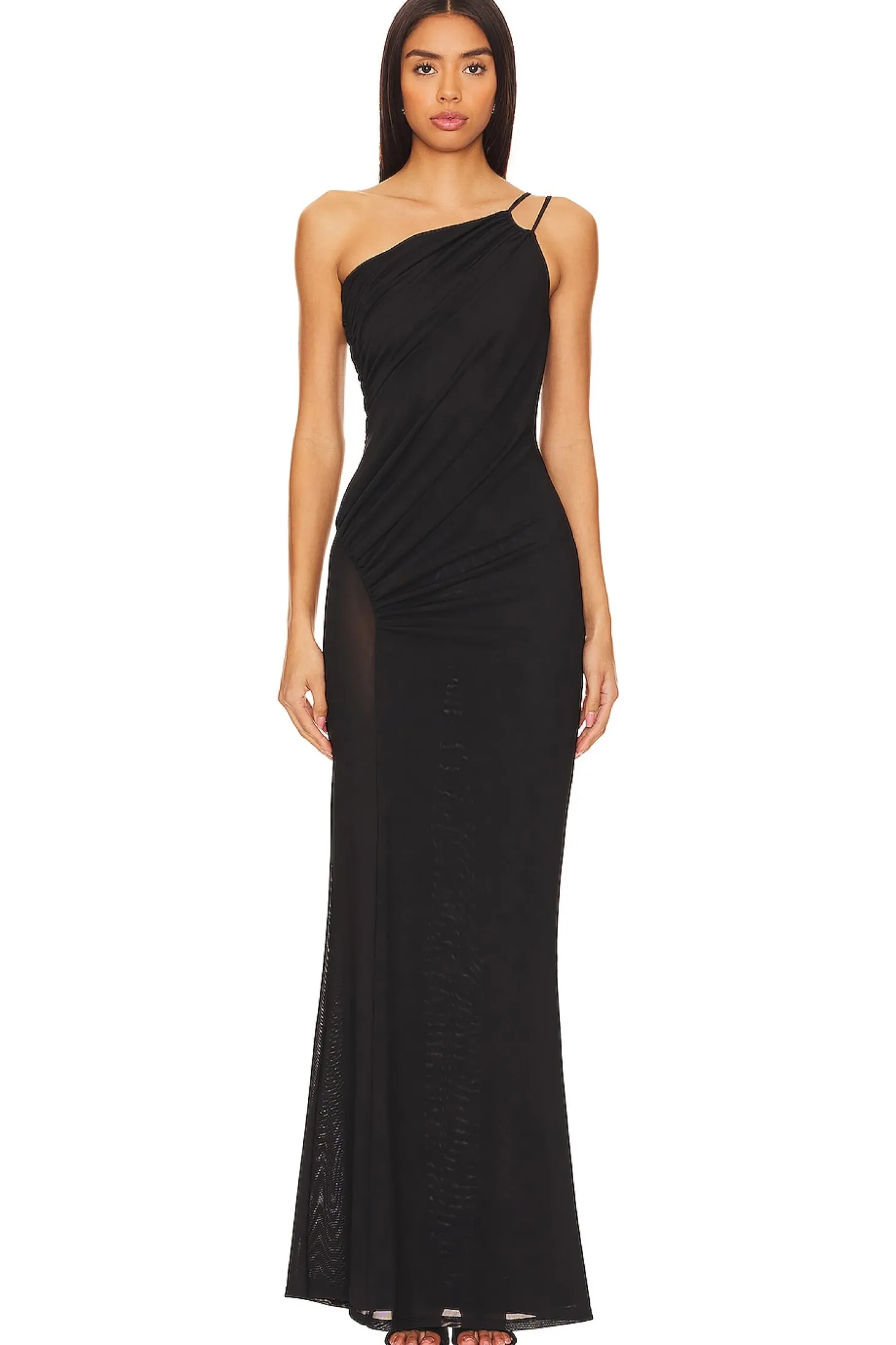 NBD's Osiris Gown in Black: Embrace allure with one-shoulder chic, ruched detailing, and a tantalizing sheer panel. Unleash your sexy sophistication in this statement piece by NBD..100% polyester.Made in China.Dry clean only.Partially lined.Hidden side zipper closure.One shoulder styling Ruched mesh jersey fabric with sheer mesh side panel