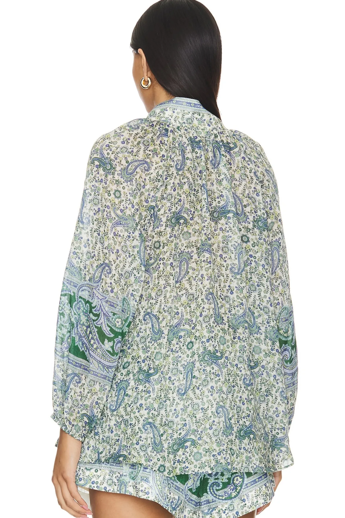 100% ramie.Made in Vietnam.Dry clean only.Front loop button closure.Blouson sleeves with cinched cuffs.Lightweight linen fabric.Item not sold as a set