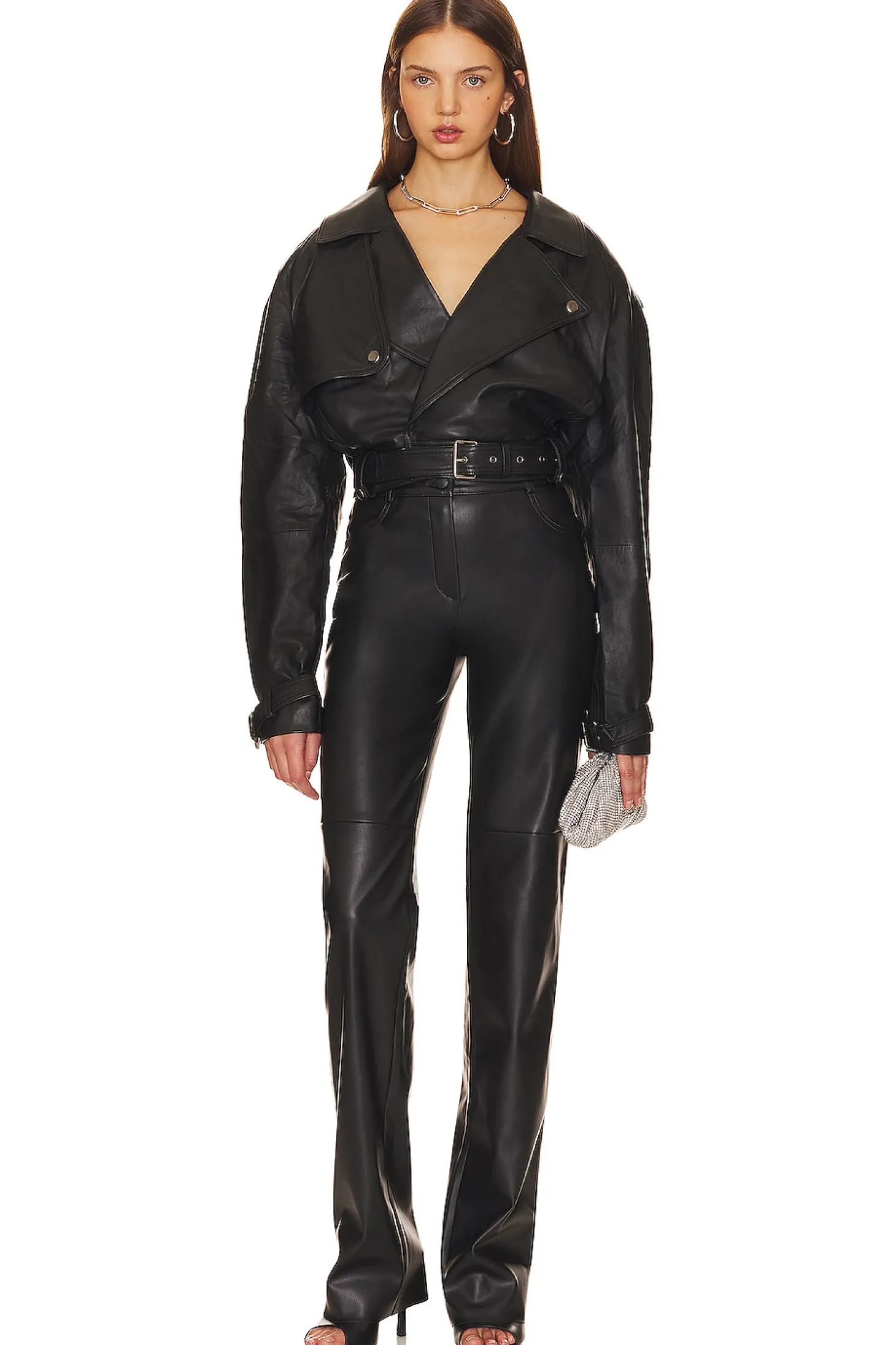 Self: 100% lamb leather Lining: 95% polyester 5% lycra.Made in India.Professional leather clean only.Front attached belt with buckle closure.Surplice neckline.Side seam pockets.Midweight smooth leather fabric
