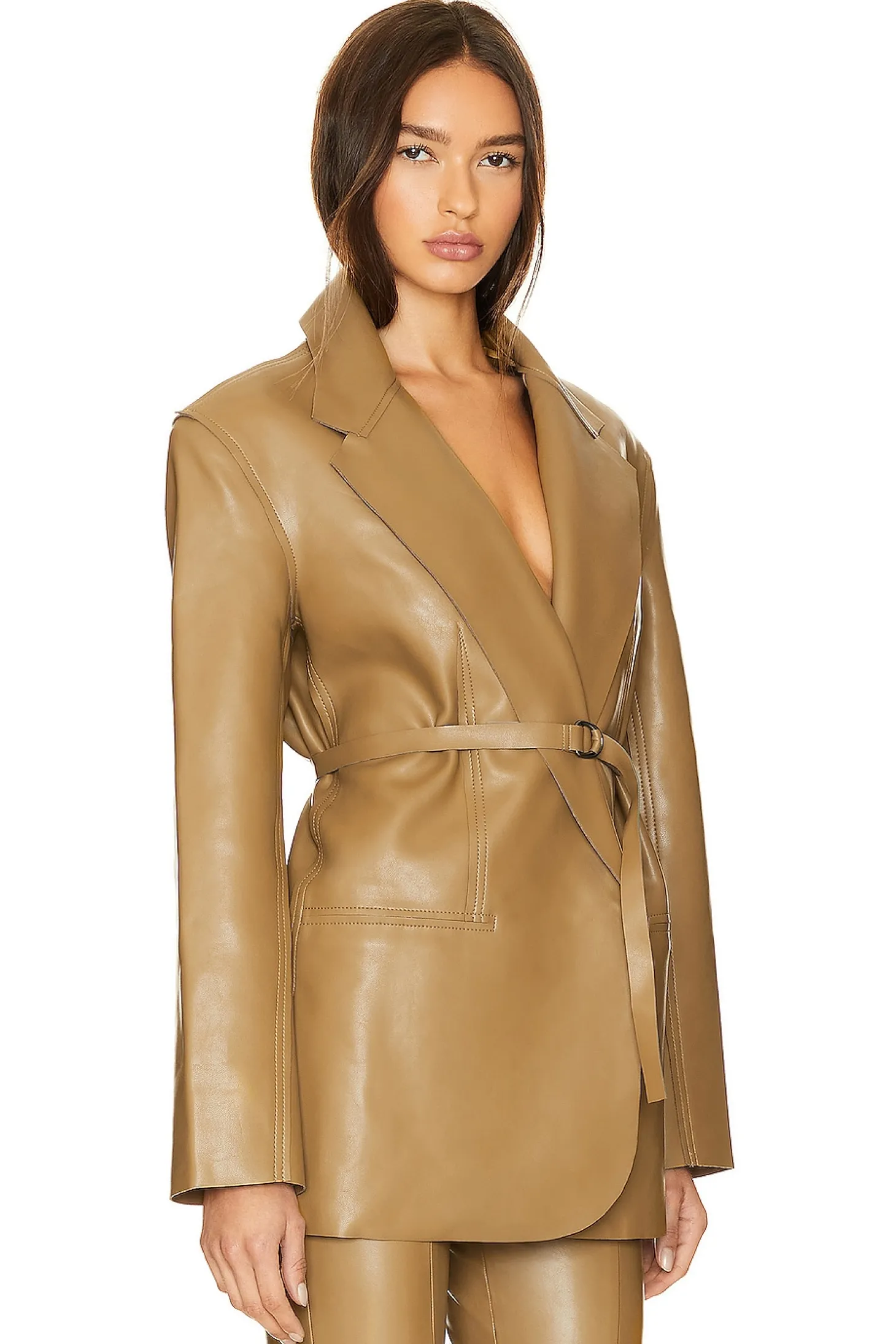 Upgrade your wardrobe with the Norma Kamlai Tan Oversized Single Breasted Jacket. Crafted from smooth faux leather, it features front slip pockets, an open front, and a detachable waist belt for a chic and versatile look.Self: 100% polyurethane Self 2: 90% polyester 10% spandex Self 3: 95% polyester 5% spandex.Made in China.Machine wash.Singular front velcro button with detachable waist belt.Padded shoulders.Front slip pockets.Item not sold as a set.style runs large, size down