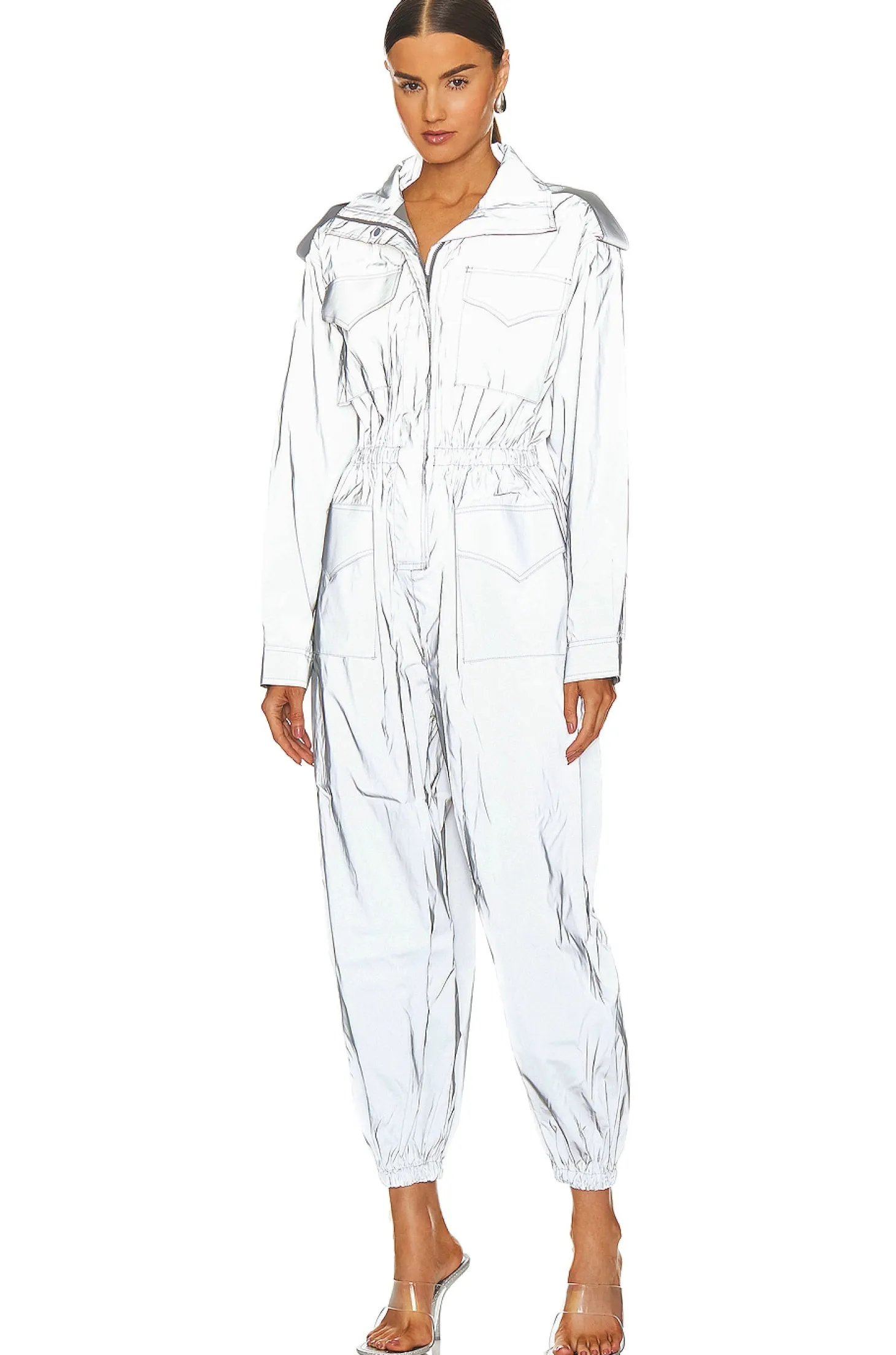 100% polyester.Made in China.Machine wash.Front exposed zipper closure with velcro buttons.Front flap pockets.Elastic waist and hem.Lightweight reflective ripstop fabric.style runs large, size down